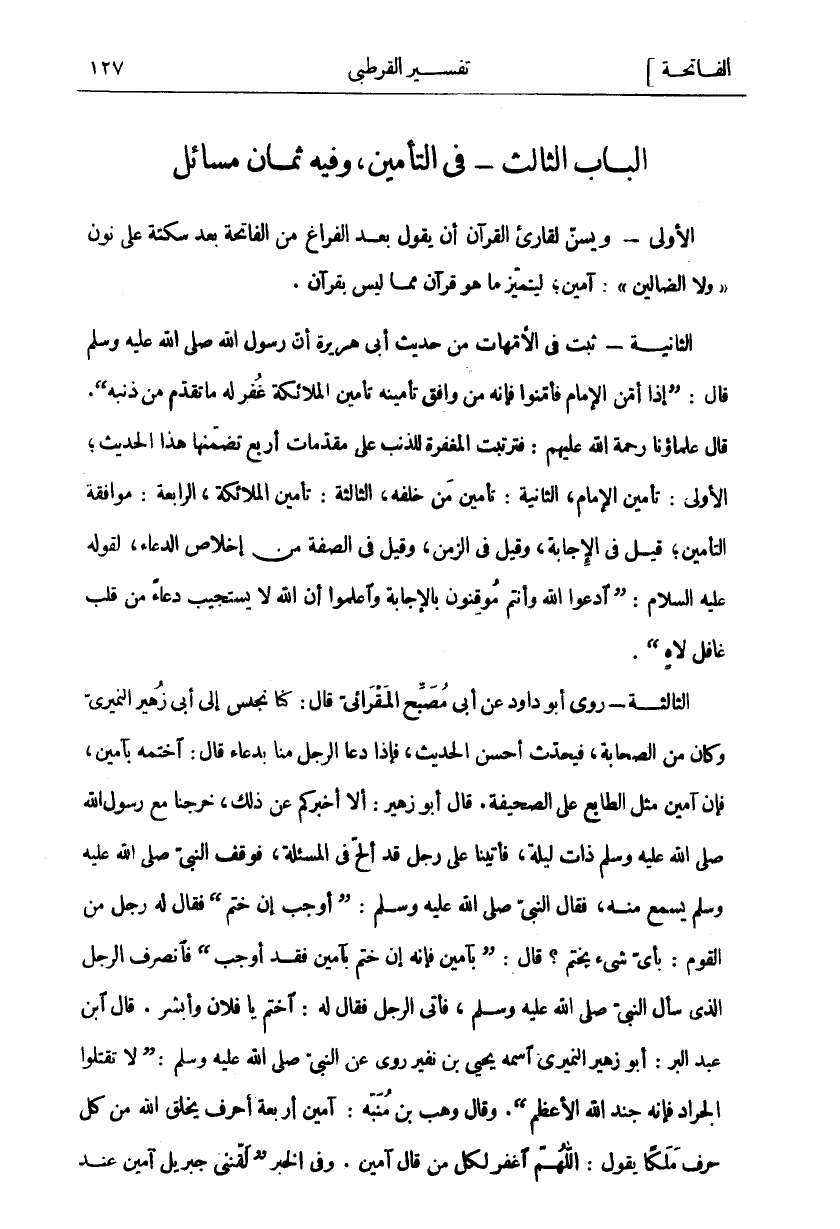 الْأُولَى: وَيُسَنُّ لِقَارِئِ الْقُرْآنِ أَنْ يَقُولُ بَعْدَ الْفَرَاغِ مِنَ الْفَاتِحَةِ بَعْدَ سَكْتَةٍ عَلَى نُونِ" وَلَا الضَّالِّينَ": آمِينَ، لِيَتَمَيَّزَ مَا هُوَ قُرْآنٌ مِمَّا لَيْسَ بِقُرْآنٍ. الثَّانِيَةُ: ثَبَتَ فِي الْأُمَّهَاتِ مِنْ حَدِيثِ أَبِي هُرَيْرَةَ أَنَّ رَسُولَ اللَّهِ صَلَّى اللَّهُ عَلَيْهِ وَسَلَّمَ قال: (إِذَا أَمَّنَ الْإِمَامُ فَأَمِّنُوا فَإِنَّهُ مَنْ وَافَقَ تَأْمِينُهُ تَأْمِينَ الْمَلَائِكَةِ غُفِرَ لَهُ مَا تَقَدَّمَ مِنْ ذَنْبِهِ (. قَالَ عُلَمَاؤُنَا رَحْمَةُ اللَّهِ عَلَيْهِمْ: فَتَرَتَّبَتِ الْمَغْفِرَةُ لِلذَّنْبِ عَلَى مُقَدِّمَاتٍ أَرْبَعٍ تَضَمَّنَهَا هَذَا الْحَدِيثُ، الْأُولَى: تَأْمِينُ الْإِمَامِ، الثَّانِيَةُ: تَأْمِينُ مَنْ خَلْفَهُ، الثَّالِثَةُ: تَأْمِينُ الْمَلَائِكَةِ، الرَّابِعَةُ: مُوَافَقَةُ التَّأْمِينِ، قِيلَ فِي الْإِجَابَةِ، وَقِيلَ فِي الزَّمَنِ، وَقِيلَ فِي الصِّفَةِ مِنْ إِخْلَاصِ الدُّعَاءِ، لِقَوْلِهِ عَلَيْهِ السَّلَامُ: (ادْعُوا اللَّهَ وَأَنْتُمْ مُوقِنُونَ بِالْإِجَابَةِ وَاعْلَمُوا أَنَّ اللَّهَ لَا يَسْتَجِيبُ دُعَاءً مِنْ قَلْبِ غَافِلٍ لَاهٍ). الثَّالِثَةُ رَوَى أَبُو دَاوُدَ عَنْ أَبِي مُصَبِّحٍ الْمُقْرَائِيِّ قَالَ: كُنَّا نَجْلِسُ إِلَى أَبِي زُهَيْرٍ النُّمَيْرِيِّ وَكَانَ مِنَ الصَّحَابَةِ، فَيُحَدِّثُ أَحْسَنَ الْحَدِيثِ، فَإِذَا دَعَا الرَّجُلُ مِنَّا بِدُعَاءٍ قَالَ: اخْتِمْهُ بِآمِينَ، فَإِنَّ آمِينَ مِثْلَ الطَّابَعِ عَلَى الصَّحِيفَةِ. قَالَ أَبُو زُهَيْرٍ: أَلَا أُخْبِرُكُمْ عَنْ ذَلِكَ، خَرَجْنَا مَعَ رَسُولِ اللَّهِ صَلَّى اللَّهُ عَلَيْهِ وَسَلَّمَ ذَاتَ لَيْلَةٍ، فَأَتَيْنَا عَلَى رَجُلٍ قَدْ أَلَحَّ فِي الْمَسْأَلَةِ، فَوَقَفَ النَّبِيُّ صَلَّى اللَّهُ عَلَيْهِ وَسَلَّمَ يَسْمَعُ مِنْهُ، فَقَالَ النَّبِيُّ صَلَّى اللَّهُ عَلَيْهِ وَسَلَّمَ: (أَوْجَبَ إِنْ خَتَمَ) فَقَالَ لَهُ رَجُلٌ مِنَ الْقَوْمِ: بأي شي يختم؟ قال: (بآمين فإنه خَتَمَ بِآمِينَ فَقَدْ أَوْجَبَ) فَانْصَرَفَ الرَّجُلُ الَّذِي سَأَلَ النَّبِيَّ صَلَّى اللَّهُ عَلَيْهِ وَسَلَّمَ، فَأَتَى الرَّجُلَ فَقَالَ لَهُ: اخْتِمْ يَا فُلَانُ وَأَبْشِرْ. قَالَ ابْنُ عَبْدِ الْبَرِّ: أَبُو زُهَيْرٍ النُّمَيْرِيُّ اسْمُهُ يَحْيَى بْنُ نُفَيْرٍ رَوَى عَنِ النَّبِيِّ صَلَّى اللَّهُ عَلَيْهِ وَسَلَّمَ: (لَا تَقْتُلُوا الْجَرَادَ فَإِنَّهُ جُنْدُ اللَّهِ الْأَعْظَمُ). وَقَالَ وَهْبُ بْنُ مُنَبِّهٍ: آمِينَ أَرْبَعَةُ أَحْرُفٍ يَخْلُقُ اللَّهُ مِنْ كل حرف ملكا يقول: اللهم اغفر مَنْ قَالَ آمِينَ. وَفِي الْخَبَرِ (لَقَّنَنِي جِبْرِيلُ آمين عند