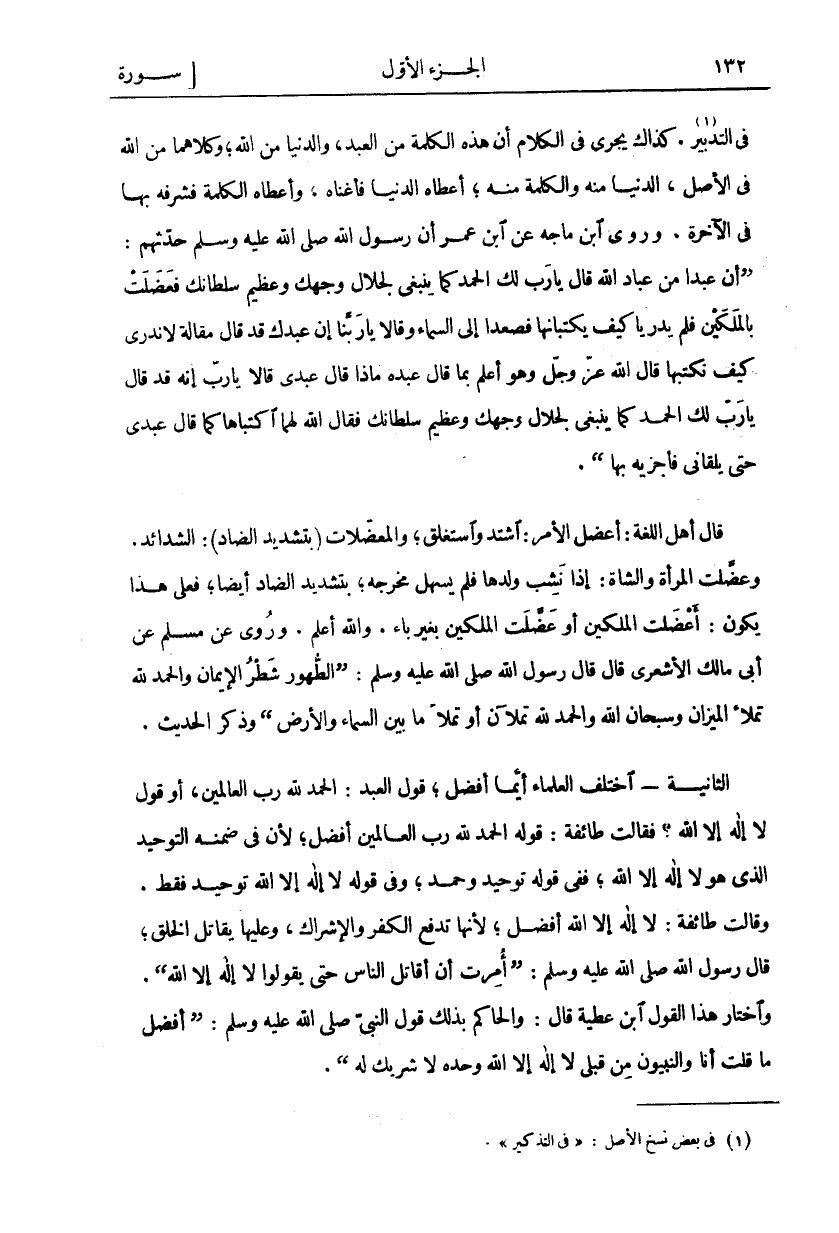 فِي التَّدْبِيرِ «١». كَذَاكَ يَجْرِي فِي الْكَلَامِ أَنَّ هَذِهِ الْكَلِمَةَ مِنَ الْعَبْدِ، وَالدُّنْيَا مِنَ اللَّهِ، وَكِلَاهُمَا مِنَ اللَّهِ فِي الْأَصْلِ، الدُّنْيَا مِنْهُ وَالْكَلِمَةُ مِنْهُ، أَعْطَاهُ الدُّنْيَا فَأَغْنَاهُ، وَأَعْطَاهُ الْكَلِمَةَ فَشَرَّفَهُ بِهَا فِي الْآخِرَةِ. وَرَوَى ابْنُ مَاجَهْ عَنِ ابْنِ عُمَرَ أَنَّ رَسُولَ اللَّهِ صَلَّى اللَّهُ عَلَيْهِ وَسَلَّمَ حَدَّثَهُمْ: (أَنَّ عَبْدًا مِنْ عِبَادِ اللَّهِ قَالَ يَا رَبِّ لَكَ الْحَمْدُ كَمَا يَنْبَغِي لِجَلَالِ وَجْهِكَ وَعَظِيمِ سُلْطَانِكَ فَعَضَلَتْ بِالْمَلَكَيْنِ فَلَمْ يَدْرِيَا كَيْفَ يَكْتُبَانِهَا فَصَعِدَا إِلَى السَّمَاءِ وَقَالَا يَا رَبَّنَا إِنَّ عَبْدَكَ قَدْ قَالَ مَقَالَةً لَا نَدْرِي كَيْفَ نَكْتُبُهَا قَالَ اللَّهُ عَزَّ وَجَلَّ وَهُوَ أَعْلَمُ بِمَا قَالَ عَبْدُهُ مَاذَا قَالَ عَبْدِي قَالَا يَا رَبِّ إِنَّهُ قَدْ قَالَ يَا رَبِّ لَكَ الْحَمْدُ كَمَا يَنْبَغِي لِجَلَالِ وَجْهِكَ وَعَظِيمِ سُلْطَانِكَ فَقَالَ اللَّهُ لَهُمَا اكْتُبَاهَا كَمَا قَالَ عَبْدِي حَتَّى يَلْقَانِي فَأَجْزَيهُ بِهَا (. قَالَ أَهْلُ اللُّغَةِ: أَعْضَلَ الْأَمْرُ: اشْتَدَّ وَاسْتَغْلَقَ، وَالْمُعَضِّلَاتُ (بِتَشْدِيدِ الضَّادِ): الشَّدَائِدُ. وَعَضَّلَتِ الْمَرْأَةُ وَالشَّاةُ: إِذَا نَشِبَ وَلَدُهَا فَلَمْ يَسْهُلْ مَخْرَجُهُ، بِتَشْدِيدِ الضَّادِ أَيْضًا، فَعَلَى هَذَا يَكُونُ: أَعْضَلَتِ الْمَلَكَيْنِ أَوْ عَضَّلَتِ الْمُلْكَيْنِ بِغَيْرِ بَاءٍ. وَاللَّهُ أَعْلَمُ. وَرُوِيَ عَنْ مُسْلِمٍ عَنْ أَبِي مَالِكٍ الْأَشْعَرِيِّ قَالَ قَالَ رَسُولُ اللَّهِ صَلَّى اللَّهُ عَلَيْهِ وَسَلَّمَ: (الطُّهُورُ شَطْرُ الْإِيمَانِ وَالْحَمْدُ لِلَّهِ تَمْلَأُ الْمِيزَانَ وَسُبْحَانَ اللَّهِ وَالْحَمْدُ لِلَّهِ تَمْلَآنِ أَوْ تَمْلَأُ مَا بَيْنَ السَّمَاءِ وَالْأَرْضِ) وَذَكَرَ الْحَدِيثَ. الثَّانِيَةُ اخْتَلَفَ الْعُلَمَاءُ أَيُّمَا أَفْضَلُ، قَوْلُ الْعَبْدِ: الْحَمْدُ لِلَّهِ رَبِّ الْعَالَمِينَ، أَوْ قَوْلُ لَا إِلَهَ إِلَّا اللَّهُ؟ فَقَالَتْ طَائِفَةٌ: قَوْلُهُ الْحَمْدُ لِلَّهِ رَبِّ الْعَالَمِينَ أَفْضَلُ، لِأَنَّ فِي ضِمْنِهِ التَّوْحِيدَ الَّذِي هُوَ لَا إِلَهَ إِلَّا اللَّهُ، فَفِي قَوْلِهِ تَوْحِيدٌ وَحَمْدٌ، وَفِي قَوْلِهِ لَا إِلَهَ إِلَّا اللَّهُ تَوْحِيدٌ فَقَطْ. وَقَالَتْ طَائِفَةٌ: لَا إِلَهَ إِلَّا اللَّهُ أَفْضَلُ، لِأَنَّهَا تَدْفَعُ الْكُفْرَ وَالْإِشْرَاكَ، وَعَلَيْهَا يُقَاتَلُ الْخَلْقُ، قَالَ رَسُولُ اللَّهِ صَلَّى اللَّهُ عَلَيْهِ وَسَلَّمَ: (أُمِرْتُ أَنْ أُقَاتِلَ النَّاسَ حَتَّى يَقُولُوا لَا إِلَهَ إِلَّا اللَّهُ). وَاخْتَارَ هَذَا الْقَوْلَ ابْنُ عَطِيَّةَ قَالَ: وَالْحَاكِمُ بِذَلِكَ قَوْلُ النَّبِيِّ صَلَّى اللَّهُ عَلَيْهِ وَسَلَّمَ: (أَفْضَلُ مَا قُلْتُ أَنَا وَالنَّبِيُّونَ مِنْ قَبْلِي لَا إِلَهَ إِلَّا اللَّهُ وَحْدَهُ لَا شَرِيكَ له).