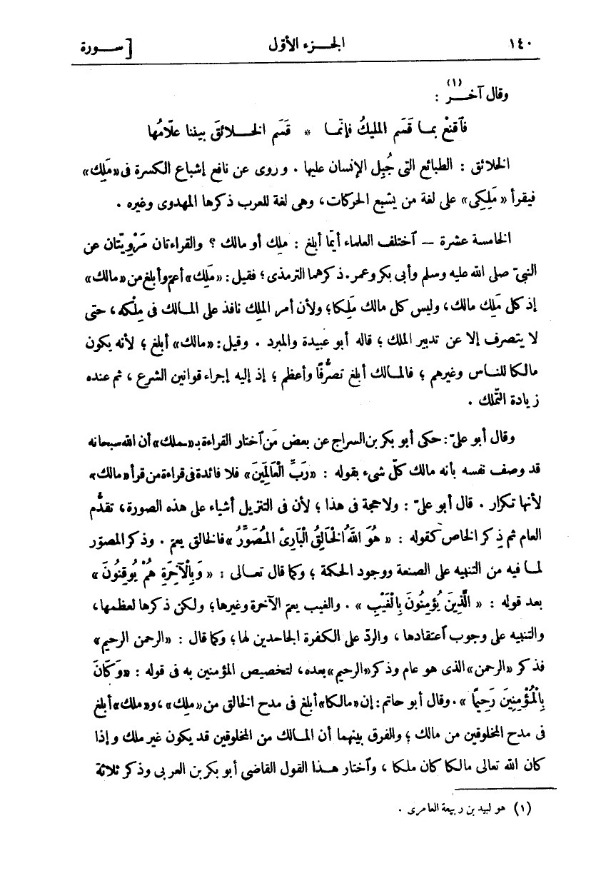 الْخَلَائِقُ: الطَّبَائِعُ الَّتِي جُبِلَ الْإِنْسَانُ عَلَيْهَا. وَرُوِيَ عَنْ نَافِعٍ إِشْبَاعُ الْكِسْرَةِ فِي" مَلِكِ" فَيَقْرَأُ" مَلِكِي" عَلَى لُغَةِ مَنْ يُشْبِعُ الْحَرَكَاتِ، وَهِيَ لُغَةٌ لِلْعَرَبِ ذَكَرَهَا المهدوي وغيره. الخامسة عشرة اخْتَلَفَ الْعُلَمَاءُ أَيُّمَا أَبْلَغُ: مَلِكٌ أَوْ مَالِكٌ؟ وَالْقِرَاءَتَانِ مَرْوِيَّتَانِ عَنِ النَّبِيِّ صَلَّى اللَّهُ عَلَيْهِ وَسَلَّمَ وَأَبِي بَكْرٍ وَعُمَرَ. ذَكَرَهُمَا التِّرْمِذِيُّ، فَقِيلَ:" مَلِكِ" أَعَمُّ وَأَبْلَغُ مِنْ" مالِكِ" إِذْ كُلُّ مَلِكٍ مَالِكٌ، وَلَيْسَ كُلُّ مَالِكٍ مَلِكًا، وَلِأَنَّ أمر الْمَلِكَ نَافِذٌ عَلَى الْمَالِكِ فِي مُلْكِهِ، حَتَّى لَا يَتَصَرَّفَ إِلَّا عَنْ تَدْبِيرِ الْمَلِكِ، قَالَ أَبُو عُبَيْدَةَ وَالْمُبَرِّدُ. وَقِيلَ:" مالِكِ" أَبْلَغُ، لِأَنَّهُ يَكُونُ مَالِكًا لِلنَّاسِ وَغَيْرِهِمْ، فَالْمَالِكُ أَبْلَغُ تَصَرُّفًا وَأَعْظَمُ، إِذْ إِلَيْهِ إِجْرَاءُ قَوَانِينِ الشَّرْعِ، ثُمَّ عِنْدَهُ زِيَادَةُ التَّمَلُّكِ. وَقَالَ أَبُو عَلِيٍّ: حَكَى أَبُو بَكْرِ بْنُ السَّرَّاجِ عَنْ بَعْضِ مَنِ اختار القراءة ب" ملك" أَنَّ اللَّهَ سُبْحَانَهُ قَدْ وَصَفَ نَفْسَهُ بِأَنَّهُ مالك كل شي بقوله:" رَبِّ الْعالَمِينَ" فَلَا فَائِدَةَ فِي قِرَاءَةِ مَنْ قَرَأَ" مالِكِ" لِأَنَّهَا تَكْرَارٌ. قَالَ أَبُو عَلِيٍّ: وَلَا حُجَّةَ فِي هَذَا، لِأَنَّ فِي التَّنْزِيلِ أَشْيَاءٌ عَلَى هَذِهِ الصُّورَةِ، تَقَدَّمَ الْعَامُّ ثُمَّ ذُكِرَ الْخَاصُّ كَقَوْلِهِ:" هُوَ اللَّهُ الْخالِقُ الْبارِئُ الْمُصَوِّرُ" فَالْخَالِقُ يَعُمُّ. وَذَكَرَ الْمُصَوِّرُ لِمَا فِيهِ مِنَ التَّنْبِيهِ عَلَى الصَّنْعَةِ وَوُجُودِ الْحِكْمَةِ، وَكَمَا قَالَ تَعَالَى:" وَبِالْآخِرَةِ هُمْ يُوقِنُونَ" بَعْدَ قَوْلِهِ:" الَّذِينَ يُؤْمِنُونَ بِالْغَيْبِ". وَالْغَيْبُ يَعُمُّ الْآخِرَةَ وَغَيْرَهَا، وَلَكِنْ ذَكَرَهَا لِعِظَمِهَا، وَالتَّنْبِيهِ عَلَى وُجُوبِ اعْتِقَادِهَا، وَالرَّدِّ عَلَى الْكَفَرَةِ الْجَاحِدِينَ لَهَا، وَكَمَا قَالَ:" الرَّحْمنِ الرَّحِيمِ" فَذَكَرَ" الرَّحْمنِ" الَّذِي هُوَ عَامٌّ وَذَكَرَ" الرَّحِيمِ" بَعْدَهُ، لِتَخْصِيصِ الْمُؤْمِنِينَ بِهِ فِي قَوْلِهِ:" وَكانَ بِالْمُؤْمِنِينَ رَحِيماً". وَقَالَ أَبُو حَاتِمٍ: إِنَّ مَالِكًا أَبْلَغُ فِي مَدْحِ الْخَالِقِ مِنْ" مَلِكِ"، وَ" مَلِكِ" أَبْلَغَ فِي مَدْحِ الْمَخْلُوقِينَ مِنْ مَالِكِ، وَالْفَرْقُ بَيْنَهُمَا أَنَّ الْمَالِكَ مِنَ الْمَخْلُوقِينَ قَدْ يَكُونُ غَيْرَ مَلِكٍ وَإِذَا كَانَ اللَّهُ تَعَالَى مَالِكًا كَانَ مَلِكًا، وَاخْتَارَ هَذَا الْقَوْلَ الْقَاضِي أَبُو بَكْرِ بْنُ الْعَرَبِيِّ وَذَكَرَ ثلاثة