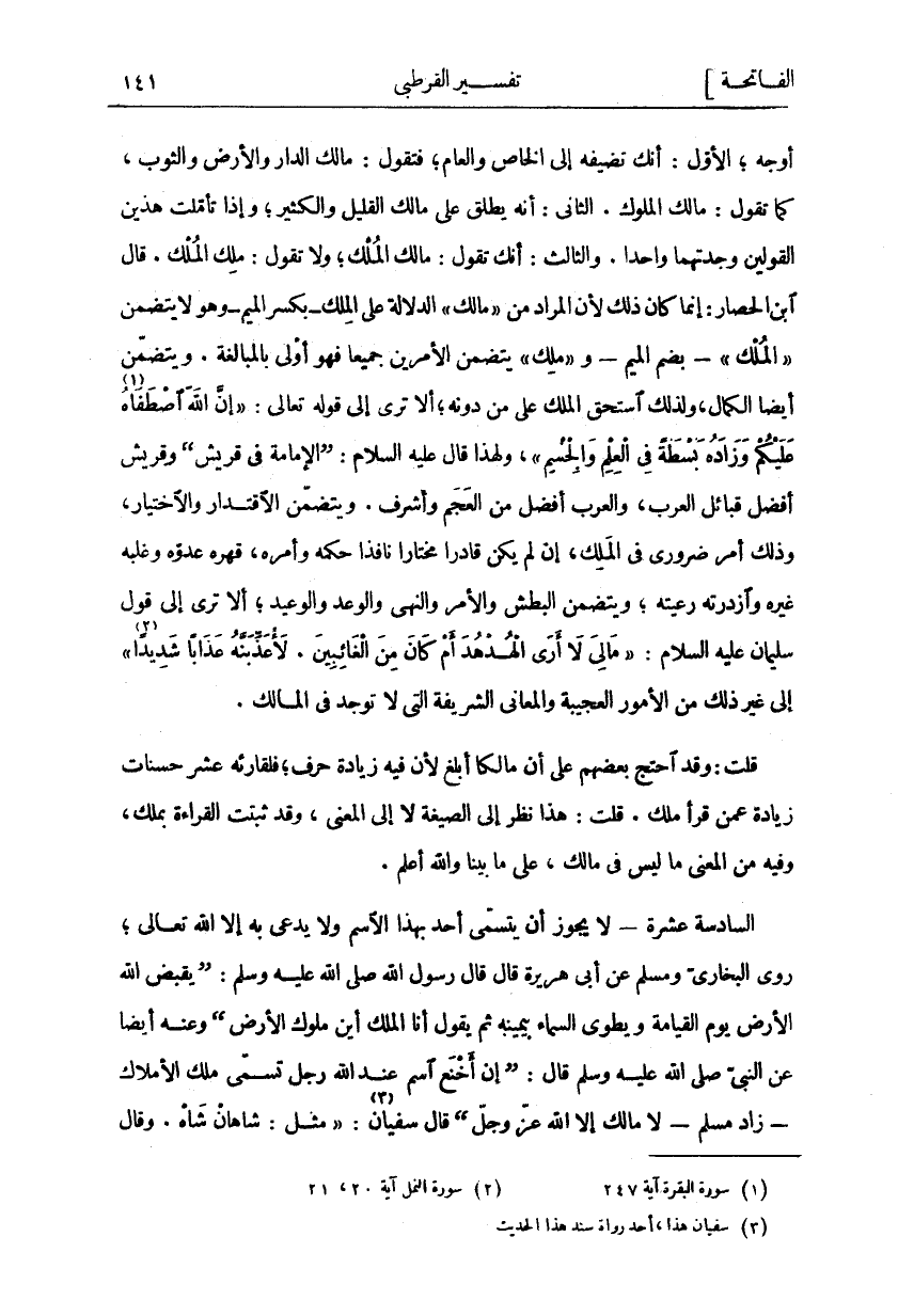 أَوْجُهٍ، الْأَوَّلُ: أَنَّكَ تُضِيفُهُ إِلَى الْخَاصِّ وَالْعَامِّ، فَتَقُولُ: مَالِكُ الدَّارِ وَالْأَرْضِ وَالثَّوْبِ، كَمَا تَقُولُ: مَالِكُ الْمُلُوكِ. الثَّانِي: أَنَّهُ يُطْلَقُ عَلَى مَالِكِ الْقَلِيلِ وَالْكَثِيرِ، وَإِذَا تَأَمَّلْتَ هَذَيْنَ الْقَوْلَيْنِ وَجَدْتَهُمَا وَاحِدًا. وَالثَّالِثُ: أَنَّكَ تَقُولُ: مَالِكُ الْمُلْكِ، وَلَا تَقُولُ: مَلِكُ الْمُلْكِ. قَالَ ابْنُ الْحَصَّارِ: إِنَّمَا كَانَ ذَلِكَ لِأَنَّ الْمُرَادَ مِنْ" مالِكِ" الدَّلَالَةُ عَلَى الْمِلْكِ بِكَسْرِ الْمِيمِ وَهُوَ لَا يَتَضَمَّنُ" الْمُلْكَ" بِضَمِّ الْمِيمِ وَ" مِلْكُ" يَتَضَمَّنُ الْأَمْرَيْنِ جَمِيعًا فَهُوَ أَوْلَى بِالْمُبَالَغَةِ. وَيَتَضَمَّنُ أَيْضًا الْكَمَالَ، وَلِذَلِكَ اسْتَحَقَّ الْمُلْكَ عَلَى مَنْ دُونَهُ، أَلَا تَرَى إِلَى قَوْلِهِ تَعَالَى:" إِنَّ اللَّهَ اصْطَفاهُ «١» عَلَيْكُمْ وَزادَهُ بَسْطَةً فِي الْعِلْمِ وَالْجِسْمِ"، وَلِهَذَا قَالَ عَلَيْهِ السَّلَامُ: (الْإِمَامَةُ فِي قُرَيْشٍ) وَقُرَيْشٌ أَفْضَلُ قَبَائِلِ الْعَرَبِ، وَالْعَرَبُ أَفْضَلُ مِنَ الْعَجَمِ وَأَشْرَفُ. وَيَتَضَمَّنُ الِاقْتِدَارَ وَالِاخْتِيَارَ وَذَلِكَ أَمْرٌ ضَرُورِيٌّ فِي الْمَلِكِ، إِنْ لَمْ يَكُنْ قَادِرًا مُخْتَارًا نَافِذًا حُكْمُهُ وَأَمْرُهُ، قَهَرَهُ عَدُوُّهُ وَغَلَبَهُ غَيْرُهُ وَازْدَرَتْهُ رَعِيَّتُهُ، وَيَتَضَمَّنُ الْبَطْشَ وَالْأَمْرَ وَالنَّهْيَ وَالْوَعْدَ وَالْوَعِيدَ، أَلَا تَرَى إِلَى قَوْلِ سُلَيْمَانَ عَلَيْهِ السَّلَامُ:" مَا لِيَ لَا أَرَى الْهُدْهُدَ أَمْ كانَ مِنَ الْغائِبِينَ. لَأُعَذِّبَنَّهُ عَذاباً شَدِيداً" «٢» إِلَى غَيْرِ ذَلِكَ مِنَ الْأُمُورِ الْعَجِيبَةِ وَالْمَعَانِي الشَّرِيفَةِ الَّتِي لَا تُوجَدُ فِي الْمَالِكِ. قُلْتُ: وَقَدِ احْتَجَّ بَعْضُهُمْ عَلَى أَنَّ مَالِكًا أَبْلَغُ لِأَنَّ فِيهِ زِيَادَةَ حَرْفٍ، فَلِقَارِئِهِ عَشْرُ حَسَنَاتٍ زِيَادَةً عَمَّنْ قَرَأَ مَلِكِ. قُلْتُ: هَذَا نَظَرَ إِلَى الصِّيغَةِ لَا إِلَى الْمَعْنَى، وَقَدْ ثَبَتَتِ الْقِرَاءَةُ بِمَلِكٍ، وَفِيهِ مِنَ الْمَعْنَى مَا لَيْسَ فِي مَالِكٍ، عَلَى مَا بَيَّنَّا وَاللَّهُ أَعْلَمُ. السَّادِسَةَ عشرة لَا يَجُوزُ أَنْ يَتَسَمَّى أَحَدٌ بِهَذَا الِاسْمِ وَلَا يُدْعَى بِهِ إِلَّا اللَّهُ تَعَالَى، رَوَى الْبُخَارِيُّ وَمُسْلِمٌ عَنْ أَبِي هُرَيْرَةَ قَالَ قَالَ رَسُولُ اللَّهِ صَلَّى اللَّهُ عَلَيْهِ وَسَلَّمَ: (يَقْبِضُ اللَّهُ الْأَرْضَ يَوْمَ الْقِيَامَةِ وَيَطْوِي السَّمَاءَ بِيَمِينِهِ ثُمَّ يَقُولُ أَنَا الْمَلِكُ أَيْنَ مُلُوكُ الْأَرْضِ) وَعَنْهُ أَيْضًا عَنِ النَّبِيِّ صَلَّى اللَّهُ عَلَيْهِ وَسَلَّمَ قَالَ: (إِنَّ أَخْنَعَ اسْمٍ عِنْدَ اللَّهِ رَجُلٌ تَسَمَّى مَلِكَ الْأَمْلَاكِ زَادَ مُسْلِمٌ لَا مَالِكَ إِلَّا اللَّهُ عَزَّ وَجَلَّ) قَالَ سُفْيَانُ «٣»:" مثل: شاهان شاه. وقال