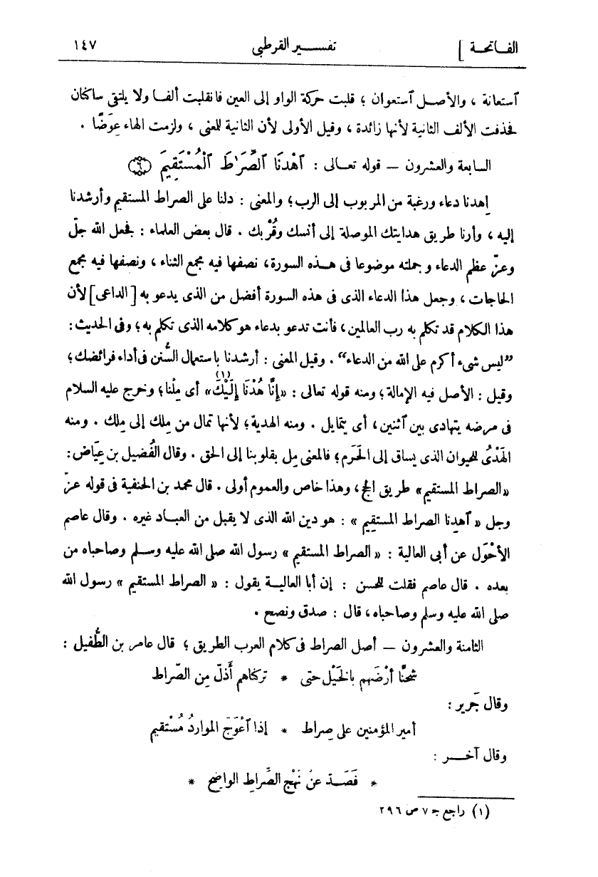 السَّابِعَةُ وَالْعِشْرُونَ قَوْلُهُ تَعَالَى: اهْدِنَا الصِّراطَ الْمُسْتَقِيمَ اهْدِنَا دُعَاءٌ وَرَغْبَةٌ مِنَ الْمَرْبُوبِ إِلَى الرَّبِّ، وَالْمَعْنَى: دُلَّنَا عَلَى الصِّرَاطِ الْمُسْتَقِيمِ وَأَرْشِدْنَا إِلَيْهِ، وَأَرِنَا طَرِيقَ هِدَايَتِكَ الْمُوَصِّلَةِ إِلَى أُنْسِكَ وَقُرْبِكَ. قَالَ بَعْضُ الْعُلَمَاءِ: فَجَعَلَ اللَّهُ جَلَّ وَعَزَّ عِظَمَ الدُّعَاءِ وَجُمْلَتَهُ مَوْضُوعًا فِي هَذِهِ السُّورَةِ، نِصْفُهَا فِيهِ مَجْمَعُ الثَّنَاءِ، وَنِصْفُهَا فِيهِ مَجْمَعُ الْحَاجَاتِ، وَجَعَلَ هَذَا الدُّعَاءَ الَّذِي فِي هَذِهِ السُّورَةِ أَفْضَلَ مِنَ الَّذِي يَدْعُو بِهِ [الدَّاعِي] لِأَنَّ هَذَا الْكَلَامَ قَدْ تَكَلَّمَ بِهِ رَبُّ الْعَالَمِينَ، فَأَنْتَ تَدْعُو بِدُعَاءٍ هُوَ كَلَامُهُ الَّذِي تكلم به، وفي الحديث: (ليس شي أَكْرَمَ عَلَى اللَّهِ مِنَ الدُّعَاءِ). وَقِيلَ الْمَعْنَى: أَرْشِدْنَا بِاسْتِعْمَالِ السُّنَنِ فِي أَدَاءِ فَرَائِضِكَ، وَقِيلَ: الْأَصْلُ فِيهِ الْإِمَالَةُ، وَمِنْهُ قَوْلُهُ تَعَالَى:" إِنَّا هُدْنا إِلَيْكَ «١» " [الأعراف: ١٥٦] أَيْ مِلْنَا، وَخَرَجَ عَلَيْهِ السَّلَامُ فِي مَرَضِهِ يَتَهَادَى بَيْنَ اثْنَيْنِ، أَيْ يَتَمَايَلُ. وَمِنْهُ الْهَدِيَّةُ، لِأَنَّهَا تُمَالُ مِنْ مَلِكٍ إِلَى مَلِكٍ. وَمِنْهُ الْهَدْيُ لِلْحَيَوَانِ الَّذِي يُسَاقُ إِلَى الْحَرَمِ، فَالْمَعْنَى مِلْ بِقُلُوبِنَا إِلَى الْحَقِّ. وَقَالَ الْفُضَيْلُ بْنُ عِيَاضٍ:" الصِّراطَ الْمُسْتَقِيمَ" طَرِيقُ الْحَجِّ، وَهَذَا خَاصٌّ وَالْعُمُومُ أَوْلَى. قَالَ مُحَمَّدُ بْنُ الْحَنَفِيَّةِ فِي قَوْلِهِ عَزَّ وَجَلَّ" اهْدِنَا الصِّراطَ الْمُسْتَقِيمَ": هُوَ دين الله الذي لا يقبل من العبادة غَيْرَهُ. وَقَالَ عَاصِمٌ الْأَحْوَلُ عَنْ أَبِي الْعَالِيَةِ:" الصِّراطَ الْمُسْتَقِيمَ" رَسُولُ اللَّهِ صَلَّى اللَّهُ عَلَيْهِ وَسَلَّمَ وَصَاحِبَاهُ مِنْ بَعْدِهِ. قَالَ عَاصِمٌ فَقُلْتُ لِلْحَسَنِ: إِنَّ أَبَا الْعَالِيَةِ يَقُولُ:" الصِّراطَ الْمُسْتَقِيمَ" رَسُولُ اللَّهِ صَلَّى اللَّهُ عَلَيْهِ وَسَلَّمَ وَصَاحِبَاهُ، قَالَ: صَدَقَ وَنَصَحَ. الثَّامِنَةُ وَالْعِشْرُونَ أَصْلُ الصِّرَاطِ فِي كَلَامِ الْعَرَبِ الطَّرِيقُ، قَالَ عَامِرُ بْنُ الطُّفَيْلِ: