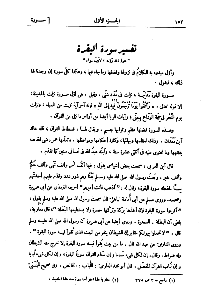 وَهَكَذَا كُلُّ سُورَةٍ إِنْ وَجَدْنَا لَهَا ذَلِكَ، فَنَقُولُ: سُورَةُ الْبَقَرَةِ مَدَنِيَّةٌ، نَزَلَتْ فِي مُدَدٍ شَتَّى. وَقِيلَ: هِيَ أَوَّلُ سُورَةٍ نَزَلَتْ بِالْمَدِينَةِ، إِلَّا قَوْلَهُ تَعَالَى:" وَاتَّقُوا يَوْماً تُرْجَعُونَ فِيهِ «١» إِلَى اللَّهِ" [البقرة: ٢٨١] فَإِنَّهُ آخِرُ آيَةٍ نَزَلَتْ مِنَ السَّمَاءِ، وَنَزَلَتْ يَوْمَ النَّحْرِ فِي حِجَّةِ الْوَدَاعِ بِمِنًى، وَآيَاتُ الرِّبَا أَيْضًا مِنْ أَوَاخِرِ مَا نَزَلَ مِنَ الْقُرْآنِ. وَهَذِهِ السُّورَةُ فَضْلُهَا عَظِيمٌ وَثَوَابُهَا جَسِيمٌ. وَيُقَالُ لَهَا: فُسْطَاطُ الْقُرْآنِ، قَالَهُ خَالِدُ بْنُ مَعْدَانَ. وَذَلِكَ لِعِظَمِهَا وَبِهَائِهَا، وَكَثْرَةِ أَحْكَامِهَا وَمَوَاعِظِهَا. وَتَعَلَّمَهَا عُمَرُ رَضِيَ اللَّهُ عَنْهُ بِفِقْهِهَا وَمَا تَحْتَوِي عَلَيْهِ فِي اثْنَتَيْ عَشْرَةَ سَنَةً، وَابْنُهُ عَبْدُ اللَّهِ فِي ثَمَانِي سِنِينَ كَمَا تَقَدَّمَ. قَالَ ابْنُ الْعَرَبِيِّ: سَمِعْتُ بَعْضَ أَشْيَاخِي يَقُولُ: فِيهَا أَلْفُ أَمْرٍ وَأَلْفُ نَهْيٍ وَأَلْفُ حُكْمٍ وَأَلْفُ خَبَرٍ. وَبَعَثَ رَسُولُ اللَّهِ صَلَّى اللَّهُ عَلَيْهِ وَسَلَّمَ بَعْثًا وَهُمْ ذَوُو عَدَدٍ وَقَدَّمَ عَلَيْهِمْ أَحْدَثَهُمْ سِنًّا لِحِفْظِهِ سُورَةَ الْبَقَرَةِ، وَقَالَ لَهُ: (اذْهَبْ فَأَنْتَ أَمِيرُهُمْ) أَخْرَجَهُ التِّرْمِذِيُّ عَنْ أَبِي هُرَيْرَةَ وَصَحَّحَهُ. وَرَوَى مُسْلِمٌ عَنْ أَبِي أُمَامَةَ الْبَاهِلِيِّ قَالَ سَمِعْتُ رَسُولَ اللَّهِ صَلَّى اللَّهُ عَلَيْهِ وَسَلَّمَ يَقُولُ: (اقْرَءُوا سُورَةَ الْبَقَرَةِ فَإِنَّ أَخْذَهَا بَرَكَةٌ وَتَرْكَهَا حَسْرَةٌ وَلَا يَسْتَطِيعُهَا الْبَطَلَةُ)، قَالَ مُعَاوِيَةُ: «٢» بَلَغَنِي أَنَّ الْبَطَلَةَ: السَّحَرَةُ. وَرُوِيَ أَيْضًا عَنْ أَبِي هُرَيْرَةَ أَنَّ رَسُولَ اللَّهِ صَلَّى اللَّهُ عَلَيْهِ وَسَلَّمَ قَالَ: (لَا تَجْعَلُوا بُيُوتَكُمْ مَقَابِرَ إِنَّ الشَّيْطَانَ يَنْفِرُ مِنَ الْبَيْتِ الَّذِي تُقْرَأُ فِيهِ سُورَةُ الْبَقَرَةِ). وَرَوَى الدَّارِمِيُّ عَنْ عَبْدِ اللَّهِ قَالَ: مَا مِنْ بَيْتٍ يُقْرَأُ فِيهِ سُورَةُ الْبَقَرَةِ إِلَّا خَرَجَ مِنْهُ الشَّيْطَانُ وَلَهُ ضُرَاطٌ. وَقَالَ: إِنَّ لِكُلِ شي سَنَامًا وَإِنَّ سَنَامَ الْقُرْآنِ سُورَةُ الْبَقَرَةِ، وَإِنَّ لكل شي لُبَابًا وَإِنَّ لُبَابَ الْقُرْآنِ الْمُفَصَّلُ. قَالَ أَبُو مُحَمَّدٍ الدَّارِمِيُّ. اللُّبَابُ: الْخَالِصُ. وَفِي صَحِيحِ الْبَسْتِيِّ