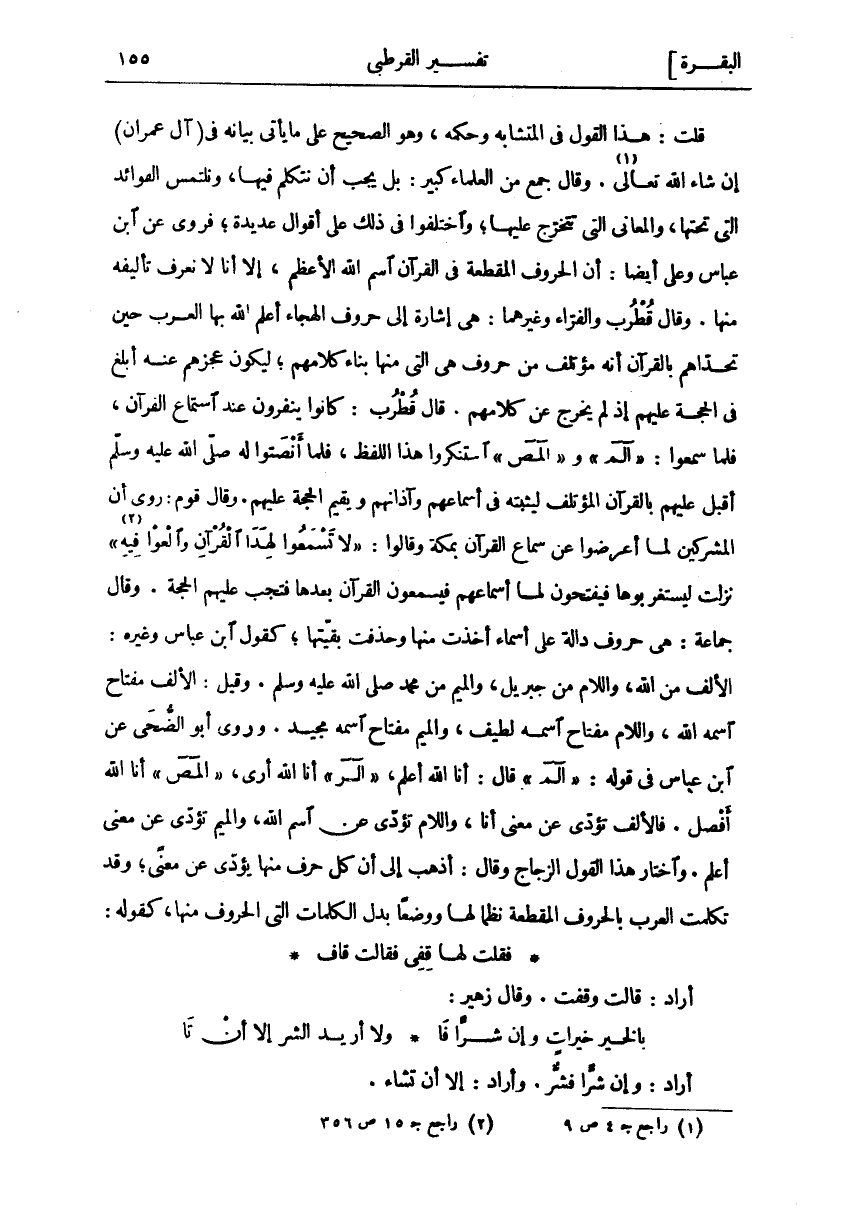 قُلْتُ: هَذَا الْقَوْلُ فِي الْمُتَشَابِهِ وَحُكْمِهِ، وَهُوَ الصَّحِيحُ عَلَى مَا يَأْتِي بَيَانُهُ فِي (آلِ عِمْرَانَ) إِنْ شَاءَ اللَّهُ تَعَالَى «١». وَقَالَ جَمْعٌ مِنَ الْعُلَمَاءِ كَبِيرٌ: بَلْ يَجِبُ أَنْ نَتَكَلَّمَ فِيهَا، وَنَلْتَمِسَ الْفَوَائِدَ الَّتِي تَحْتَهَا، وَالْمَعَانِيَ الَّتِي تَتَخَرَّجُ عَلَيْهَا، وَاخْتَلَفُوا فِي ذَلِكَ عَلَى أَقْوَالٍ عَدِيدَةٍ، فَرُوِيَ عَنِ ابْنِ عَبَّاسٍ وَعَلِيٍّ أَيْضًا: أَنَّ الْحُرُوفَ الْمُقَطَّعَةَ فِي الْقُرْآنِ اسْمُ اللَّهِ الْأَعْظَمِ، إِلَّا أَنَّا لَا نَعْرِفُ تَأْلِيفَهُ مِنْهَا. وَقَالَ قُطْرُبٌ وَالْفَرَّاءُ وَغَيْرُهُمَا: هِيَ إِشَارَةٌ إِلَى حُرُوفِ الْهِجَاءِ أَعْلَمَ اللَّهُ بِهَا الْعَرَبَ حِينَ تَحَدَّاهُمْ بِالْقُرْآنِ أَنَّهُ مُؤْتَلَفٌ مِنْ حُرُوفٍ هِيَ الَّتِي مِنْهَا بِنَاءُ كَلَامِهِمْ، لِيَكُونَ عَجْزُهُمْ عَنْهُ أَبْلَغَ فِي الْحُجَّةِ عَلَيْهِمْ إِذْ لَمْ يَخْرُجْ عَنْ كَلَامِهِمْ. قَالَ قُطْرُبٌ: كَانُوا يَنْفِرُونَ عِنْدَ اسْتِمَاعِ الْقُرْآنِ، فَلَمَّا سَمِعُوا:" الم" وَ" المص" اسْتَنْكَرُوا هَذَا اللَّفْظَ، فَلَمَّا أَنْصَتُوا لَهُ صَلَّى اللَّهُ عَلَيْهِ وَسَلَّمَ أَقْبَلَ عَلَيْهِمْ بِالْقُرْآنِ الْمُؤْتَلَفِ لِيُثَبِّتَهُ فِي أَسْمَاعِهِمْ وَآذَانِهِمْ وَيُقِيمَ الْحُجَّةَ عَلَيْهِمْ. وَقَالَ قَوْمٌ: رُوِيَ أَنَّ الْمُشْرِكِينَ لَمَّا أَعْرَضُوا عَنْ سَمَاعِ الْقُرْآنِ بِمَكَّةَ وَقَالُوا:" لَا تَسْمَعُوا لِهذَا الْقُرْآنِ وَالْغَوْا فِيهِ «٢» " [فصلت: ٢٦] نَزَلَتْ لِيَسْتَغْرِبُوهَا فَيَفْتَحُونَ لَهَا أَسْمَاعَهُمْ فَيَسْمَعُونَ الْقُرْآنَ بَعْدَهَا فَتَجِبُ عَلَيْهِمُ الْحُجَّةُ. وَقَالَ جَمَاعَةٌ: هِيَ حُرُوفٌ دَالَّةٌ عَلَى أَسْمَاءٍ أُخِذَتْ مِنْهَا وَحُذِفَتْ بَقِيَّتُهَا، كَقَوْلِ ابْنِ عَبَّاسٍ وَغَيْرِهِ: الْأَلِفُ مِنَ اللَّهِ، وَاللَّامُ مِنْ جِبْرِيلَ، وَالْمِيمُ مِنْ مُحَمَّدٍ صَلَّى اللَّهُ عَلَيْهِ وَسَلَّمَ. وَقِيلَ: الْأَلِفُ مِفْتَاح اسْمِهِ اللَّهِ، وَاللَّامُ مِفْتَاح اسْمِهِ لَطِيفٍ، وَالْمِيمُ مِفْتَاح اسْمِهِ مَجِيدٍ. وَرَوَى أَبُو الضُّحَى عَنِ ابْنِ عَبَّاسٍ فِي قَوْلِهِ:" الم" قَالَ: أَنَا اللَّهُ أَعْلَمُ،" الر" أَنَا اللَّهُ أَرَى،" المص" أَنَا اللَّهُ أَفْصِلُ. فَالْأَلِفُ تُؤَدِّي عَنْ مَعْنَى أَنَا، وَاللَّامُ تُؤَدِّي عَنِ اسْمِ اللَّهِ، وَالْمِيمُ تُؤَدِّي عَنْ مَعْنَى أَعْلَمَ. وَاخْتَارَ هَذَا الْقَوْلَ الزَّجَّاجُ وَقَالَ: أَذْهَبُ إِلَى أَنَّ كُلَّ حَرْفٍ مِنْهَا يُؤَدِّي عَنْ مَعْنًى، وَقَدْ تَكَلَّمَتِ الْعَرَبُ بِالْحُرُوفِ الْمُقَطَّعَةِ نَظْمًا لَهَا وَوَضْعًا بَدَلَ الْكَلِمَاتِ الَّتِي الْحُرُوفُ مِنْهَا، كَقَوْلِهِ: