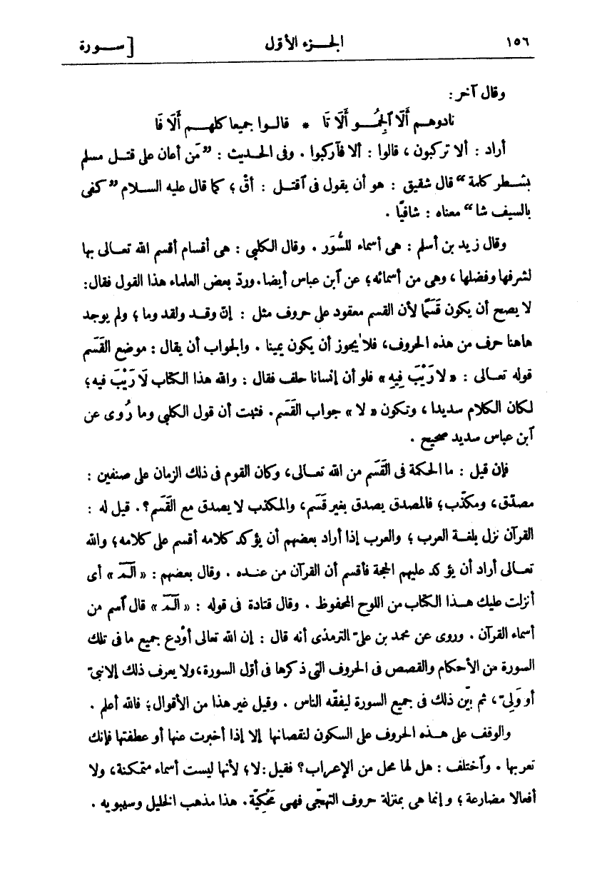 أَرَادَ: أَلَا تَرْكَبُونَ، قَالُوا: أَلَا فَارْكَبُوا. وَفِي الْحَدِيثِ: (مَنْ أَعَانَ عَلَى قَتْلِ مُسْلِمٍ بِشَطْرِ كَلِمَةٍ) قَالَ شَقِيقٌ: هُوَ أَنْ يَقُولَ فِي اقْتُلْ: اقْ، كَمَا قَالَ عَلَيْهِ السَّلَامُ (كَفَى بِالسَّيْفِ شَا) مَعْنَاهُ: شَافِيًا. وَقَالَ زَيْدُ بْنُ أَسْلَمَ: هِيَ أَسْمَاءٌ لِلسُّوَرِ. وَقَالَ الْكَلْبِيُّ: هِيَ أَقْسَامٌ أَقْسَمَ اللَّهُ تَعَالَى بِهَا لِشَرَفِهَا وَفَضْلِهَا، وَهِيَ مِنْ أَسْمَائِهِ، عَنِ ابْنِ عَبَّاسٍ أَيْضًا وَرَدَّ بَعْضُ الْعُلَمَاءِ هَذَا الْقَوْلَ فَقَالَ: لَا يَصِحُّ أَنْ يَكُونَ قَسَمًا لِأَنَّ الْقَسَمَ مَعْقُودٌ عَلَى حُرُوفٍ مِثْلَ: إِنَّ وَقَدْ وَلَقَدْ وَمَا، وَلَمْ يُوجَدْ ها هنا حَرْفٌ مِنْ هَذِهِ الْحُرُوفِ، فَلَا يَجُوزُ أَنْ يَكُونَ يَمِينًا. وَالْجَوَابُ أَنْ يُقَالَ: مَوْضِعُ الْقَسَمِ قَوْلُهُ تَعَالَى:" لَا رَيْبَ فِيهِ" فَلَوْ أَنَّ إِنْسَانًا حَلَفَ فَقَالَ: وَاللَّهِ هَذَا الْكِتَابُ لَا رَيْبَ فِيهِ، لَكَانَ الْكَلَامُ سَدِيدًا، وَتَكُونُ" لَا" جَوَابَ الْقَسَمِ. فَثَبَتَ أَنَّ قَوْلَ الْكَلْبِيِّ وَمَا رُوِيَ عَنِ ابْنِ عَبَّاسٍ سَدِيدٌ صَحِيحٌ. فَإِنْ قِيلَ: مَا الْحِكْمَةُ فِي الْقَسَمِ مِنَ اللَّهِ تَعَالَى، وَكَانَ الْقَوْمُ فِي ذَلِكَ الزَّمَانِ عَلَى صِنْفَيْنِ: مُصَدِّقٌ، وَمُكَذِّبٌ، فَالْمُصَدِّقُ يُصَدِّقُ بِغَيْرِ قَسَمٍ، وَالْمُكَذِّبُ لَا يُصَدِّقُ مَعَ الْقَسَمِ؟. قِيلَ لَهُ: الْقُرْآنُ نَزَلَ بِلُغَةِ الْعَرَبِ، وَالْعَرَبُ إِذَا أَرَادَ بَعْضُهُمْ أَنْ يُؤَكِّدَ كَلَامَهُ أَقْسَمَ عَلَى كَلَامِهِ، وَاللَّهُ تَعَالَى أَرَادَ أَنْ يُؤَكِّدَ عَلَيْهِمُ الْحُجَّةَ فَأَقْسَمَ أَنَّ الْقُرْآنَ مِنْ عِنْدِهِ. وَقَالَ بَعْضُهُمْ:" الم" أَيْ أَنْزَلْتُ عَلَيْكَ هَذَا الْكِتَابَ مِنَ اللَّوْحِ الْمَحْفُوظِ. وَقَالَ قَتَادَةُ فِي قَوْلِهِ:" الم" قَالَ اسْمٌ مِنْ أَسْمَاءِ الْقُرْآنِ. وَرُوِيَ عَنْ مُحَمَّدِ بْنِ عَلِيٍّ التِّرْمِذِيِّ أَنَّهُ قَالَ: إِنَّ اللَّهَ تَعَالَى أَوْدَعَ جَمِيعَ مَا فِي تِلْكَ السُّورَةِ مِنَ الْأَحْكَامِ وَالْقَصَصِ فِي الْحُرُوفِ الَّتِي ذَكَرَهَا فِي أَوَّلِ السُّورَةِ، وَلَا يَعْرِفُ ذَلِكَ إِلَّا نَبِيٌّ أَوْ وَلِيٌّ، ثُمَّ بَيَّنَ ذَلِكَ فِي جَمِيعِ السُّورَةِ لِيُفَقِّهَ النَّاسَ. وَقِيلَ غَيْرُ هَذَا مِنَ الْأَقْوَالِ، فَاللَّهُ أَعْلَمُ. وَالْوَقْفُ عَلَى هَذِهِ الْحُرُوفِ عَلَى السُّكُونِ لِنُقْصَانِهَا إِلَّا إِذَا أَخْبَرْتَ عَنْهَا أَوْ عَطَفْتَهَا فَإِنَّكَ تُعْرِبُهَا. وَاخْتُلِفَ: هَلْ لَهَا مَحَلٌّ مِنَ الْإِعْرَابِ؟ فَقِيلَ: لَا، لِأَنَّهَا لَيْسَتْ أَسْمَاءً مُتَمَكِّنَةً، وَلَا أَفْعَالًا مُضَارِعَةً، وَإِنَّمَا هِيَ بِمَنْزِلَةِ حُرُوفِ التَّهَجِّي فَهِيَ مَحْكِيَّةٌ. هَذَا مَذْهَبُ الْخَلِيلِ وَسِيبَوَيْهِ.