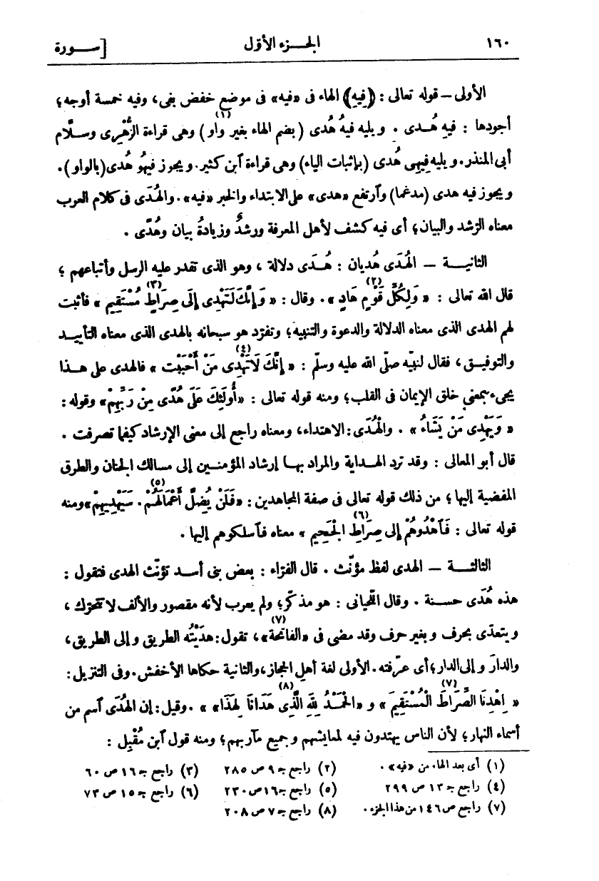 الْأُولَى قَوْلُهُ تَعَالَى:" فِيهِ" الْهَاءُ فِي" فِيهِ" فِي مَوْضِعِ خَفْضٍ بِفِي، وَفِيهِ خَمْسَةُ أَوْجُهٍ، أَجْوَدُهَا: فِيهِ هُدًى وَيَلِيهِ فِيهُ هُدًى (بِضَمِّ الْهَاءِ بِغَيْرِ وَاوٍ) «١» وَهِيَ قِرَاءَةُ الزُّهْرِيِّ وَسَلَّامٍ أَبِي الْمُنْذِرِ. وَيَلِيهِ فِيهِي هُدًى (بِإِثْبَاتِ الْيَاءِ) وَهِيَ قِرَاءَةُ ابْنِ كَثِيرٍ. وَيَجُوزُ فِيهُو هُدًى (بِالْوَاوِ). وَيَجُوزُ فِيهْ هُدًى (مُدْغَمًا) وَارْتَفَعَ" هُدىً" عَلَى الِابْتِدَاءِ وَالْخَبَرُ" فِيهِ". وَالْهُدَى فِي كَلَامِ الْعَرَبِ مَعْنَاهُ الرُّشْدُ وَالْبَيَانُ، أَيْ فِيهِ كَشْفٌ لِأَهْلِ الْمَعْرِفَةِ وَرُشْدٌ وَزِيَادَةُ بَيَانٍ وَهُدًى. الثَّانِيَةُ الْهُدَى هُدَيَانِ: هُدَى دَلَالَةٍ، وَهُوَ الَّذِي تَقْدِرُ عَلَيْهِ الرُّسُلُ وَأَتْبَاعُهُمْ، قَالَ اللَّهُ تَعَالَى:" وَلِكُلِّ قَوْمٍ هادٍ «٢» " [الرعد: ٧]. وقال:" وَإِنَّكَ لَتَهْدِي إِلى صِراطٍ مُسْتَقِيمٍ «٣» " [الشورى: ٥٢] فَأَثْبَتَ لَهُمُ الْهُدَى الَّذِي مَعْنَاهُ الدَّلَالَةُ وَالدَّعْوَةُ وَالتَّنْبِيهُ، وَتَفَرَّدَ هُوَ سُبْحَانَهُ بِالْهُدَى الَّذِي مَعْنَاهُ التَّأْيِيدُ وَالتَّوْفِيقُ، فَقَالَ لِنَبِيِّهِ صَلَّى اللَّهُ عَلَيْهِ وَسَلَّمَ:" إِنَّكَ لَا تَهْدِي «٤» مَنْ أَحْبَبْتَ" [القصص: ٥٦] فالهدى على هذا يجئ بِمَعْنَى خَلْقِ الْإِيمَانِ فِي الْقَلْبِ، وَمِنْهُ قَوْلُهُ تعالى:" أُولئِكَ عَلى هُدىً مِنْ رَبِّهِمْ" [البقرة: ٥] وقوله:" وَيَهْدِي مَنْ يَشاءُ" [فاطر: ٨] وَالْهُدَى: الِاهْتِدَاءُ، وَمَعْنَاهُ رَاجِعٌ إِلَى مَعْنَى الْإِرْشَادِ كَيْفَمَا تَصَرَّفَتْ. قَالَ أَبُو الْمَعَالِي: وَقَدْ تَرِدُ الْهِدَايَةُ وَالْمُرَادُ بِهَا إِرْشَادُ الْمُؤْمِنِينَ إِلَى مَسَالِكِ الْجِنَانِ وَالطُّرُقِ الْمُفْضِيَةِ إِلَيْهَا، مِنْ ذَلِكَ قَوْلُهُ تَعَالَى فِي صِفَةِ الْمُجَاهِدِينَ:" فَلَنْ يُضِلَّ أَعْمالَهُمْ «٥». سَيَهْدِيهِمْ" [محمد: ٥ ٤] وَمِنْهُ قَوْلُهُ تَعَالَى:" فَاهْدُوهُمْ إِلى صِراطِ الْجَحِيمِ «٦» " [الصافات: ٢٣] مَعْنَاهُ فَاسْلُكُوهُمْ إِلَيْهَا. الثَّالِثَةُ الْهُدَى لَفْظٌ مُؤَنَّثٌ قَالَ الْفَرَّاءُ: بَعْضُ بَنِي أَسَدٍ تُؤَنِّثُ الْهُدَى فَتَقُولُ: هَذِهِ هُدًى حَسَنَةٌ. وَقَالَ اللِّحْيَانِيُّ: هُوَ مُذَكَّرٌ، وَلَمْ يُعْرَبْ لِأَنَّهُ مَقْصُورٌ وَالْأَلِفُ لَا تَتَحَرَّكُ، وَيَتَعَدَّى بِحَرْفٍ وَبِغَيْرِ حَرْفٍ وَقَدْ مَضَى فِي" الْفَاتِحَةِ «٧» "، تَقُولُ: هَدَيْتُهُ الطَّرِيقَ وَإِلَى الطَّرِيقِ وَالدَّارَ وَإِلَى الدَّارِ، أَيْ عَرَّفْتُهُ. الْأُولَى لُغَةُ أَهْلِ الْحِجَازِ، وَالثَّانِيَةُ حَكَاهَا الْأَخْفَشُ. وَفِي التَّنْزِيلِ:" اهْدِنَا الصِّراطَ الْمُسْتَقِيمَ «٨» " وَ" الْحَمْدُ لِلَّهِ الَّذِي هَدانا لِهذا «٩» " [الأعراف: ٤٣] وَقِيلَ: إِنَّ الْهُدَى اسْمٌ مِنْ أَسْمَاءِ النَّهَارِ، لِأَنَّ النَّاسَ يَهْتَدُونَ فِيهِ لِمَعَايِشِهِمْ وَجَمِيعِ مَآرِبِهِمْ، ومنه قول ابن مقبل: