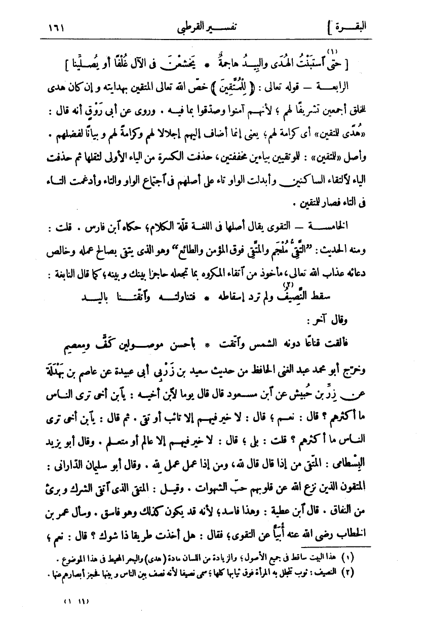وَخَرَّجَ أَبُو مُحَمَّدٍ عَبْدُ الْغَنِيِّ الْحَافِظُ مِنْ حَدِيثِ سَعِيدِ بْنِ زَرْبِيٍّ أَبِي عُبَيْدَةَ عَنْ عَاصِمِ بْنِ بَهْدَلَةَ عَنْ زِرِّ بْنِ حُبَيْشٍ عَنِ ابْنِ مَسْعُودٍ قال قال يوما لابن أخيه: يا بن أَخِي تَرَى النَّاسَ مَا أَكْثَرَهُمْ؟ قَالَ: نَعَمْ، قَالَ: لَا خَيْرَ فِيهِمْ إِلَّا تَائِبٌ أَوْ تقي ثم قال: يا بن أَخِي تَرَى النَّاسَ مَا أَكْثَرَهُمْ؟ قُلْتُ: بَلَى، قَالَ: لَا خَيْرَ فِيهِمْ إِلَّا عَالِمٌ أَوْ مُتَعَلِّمٌ. وَقَالَ أَبُو يَزِيدَ الْبِسْطَامِيُّ: الْمُتَّقِي مَنْ إِذَا قَالَ قَالَ لِلَّهِ، وَمَنْ إِذَا عَمِلَ عَمِلَ لِلَّهِ. وَقَالَ أَبُو سُلَيْمَانَ الدَّارَانِيُّ: الْمُتَّقُونَ الَّذِينَ نَزَعَ اللَّهُ عَنْ قُلُوبِهِمْ حُبَّ الشَّهَوَاتِ. وَقِيلَ: الْمُتَّقِي الَّذِي اتَّقَى الشِّرْكَ وَبَرِئَ مِنَ النِّفَاقِ. قَالَ ابْنُ عَطِيَّةَ: وَهَذَا فَاسِدٌ، لِأَنَّهُ قَدْ يَكُونُ كَذَلِكَ وَهُوَ فَاسِقٌ. وَسَأَلَ عُمَرُ بْنُ الْخَطَّابِ رَضِيَ اللَّهُ عَنْهُ أُبَيًّا عَنِ التَّقْوَى، فَقَالَ: هَلْ أَخَذْتَ طَرِيقًا ذَا شَوْكٍ؟ قال: نعم،