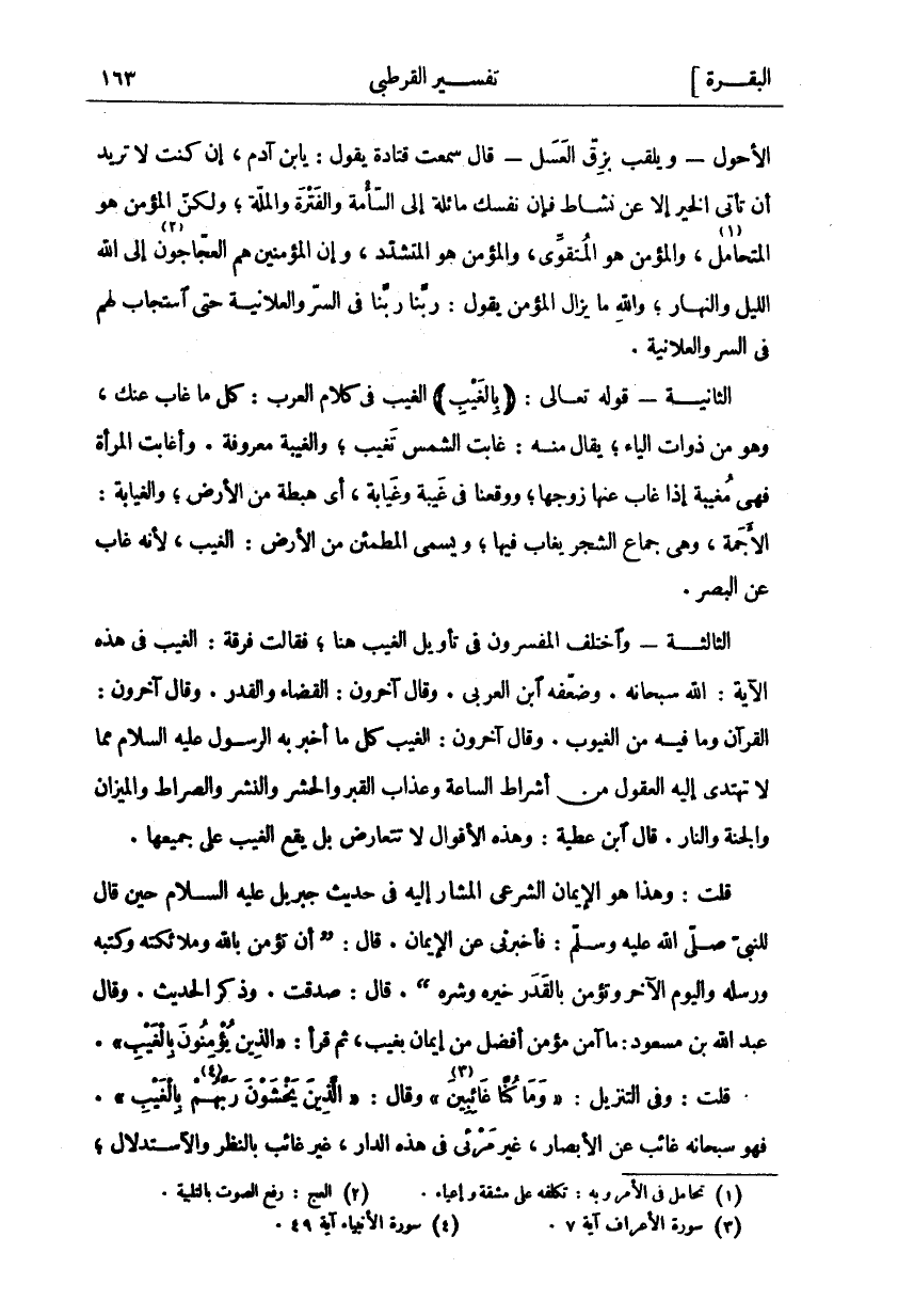 الْأَحْوَلُ وَيُلَقَّبُ بِزِقِّ الْعَسَلِ قَالَ سَمِعْتُ قَتَادَةَ يقول: يا بن آدَمَ، إِنْ كُنْتَ لَا تُرِيدُ أَنْ تَأْتِيَ الْخَيْرَ إِلَّا عَنْ نَشَاطٍ فَإِنَّ نَفْسَكَ مَائِلَةٌ إِلَى السَّأْمَةِ وَالْفَتْرَةِ وَالْمَلَّةِ، وَلَكِنَّ الْمُؤْمِنَ هُوَ الْمُتَحَامِلُ «١»، وَالْمُؤْمِنُ هُوَ الْمُتَقَوِّي، وَالْمُؤْمِنُ هُوَ الْمُتَشَدِّدُ، وإن المؤمنين هم العجاجون «٢» إلى الله اللَّيْلِ وَالنَّهَارِ، وَاللَّهِ مَا يَزَالُ الْمُؤْمِنُ يَقُولُ: ربنا رَبَّنَا فِي السِّرِّ وَالْعَلَانِيَةِ حَتَّى اسْتَجَابَ لَهُمْ فِي السِّرِّ وَالْعَلَانِيَةِ. الثَّانِيَةُ قَوْلُهُ تَعَالَى: (بِالْغَيْبِ) الْغَيْبُ فِي كَلَامِ الْعَرَبِ كُلُّ مَا غَابَ عَنْكَ، وَهُوَ مِنْ ذَوَاتِ الْيَاءِ، يُقَالُ مِنْهُ: غَابَتِ الشَّمْسُ تَغِيبُ، وَالْغِيبَةُ مَعْرُوفَةٌ. وَأَغَابَتِ الْمَرْأَةُ فَهِيَ مُغِيبَةٌ إِذَا غَابَ عَنْهَا زَوْجُهَا، وَوَقَعْنَا فِي غَيْبَةٍ وَغِيَابَةٍ، أَيْ هَبْطَةٍ مِنَ الْأَرْضِ، وَالْغِيَابَةُ: الْأَجَمَةُ، وَهِيَ جِمَاعُ الشَّجَرِ يُغَابُ فِيهَا، وَيُسَمَّى الْمُطْمَئِنُّ مِنَ الْأَرْضِ: الْغَيْبُ، لِأَنَّهُ غَابَ عَنِ الْبَصَرِ. الثَّالِثَةُ وَاخْتَلَفَ الْمُفَسِّرُونَ فِي تَأْوِيلِ الْغَيْبِ هُنَا، فَقَالَتْ فِرْقَةٌ: الْغَيْبُ فِي هَذِهِ الْآيَةِ: اللَّهُ سُبْحَانَهُ. وَضَعَّفَهُ ابْنُ الْعَرَبِيِّ. وَقَالَ آخَرُونَ: الْقَضَاءُ وَالْقَدَرُ. وَقَالَ آخَرُونَ: الْقُرْآنُ وَمَا فِيهِ مِنَ الْغُيُوبِ. وَقَالَ آخَرُونَ: الْغَيْبُ كُلُّ مَا أَخْبَرَ بِهِ الرَّسُولُ عَلَيْهِ السَّلَامُ مِمَّا لَا تَهْتَدِي إِلَيْهِ الْعُقُولُ مِنْ أَشْرَاطِ السَّاعَةِ وَعَذَابِ الْقَبْرِ وَالْحَشْرِ وَالنَّشْرِ وَالصِّرَاطِ وَالْمِيزَانِ وَالْجَنَّةِ وَالنَّارِ. قَالَ ابْنُ عَطِيَّةَ: وَهَذِهِ الْأَقْوَالُ لَا تَتَعَارَضُ بَلْ يَقَعُ الْغَيْبُ عَلَى جَمِيعِهَا. قُلْتُ: وهذا هو الْإِيمَانُ الشَّرْعِيُّ الْمُشَارُ إِلَيْهِ فِي حَدِيثِ جِبْرِيلَ عَلَيْهِ السَّلَامُ حِينَ قَالَ لِلنَّبِيِّ صَلَّى اللَّهُ عَلَيْهِ وَسَلَّمَ: فَأَخْبِرْنِي عَنِ الْإِيمَانِ. قَالَ: (أَنْ تُؤْمِنَ بِاللَّهِ وَمَلَائِكَتِهِ وَكُتُبِهِ وَرُسُلِهِ وَالْيَوْمِ الْآخِرِ وَتُؤْمِنَ بِالْقَدَرِ خَيْرِهِ وَشَرِّهِ (. قَالَ: صَدَقْتَ. وَذَكَرَ الْحَدِيثَ. وَقَالَ عَبْدُ اللَّهِ بْنُ مَسْعُودٍ: مَا آمن مؤمن أفضل من إيمان بغيب، ثم قرأ:" الَّذِينَ يُؤْمِنُونَ بِالْغَيْبِ" [البقرة: ٣]. قُلْتُ: وَفِي التَّنْزِيلِ:" وَما كُنَّا غائِبِينَ «٣» " وَقَالَ:" الَّذِينَ يَخْشَوْنَ رَبَّهُمْ بِالْغَيْبِ «٤» ". فَهُوَ سُبْحَانُهُ غَائِبٌ عَنِ الْأَبْصَارِ، غَيْرُ مَرْئِيٍّ فِي هَذِهِ الدَّارِ، غير غائب بالنظر والاستدلال،