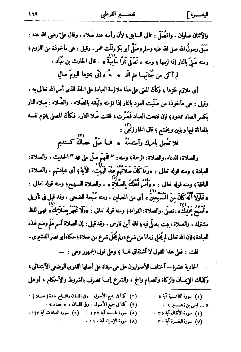 وَالصَّلَاةُ: الدُّعَاءُ وَالصَّلَاةُ: الرَّحْمَةُ، وَمِنْهُ: (اللَّهُمَّ صَلِّ عَلَى مُحَمَّدٍ) الْحَدِيثَ. وَالصَّلَاةُ: الْعِبَادَةُ، وَمِنْهُ قَوْلُهُ تَعَالَى:" وَما كانَ صَلاتُهُمْ عِنْدَ الْبَيْتِ" «٤» [الأنفال: ٣٥] الْآيَةَ، أَيْ عِبَادَتُهُمْ. وَالصَّلَاةُ: النَّافِلَةُ، وَمِنْهُ قَوْلُهُ تعالى:" وَأْمُرْ أَهْلَكَ بِالصَّلاةِ" «٥» [طه: ١٣٢]. والصلاة التسبيح، ومنه قوله تعالى:" فَلَوْلا أَنَّهُ كانَ مِنَ الْمُسَبِّحِينَ" «٦» [الصافات: ١٤٣] أَيْ مِنَ الْمُصَلِّينَ. وَمِنْهُ سُبْحَةُ الضُّحَى. وَقَدْ قيل في تأويل" نُسَبِّحُ بِحَمْدِكَ" «٧» [البقرة: ٣٠] نُصَلِّي. وَالصَّلَاةُ: الْقِرَاءَةُ، وَمِنْهُ قَوْلُهُ تَعَالَى:" وَلا تَجْهَرْ بِصَلاتِكَ" «٨» [الاسراء: ١١٠] فَهِيَ لَفْظٌ مُشْتَرَكٌ. وَالصَّلَاةُ: بَيْتٌ يُصَلَّى فِيهِ، قَالَهُ ابْنُ فَارِسٍ. وَقَدْ قِيلَ: إِنَّ الصَّلَاةَ اسْمُ عَلَمٍ وُضِعَ لِهَذِهِ الْعِبَادَةِ، فَإِنَّ اللَّهَ تَعَالَى لَمْ يُخْلِ زَمَانًا مِنْ شَرْعٍ، وَلَمْ يَخْلُ شَرْعٌ مِنْ صَلَاةٍ، حَكَاهُ أَبُو نَصْرٍ الْقُشَيْرِيُّ. قُلْتُ: فَعَلَى هَذَا الْقَوْلِ لَا اشْتِقَاقَ لَهَا، وَعَلَى قَوْلِ الْجُمْهُورِ وَهِيَ: الْحَادِيَةَ عَشْرَةَ اخْتَلَفَ الْأُصُولِيُّونَ هَلْ هِيَ مُبْقَاةٌ عَلَى أَصْلِهَا اللُّغَوِيِّ الْوَضْعِيِّ الِابْتِدَائِيِّ، وَكَذَلِكَ الْإِيمَانُ وَالزَّكَاةُ وَالصِّيَامُ وَالْحَجُّ، وَالشَّرْعُ إِنَّمَا تَصَرَّفَ بِالشُّرُوطِ وَالْأَحْكَامِ، أَوْ