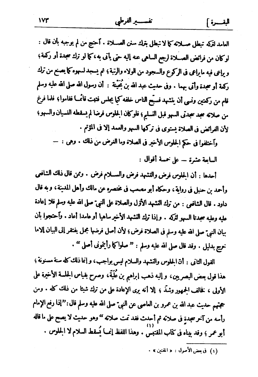 الْعَامِدُ لِتَرْكِهِ تَبْطُلُ صَلَاتُهُ كَمَا لَا تَبْطُلُ بِتَرْكِ سُنَنِ الصَّلَاةِ. احْتَجَّ مَنْ لَمْ يُوجِبْهُ بِأَنْ قَالَ: لَوْ كَانَ مِنْ فَرَائِضِ الصَّلَاةِ لَرَجَعَ السَّاهِي عَنْهُ إِلَيْهِ حَتَّى يَأْتِيَ بِهِ، كَمَا لَوْ تَرَكَ سَجْدَةً أَوْ رَكْعَةً، وَيُرَاعَى فِيهِ مَا يُرَاعَى فِي الرُّكُوعِ وَالسُّجُودِ مِنَ الْوِلَاءِ وَالرُّتْبَةِ، ثُمَّ يَسْجُدُ لِسَهْوِهِ كَمَا يَصْنَعُ مَنْ تَرَكَ رَكْعَةً أَوْ سَجْدَةً وَأَتَى بِهِمَا. وفي حديث عبد الله بن بُحَيْنَةَ: أَنَّ رَسُولَ اللَّهِ صَلَّى اللَّهُ عَلَيْهِ وَسَلَّمَ قَامَ مِنْ رَكْعَتَيْنِ وَنَسِيَ أَنْ يَتَشَهَّدَ فَسَبَّحَ النَّاسُ خَلْفَهُ كَيْمَا يَجْلِسَ فَثَبَتَ قَائِمًا فَقَامُوا، فَلَمَّا فَرَغَ مِنْ صَلَاتِهِ سَجَدَ سَجْدَتَيِ السَّهْوِ قَبْلَ التَّسْلِيمِ، فَلَوْ كَانَ الْجُلُوسُ فَرْضًا لَمْ يُسْقِطْهُ النِّسْيَانُ وَالسَّهْوُ، لِأَنَّ الْفَرَائِضَ فِي الصَّلَاةِ يَسْتَوِي فِي تَرْكِهَا السَّهْوُ وَالْعَمْدُ إِلَّا فِي الْمُؤْتَمِّ. وَاخْتَلَفُوا فِي حُكْمِ الْجُلُوسِ الْأَخِيرِ فِي الصَّلَاةِ وَمَا الْغَرَضُ مِنْ ذَلِكَ. وَهِيَ: السَّابِعَةَ عَشْرَةَ عَلَى خَمْسَةِ أَقْوَالٍ: أَحَدُهَا: أَنَّ الجلوس فرض والتشهيد فَرْضٌ وَالسَّلَامَ فَرْضٌ. وَمِمَّنْ قَالَ ذَلِكَ الشَّافِعِيُّ وَأَحْمَدُ بْنُ حَنْبَلٍ فِي رِوَايَةٍ، وَحَكَاهُ أَبُو مُصْعَبٍ فِي مُخْتَصَرِهِ عَنْ مَالِكٍ وَأَهْلِ الْمَدِينَةِ، وَبِهِ قَالَ دَاوُدُ. قَالَ الشَّافِعِيُّ: مَنْ تَرَكَ التَّشَهُّدَ الْأَوَّلَ وَالصَّلَاةَ عَلَى النَّبِيِّ صَلَّى اللَّهُ عَلَيْهِ وَسَلَّمَ فَلَا إِعَادَةَ عَلَيْهِ وَعَلَيْهِ سَجَدَتَا السَّهْوِ لِتَرْكِهِ. وَإِذَا تَرَكَ التَّشَهُّدَ الْأَخِيرَ سَاهِيًا أَوْ عَامِدًا أَعَادَ. وَاحْتَجُّوا بِأَنَّ بَيَانَ النَّبِيِّ صَلَّى اللَّهُ عَلَيْهِ وَسَلَّمَ فِي الصَّلَاةِ فَرْضٌ، لِأَنَّ أَصْلَ فَرْضِهَا مُجْمَلٌ يَفْتَقِرُ إِلَى الْبَيَانِ إِلَّا مَا خَرَجَ بِدَلِيلٍ وَقَدْ قَالَ صَلَّى اللَّهُ عَلَيْهِ وَسَلَّمَ: (صَلُّوا كَمَا رَأَيْتُمُونِي أُصَلِّي). الْقَوْلُ الثَّانِي: أَنَّ الْجُلُوسَ وَالتَّشَهُّدَ وَالسَّلَامَ لَيْسَ بِوَاجِبٍ، وَإِنَّمَا ذَلِكَ كُلُّهُ سُنَّةٌ مَسْنُونَةٌ، هَذَا قَوْلُ بَعْضِ الْبَصْرِيِّينَ، وَإِلَيْهِ ذَهَبَ إِبْرَاهِيمُ بْنُ عُلَيَّةَ، وَصَرَّحَ بِقِيَاسِ الْجِلْسَةِ الْأَخِيرَةِ عَلَى الْأُولَى، فَخَالَفَ الْجُمْهُورَ وَشَذَّ، إِلَّا أَنَّهُ يَرَى الْإِعَادَةَ عَلَى مَنْ تَرَكَ شَيْئًا مِنْ ذَلِكَ كُلِّهِ. وَمِنْ حُجَّتِهِمْ حَدِيثُ عَبْدِ اللَّهِ بْنِ عَمْرِو بْنِ الْعَاصِ عَنِ النَّبِيِّ صَلَّى اللَّهُ عَلَيْهِ وَسَلَّمَ قَالَ: (إِذَا رَفَعَ الْإِمَامُ رَأْسَهُ مِنْ آخِرِ سَجْدَةٍ فِي صَلَاتِهِ ثُمَّ أَحْدَثَ فَقَدْ تَمَّتْ صَلَاتُهُ) وَهُوَ حَدِيثٌ لَا يَصِحُّ عَلَى مَا قَالَهُ أَبُو عُمَرَ، وَقَدْ بَيَّنَّاهُ فِي كِتَابِ الْمُقْتَبَسِ «١». وَهَذَا اللَّفْظُ إِنَّمَا يُسْقِطُ السَّلَامَ لا الجلوس.