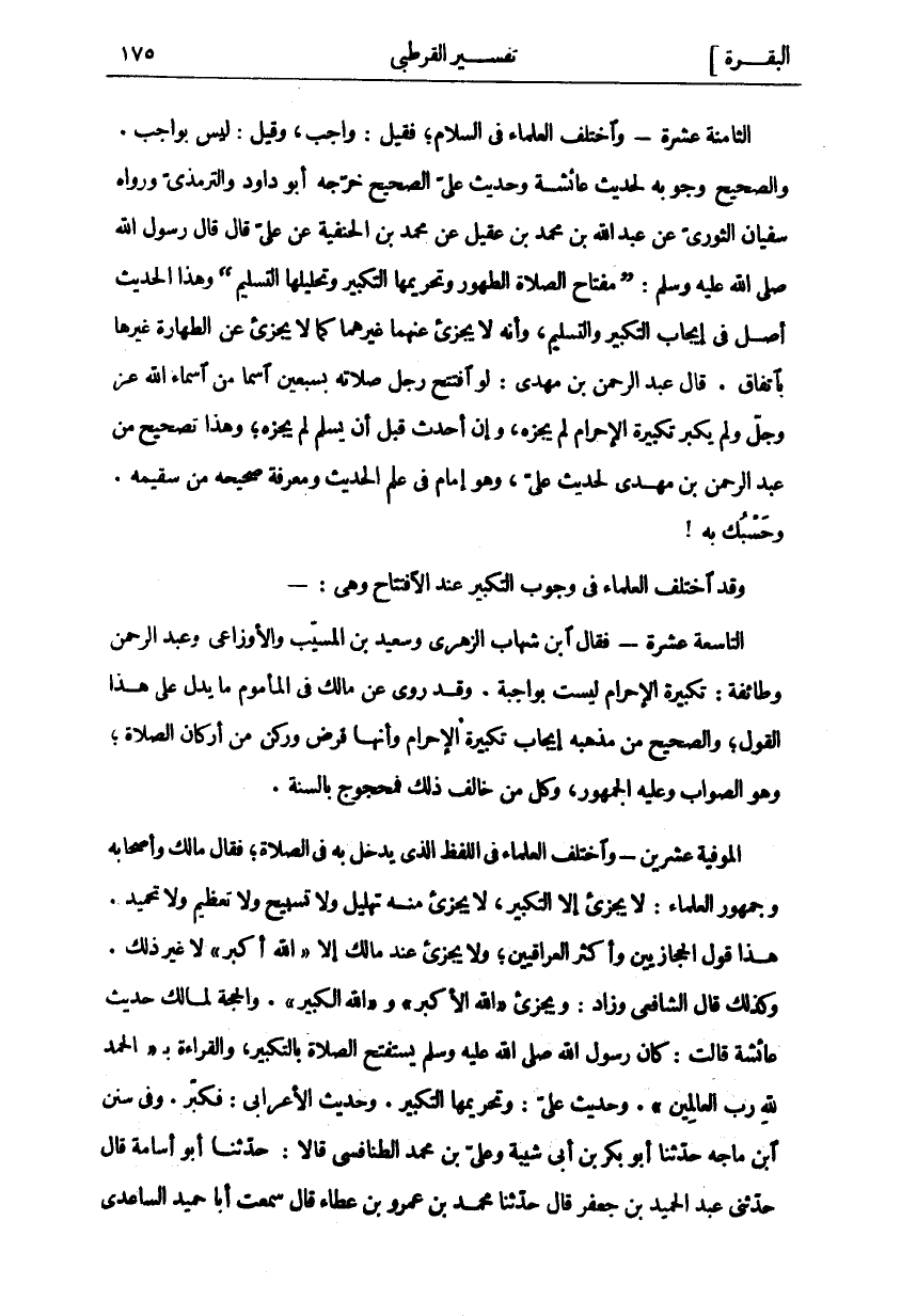 الثَّامِنَةَ عَشْرَةَ وَاخْتَلَفَ الْعُلَمَاءُ فِي السَّلَامِ، فَقِيلَ: وَاجِبٌ، وَقِيلَ: لَيْسَ بِوَاجِبٍ. وَالصَّحِيحُ وُجُوبُهُ لِحَدِيثِ عَائِشَةَ وَحَدِيثِ عَلِيٍّ الصَّحِيحِ خَرَّجَهُ أَبُو دَاوُدَ وَالتِّرْمِذِيُّ وَرَوَاهُ سُفْيَانُ الثَّوْرِيِّ عَنْ عَبْدِ اللَّهِ بْنِ مُحَمَّدِ بْنِ عَقِيلٍ عَنْ مُحَمَّدِ بْنِ الْحَنَفِيَّةِ عَنْ عَلِيٍّ قَالَ قَالَ رَسُولُ اللَّهِ صَلَّى اللَّهُ عَلَيْهِ وَسَلَّمَ:" مِفْتَاحُ الصَّلَاةِ الطَّهُورُ وَتَحْرِيمُهَا التَّكْبِيرُ وَتَحْلِيلُهَا التَّسْلِيمُ) وَهَذَا الْحَدِيثُ أَصْلٌ فِي إِيجَابِ التَّكْبِيرِ وَالتَّسْلِيمِ، وَأَنَّهُ لَا يُجْزِئُ عَنْهُمَا غَيْرُهُمَا كَمَا لَا يُجْزِئُ عَنِ الطَّهَارَةِ غَيْرُهَا بِاتِّفَاقٍ. قَالَ عَبْدُ الرَّحْمَنِ بْنُ مَهْدِيٍّ: لَوِ افْتَتَحَ رَجُلٌ صَلَاتَهُ بِسَبْعِينَ اسْمًا مِنْ أَسْمَاءِ اللَّهِ عَزَّ وَجَلَّ وَلَمْ يُكَبِّرْ تَكْبِيرَةَ الْإِحْرَامِ لَمْ يُجْزِهِ، وَإِنْ أَحْدَثَ قَبْلَ أَنْ يُسَلِّمَ لَمْ يُجْزِهِ، وَهَذَا تَصْحِيحٌ مِنْ عَبْدِ الرَّحْمَنِ بْنِ مَهْدِيٍّ لِحَدِيثِ عَلِيٍّ، وَهُوَ إِمَامٌ فِي عِلْمِ الْحَدِيثِ وَمَعْرِفَةِ صَحِيحِهِ مِنْ سَقِيمِهِ. وَحَسْبُكَ بِهِ! وَقَدِ اخْتَلَفَ الْعُلَمَاءُ فِي وُجُوبِ التَّكْبِيرِ عِنْدَ الِافْتِتَاحِ وَهِيَ: التَّاسِعَةَ عَشْرَةَ فَقَالَ ابْنُ شِهَابٍ الزُّهْرِيُّ وَسَعِيدُ بْنُ الْمُسَيَّبِ وَالْأَوْزَاعِيُّ وَعَبْدُ الرَّحْمَنِ وَطَائِفَةٌ: تَكْبِيرَةُ الْإِحْرَامِ لَيْسَتْ بِوَاجِبَةٍ. وَقَدْ رُوِيَ عَنْ مَالِكٍ فِي الْمَأْمُومِ مَا يَدُلُّ عَلَى هَذَا الْقَوْلِ، وَالصَّحِيحُ مِنْ مَذْهَبِهِ إِيجَابُ تَكْبِيرَةِ الْإِحْرَامِ وَأَنَّهَا فَرْضٌ وَرُكْنٌ مِنْ أَرْكَانِ الصَّلَاةِ، وَهُوَ الصَّوَابُ وَعَلَيْهِ الْجُمْهُورُ، وَكُلُّ مَنْ خَالَفَ ذَلِكَ فَمَحْجُوجٌ بِالسُّنَّةِ. الْمُوفِيَةُ عِشْرِينَ وَاخْتَلَفَ الْعُلَمَاءُ فِي اللَّفْظِ الَّذِي يَدْخُلُ بِهِ فِي الصَّلَاةِ، فَقَالَ مَالِكٌ وَأَصْحَابِهِ وَجُمْهُورُ الْعُلَمَاءِ: لَا يُجْزِئُ إِلَّا التَّكْبِيرُ، لَا يُجْزِئُ مِنْهُ تَهْلِيلٌ وَلَا تَسْبِيحٌ وَلَا تَعْظِيمٌ وَلَا تَحْمِيدٌ. هَذَا قَوْلُ الْحِجَازِيِّينَ وَأَكْثَرُ الْعِرَاقِيِّينَ، وَلَا يُجْزِئُ عِنْدَ مَالِكٍ إِلَّا" اللَّهُ أَكْبَرُ" لَا غَيْرَ ذَلِكَ. وَكَذَلِكَ قَالَ الشَّافِعِيُّ وَزَادَ: وَيُجْزِئُ" اللَّهُ الْأَكْبَرُ" وَ" اللَّهُ الْكَبِيرُ" وَالْحُجَّةُ لِمَالِكٍ حَدِيثُ عَائِشَةَ قَالَتْ: كَانَ رَسُولُ اللَّهِ صَلَّى اللَّهُ عَلَيْهِ وَسَلَّمَ يستفتح الصلاة بالتكبير، والقراءة ب" الْحَمْدُ لِلَّهِ رَبِّ الْعالَمِينَ". وَحَدِيثُ عَلِيٍّ: وَتَحْرِيمُهَا التَّكْبِيرُ. وَحَدِيثُ الْأَعْرَابِيِّ: فَكَبِّرْ. وَفِي سُنَنِ ابْنِ مَاجَهْ حَدَّثَنَا أَبُو بَكْرِ بْنُ أَبِي شَيْبَةَ وَعَلِيُّ بْنُ مُحَمَّدٍ الطَّنَافِسِيُّ قَالَا: حَدَّثَنَا أَبُو أُسَامَةَ قَالَ حَدَّثَنِي عَبْدُ الْحَمِيدِ بْنُ جَعْفَرٍ قَالَ حَدَّثَنَا مُحَمَّدُ بْنُ عَمْرِو بْنِ عَطَاءٍ قَالَ سَمِعْتُ أَبَا حُمَيْدٍ السَّاعِدِيَّ