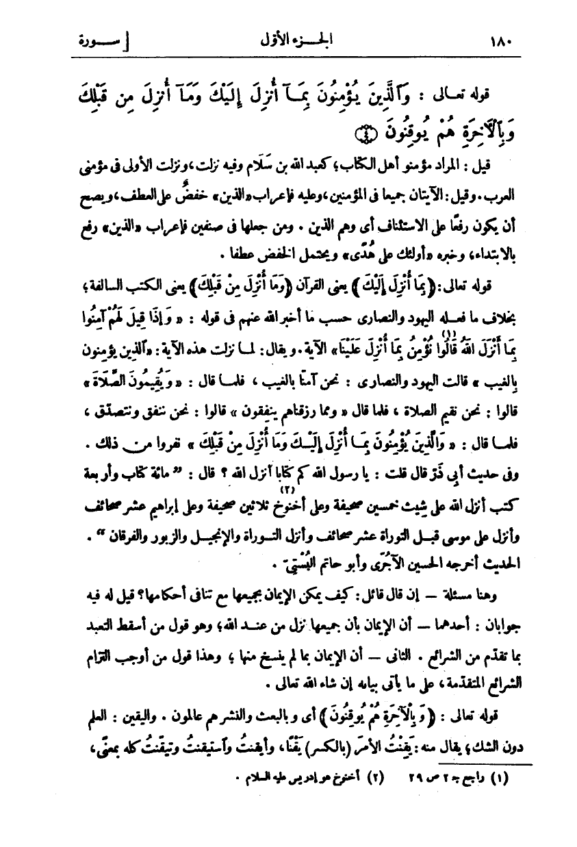 قِيلَ: الْمُرَادُ مُؤْمِنُو أَهْلِ الْكِتَابِ، كَعَبْدِ اللَّهِ بْنِ سَلَامٍ وَفِيهِ نَزَلَتْ، وَنَزَلَتِ الْأُولَى فِي مُؤْمِنِي الْعَرَبِ. وَقِيلَ: الْآيَتَانِ جَمِيعًا فِي الْمُؤْمِنِينَ، وَعَلَيْهِ فَإِعْرَابُ" الَّذِينَ" خَفْضٌ عَلَى الْعَطْفِ، وَيَصِحُّ أَنْ يَكُونَ رَفْعًا عَلَى الِاسْتِئْنَافِ أَيْ وَهُمُ الَّذِينَ. وَمَنْ جَعَلَهَا فِي صِنْفَيْنِ فَإِعْرَابُ" الَّذِينَ" رَفْعٌ بِالِابْتِدَاءِ، وَخَبَرُهُ" أُولئِكَ عَلى هُدىً" وَيُحْتَمَلُ الْخَفْضُ عَطْفًا. قَوْلُهُ تَعَالَى: (بِما أُنْزِلَ إِلَيْكَ) يَعْنِي الْقُرْآنَ (وَما أُنْزِلَ مِنْ قَبْلِكَ) يَعْنِي الْكُتُبَ السَّالِفَةَ، بِخِلَافِ مَا فَعَلَهُ الْيَهُودُ وَالنَّصَارَى حَسْبَ مَا أَخْبَرَ اللَّهُ عَنْهُمْ فِي قَوْلِهِ:" وَإِذا قِيلَ لَهُمْ آمِنُوا بِما أَنْزَلَ اللَّهُ «١» قالُوا نُؤْمِنُ بِما أُنْزِلَ عَلَيْنا" [البقرة: ٩١] الْآيَةَ. وَيُقَالُ: لَمَّا نَزَلَتْ هَذِهِ الْآيَةُ:" الَّذِينَ يُؤْمِنُونَ بِالْغَيْبِ" قَالَتِ الْيَهُودُ وَالنَّصَارَى: نَحْنُ آمَنَّا بالغيب، فلما قال:" وَيُقِيمُونَ الصَّلاةَ" [البقرة: ٣] قَالُوا: نَحْنُ نُقِيمُ الصَّلَاةَ، فَلَمَّا قَالَ" وَمِمَّا رَزَقْناهُمْ يُنْفِقُونَ" قَالُوا: نَحْنُ نُنْفِقُ وَنَتَصَدَّقُ، فَلَمَّا قَالَ:" وَالَّذِينَ يُؤْمِنُونَ بِما أُنْزِلَ إِلَيْكَ وَما أُنْزِلَ مِنْ قَبْلِكَ" نَفَرُوا مِنْ ذَلِكَ. وَفِي حَدِيثِ أَبِي ذَرٍّ قَالَ قُلْتُ: يَا رَسُولَ اللَّهِ كَمْ كِتَابًا أَنْزَلَ اللَّهُ؟ قَالَ: (مِائَةَ كِتَابٍ وَأَرْبَعَةَ كُتُبٍ أَنْزَلَ اللَّهُ عَلَى شِيثَ خمسين صحيفة وعلى أخنوخ (٢) ثَلَاثِينَ صَحِيفَةً وَعَلَى إِبْرَاهِيمَ عَشْرَ صَحَائِفَ وَأَنْزَلَ عَلَى مُوسَى قَبْلَ التَّوْرَاةِ عَشْرَ صَحَائِفَ وَأَنْزَلَ التَّوْرَاةَ وَالْإِنْجِيلَ وَالزَّبُورَ وَالْفُرْقَانَ (. الْحَدِيثَ أَخْرَجَهُ الْحُسَيْنُ الْآجُرِّيُّ وَأَبُو حَاتِمٍ الْبَسْتِيُّ. وَهُنَا مَسْأَلَةٌ: إِنْ قَالَ قَائِلٌ: كَيْفَ يُمْكِنُ الْإِيمَانُ بِجَمِيعِهَا مَعَ تَنَافِي أَحْكَامِهَا؟ قِيلَ لَهُ فِيهِ جَوَابَانِ: أَحَدُهُمَا أَنَّ الْإِيمَانَ بِأَنَّ جَمِيعَهَا نَزَلَ مِنْ عِنْدِ اللَّهِ، وَهُوَ قَوْلُ مَنْ أَسْقَطَ التَّعَبُّدَ بِمَا تَقَدَّمَ مِنَ الشَّرَائِعِ. الثَّانِي أَنَّ الْإِيمَانَ بِمَا لَمْ يُنْسَخْ مِنْهَا، وَهَذَا قَوْلُ مَنْ أَوْجَبَ التزام الشرائع المتقدمة، عَلَى مَا يَأْتِي بَيَانُهُ إِنْ شَاءَ اللَّهُ تَعَالَى. قَوْلُهُ تَعَالَى: (وَبِالْآخِرَةِ هُمْ يُوقِنُونَ) أَيْ وَبِالْبَعْثِ وَالنَّشْرِ هُمْ عَالِمُونَ. وَالْيَقِينُ: الْعِلْمُ دُونَ الشَّكِّ، يُقَالُ مِنْهُ: يَقِنْتُ الْأَمْرَ (بِالْكَسْرِ) يَقْنًا، وأيقنت واستيقنت وتيقنت كله بمعنى،