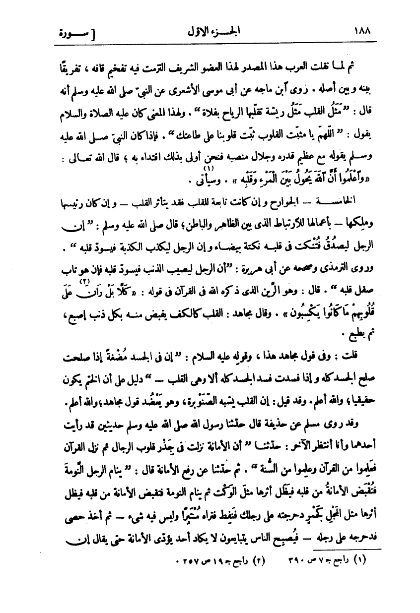 ثُمَّ لَمَّا نَقَلَتِ الْعَرَبُ هَذَا الْمَصْدَرَ لِهَذَا الْعُضْوِ الشَّرِيفِ الْتَزَمَتْ فِيهِ تَفْخِيمَ قَافِهِ، تَفْرِيقًا بَيْنَهُ وَبَيْنَ أَصْلِهِ. رَوَى ابْنُ مَاجَهْ عَنْ أَبِي مُوسَى الْأَشْعَرِيِّ عَنِ النَّبِيِّ صَلَّى اللَّهُ عَلَيْهِ وَسَلَّمَ أَنَّهُ قَالَ: (مَثَلُ الْقَلْبِ مَثَلُ رِيشَةٍ تُقَلِّبُهَا الرِّيَاحُ بِفَلَاةٍ). وَلِهَذَا الْمَعْنَى كَانَ عَلَيْهِ الصَّلَاةُ وَالسَّلَامُ يَقُولُ: (اللَّهُمَّ يَا مُثَبِّتَ الْقُلُوبِ ثَبِّتْ قُلُوبَنَا عَلَى طَاعَتِكَ). فَإِذَا كَانَ النَّبِيُّ صَلَّى اللَّهُ عَلَيْهِ وَسَلَّمَ يَقُولُهُ مَعَ عَظِيمِ قَدْرِهِ وَجَلَالِ مَنْصِبِهِ فَنَحْنُ أَوْلَى بِذَلِكَ اقْتِدَاءً بِهِ، قَالَ اللَّهُ تَعَالَى:" وَاعْلَمُوا أَنَّ اللَّهَ يَحُولُ بَيْنَ الْمَرْءِ وَقَلْبِهِ" [الأنفال: ٢٤]. وَسَيَأْتِي «١». الْخَامِسَةُ الْجَوَارِحُ وَإِنْ كَانَتْ تَابِعَةً لِلْقَلْبِ فَقَدْ يَتَأَثَّرُ الْقَلْبُ وَإِنْ كَانَ رَئِيسَهَا وَمَلِكَهَا بِأَعْمَالِهَا لِلِارْتِبَاطِ الَّذِي بَيْنَ الظَّاهِرِ وَالْبَاطِنِ، قَالَ صَلَّى اللَّهُ عَلَيْهِ وَسَلَّمَ: (إِنَّ الرَّجُلَ لَيَصْدُقُ فَتُنْكَتُ فِي قَلْبِهِ نُكْتَةٌ بَيْضَاءُ وَإِنَّ الرَّجُلَ لَيَكْذِبُ الْكَذْبَةَ فَيَسْوَدُّ قَلْبُهُ) وَرَوَى التِّرْمِذِيُّ وَصَحَّحَهُ عَنْ أَبِي هُرَيْرَةَ: (إِنَّ الرَّجُلَ لَيُصِيبُ الذَّنْبَ فَيَسْوَدُّ قَلْبُهُ فَإِنْ هُوَ تَابَ صُقِلَ قَلْبُهُ). قَالَ: وَهُوَ الرَّيْنُ الَّذِي ذَكَرَهُ اللَّهُ فِي الْقُرْآنِ فِي قَوْلُهُ:" كَلَّا بَلْ رانَ عَلى «٢» قُلُوبِهِمْ ما كانُوا يَكْسِبُونَ" [المطففين: ١٤]. وَقَالَ مُجَاهِدٌ: الْقَلْبُ كَالْكَفِّ يُقْبَضُ مِنْهُ بِكُلِ ذَنْبٍ إِصْبَعٌ، ثُمَّ يُطْبَعُ. قُلْتُ: وَفِي قَوْلِ مُجَاهِدٍ هَذَا، وَقَوْلِهِ عَلَيْهِ السَّلَامُ: (إِنَّ فِي الْجَسَدِ مُضْغَةً إِذَا صَلَحَتْ صَلَحَ الْجَسَدُ كُلُّهُ وَإِذَا فَسَدَتْ فَسَدَ الْجَسَدُ كُلُّهُ أَلَا وَهِيَ الْقَلْبُ) دَلِيلٌ عَلَى أَنَّ الْخَتْمَ يَكُونُ حَقِيقِيًّا، وَاللَّهُ أَعْلَمُ. وَقَدْ قِيلَ: إِنَّ الْقَلْبَ يُشْبِهُ الصَّنَوْبَرَةَ، وَهُوَ يَعْضُدُ قَوْلَ مُجَاهِدٍ، وَاللَّهُ أَعْلَمُ. وَقَدْ رَوَى مُسْلِمٌ عَنْ حُذَيْفَةَ قَالَ حَدَّثَنَا رَسُولُ اللَّهِ صَلَّى اللَّهُ عَلَيْهِ وَسَلَّمَ حَدِيثَيْنِ قَدْ رَأَيْتُ أَحَدَهُمَا وَأَنَا أَنْتَظِرُ الْآخَرَ: حَدَّثَنَا (أَنَّ الْأَمَانَةَ نَزَلَتْ فِي جَذْرِ قُلُوبِ الرِّجَالِ ثُمَّ نَزَلَ الْقُرْآنُ فَعَلِمُوا مِنَ الْقُرْآنِ وَعَلِمُوا مِنَ السُّنَّةِ). ثُمَّ حَدَّثَنَا عَنْ رَفْعِ الْأَمَانَةِ قَالَ: (يَنَامُ الرَّجُلُ النَّوْمَةَ فَتُقْبَضُ الْأَمَانَةُ مِنْ قَلْبِهِ فَيَظَلُّ أَثَرُهَا مِثْلَ الْوَكْتِ ثُمَّ يَنَامُ النَّوْمَةَ فَتُقْبَضُ الْأَمَانَةُ مِنْ قَلْبِهِ فَيَظَلُّ أَثَرُهَا مِثْلَ الْمَجْلِ كَجَمْرٍ دَحْرَجْتَهُ عَلَى رِجْلِكَ فَنَفِطَ فتراه منتبرا وليس فيه شي ثُمَّ أَخَذَ حَصًى فَدَحْرَجَهُ عَلَى رِجْلِهِ فَيُصْبِحُ النَّاسُ يَتَبَايَعُونَ لَا يَكَادُ أَحَدٌ يُؤَدِّي الْأَمَانَةَ حتى يقال إن