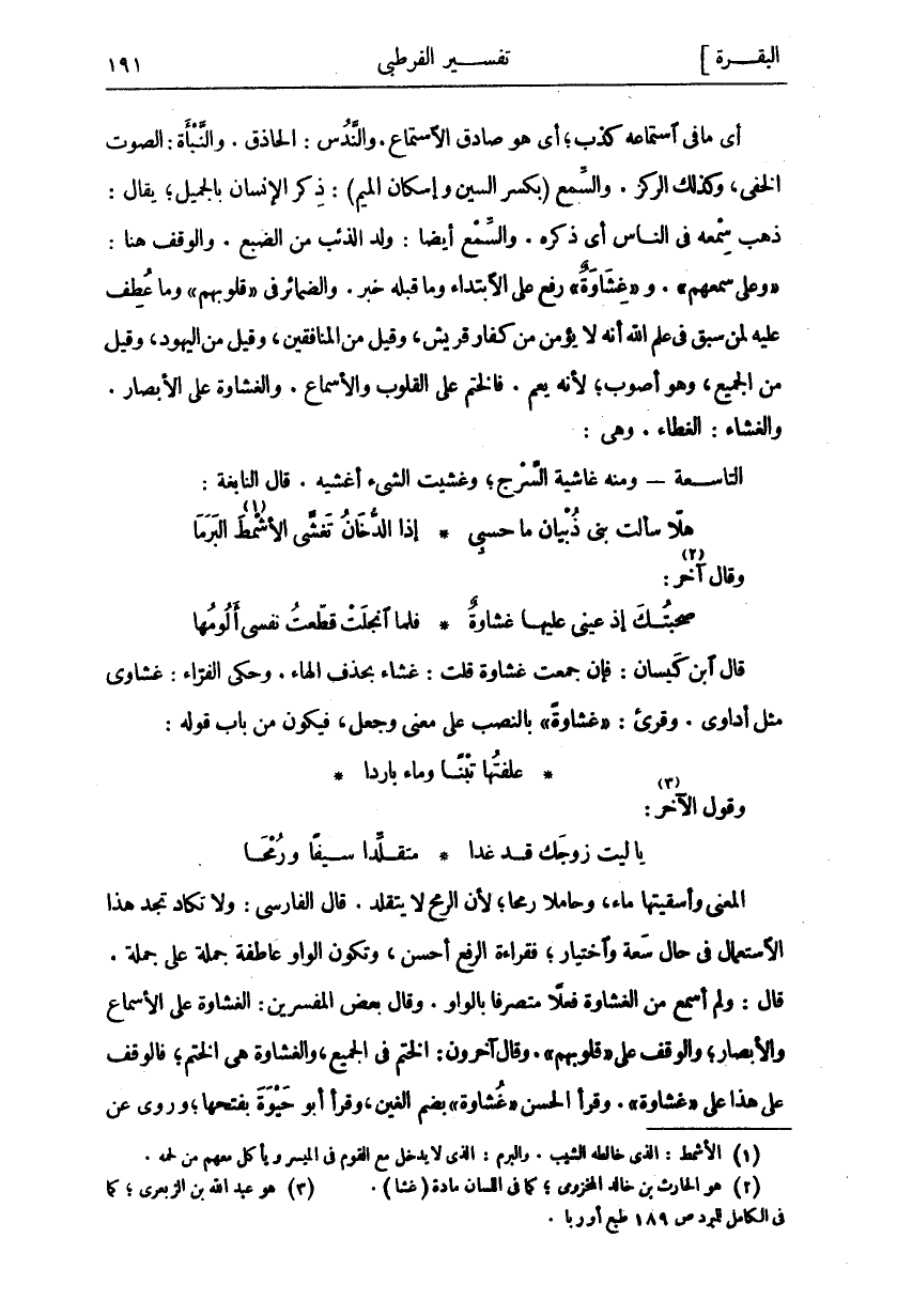 الْمَعْنَى وَأَسْقَيْتُهَا مَاءً، وَحَامِلًا رُمْحًا، لِأَنَّ الرُّمْحَ لَا يُتَقَلَّدُ. قَالَ الْفَارِسِيُّ: وَلَا تَكَادُ تَجِدُ هَذَا الِاسْتِعْمَالَ فِي حَالِ سَعَةٍ وَاخْتِيَارٍ، فَقِرَاءَةُ الرَّفْعِ أَحْسَنُ، وَتَكُونُ الْوَاوُ عَاطِفَةَ جُمْلَةٍ عَلَى جُمْلَةٍ. قَالَ: وَلَمْ أَسْمَعْ مِنَ الْغِشَاوَةِ فِعْلًا مُتَصَرِّفًا بِالْوَاوِ. وَقَالَ بَعْضُ الْمُفَسِّرِينَ: الْغِشَاوَةُ عَلَى الْأَسْمَاعِ وَالْأَبْصَارِ، وَالْوَقْفُ عَلَى" قُلُوبِهِمْ". وَقَالَ آخَرُونَ: الْخَتْمُ فِي الْجَمِيعِ، وَالْغِشَاوَةُ هِيَ الْخَتْمُ، فَالْوَقْفُ عَلَى هَذَا عَلَى" غِشاوَةٌ". وَقَرَأَ الحسن" غشاوة" بضم الغين، وقرا أبو حيوة بفتحها، وروي عن