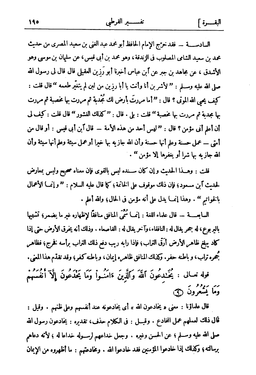السَّادِسَةُ فَقَدْ خَرَّجَ الْإِمَامُ الْحَافِظُ أَبُو مُحَمَّدٍ عَبْدُ الْغَنِيِّ بْنُ سَعِيدٍ الْمِصْرِيُّ مِنْ حَدِيثِ مُحَمَّدِ بْنِ سَعِيدٍ الشَّامِيِّ الْمَصْلُوبِ فِي الزَّنْدَقَةِ، وَهُوَ مُحَمَّدُ بْنُ أَبِي قَيْسٍ، عَنْ سُلَيْمَانَ بْنِ مُوسَى وَهُوَ الْأَشْدَقُ، عَنْ مُجَاهِدِ بْنِ جَبْرٍ عَنِ ابْنِ عَبَّاسٍ أَخْبَرَنَا أَبُو رَزِينٍ الْعُقَيْلِيُّ قَالَ قَالَ لِي رَسُولُ اللَّهِ صَلَّى اللَّهُ عَلَيْهِ وَسَلَّمَ: (لَأَشْرَبَنَّ أَنَا وَأَنْتَ يَا أَبَا رَزِينٍ مِنْ لَبَنٍ لَمْ يَتَغَيَّرْ طَعْمُهُ) قَالَ قُلْتُ: كَيْفَ يُحْيِي اللَّهُ الْمَوْتَى؟ قَالَ: (أَمَا مَرَرْتَ بِأَرْضٍ لَكَ مُجْدِبَةٍ ثُمَّ مَرَرْتَ بِهَا مُخْصِبَةً ثُمَّ مَرَرْتَ بِهَا مُجْدِبَةً ثُمَّ مَرَرْتَ بِهَا مُخْصِبَةً) قُلْتُ: بَلَى. قَالَ: (كَذَلِكَ النُّشُورُ) قَالَ قُلْتُ: كَيْفَ لِي أَنْ أَعْلَمَ أَنِّي مُؤْمِنٌ؟ قَالَ: (لَيْسَ أَحَدٌ مِنْ هَذِهِ الْأُمَّةِ قَالَ ابْنُ أَبِي قَيْسٍ: أَوْ قَالَ مِنْ أُمَّتِي عَمِلَ حَسَنَةً وَعَلِمَ أَنَّهَا حَسَنَةٌ وَأَنَّ اللَّهَ جَازِيهِ بِهَا خَيْرًا أَوْ عَمِلَ سَيِّئَةً وَعَلِمَ أَنَّهَا سَيِّئَةٌ وَأَنَّ اللَّهَ جَازِيهِ بِهَا شَرًّا أَوْ يَغْفِرُهَا إِلَّا مُؤْمِنٌ (. قُلْتُ: وَهَذَا الْحَدِيثُ وَإِنْ كَانَ سَنَدُهُ لَيْسَ بِالْقَوِيِّ فَإِنَّ مَعْنَاهُ صَحِيحٌ وَلَيْسَ بِمُعَارِضٍ لِحَدِيثِ ابْنِ مَسْعُودٍ، فَإِنَّ ذَلِكَ مَوْقُوفٌ عَلَى الْخَاتِمَةِ، كَمَا قَالَ عَلَيْهِ السَّلَامُ: (وَإِنَّمَا الْأَعْمَالُ بِالْخَوَاتِيمِ). وَهَذَا إِنَّمَا يَدُلُّ عَلَى أَنَّهُ مُؤْمِنٌ فِي الْحَالِ، وَاللَّهُ أَعْلَمُ. السَّابِعَةُ: قَالَ عُلَمَاءُ اللُّغَةِ: إِنَّمَا سُمِّيَ الْمُنَافِقُ مُنَافِقًا لِإِظْهَارِهِ غَيْرَ مَا يُضْمِرُ، تَشْبِيهًا بِالْيَرْبُوعِ، لَهُ جُحْرٌ يُقَالُ لَهُ: النَّافِقَاءُ، وَآخَرُ يُقَالُ لَهُ: الْقَاصِعَاءُ. وَذَلِكَ أَنَّهُ يَخْرِقُ الْأَرْضَ حَتَّى إِذَا كَادَ يَبْلُغُ ظَاهِرَ الْأَرْضِ أَرَقَّ التُّرَابَ، فَإِذَا رَابَهُ رَيْبٌ دَفَعَ ذَلِكَ التُّرَابَ بِرَأْسِهِ فَخَرَجَ، فَظَاهِرُ جُحْرِهِ تُرَابٌ، وَبَاطِنُهُ حَفْرٌ. وَكَذَلِكَ الْمُنَافِقُ ظَاهِرُهُ إِيمَانٌ، وَبَاطِنُهُ كُفْرٌ، وقد تقدم هذا المعنى.