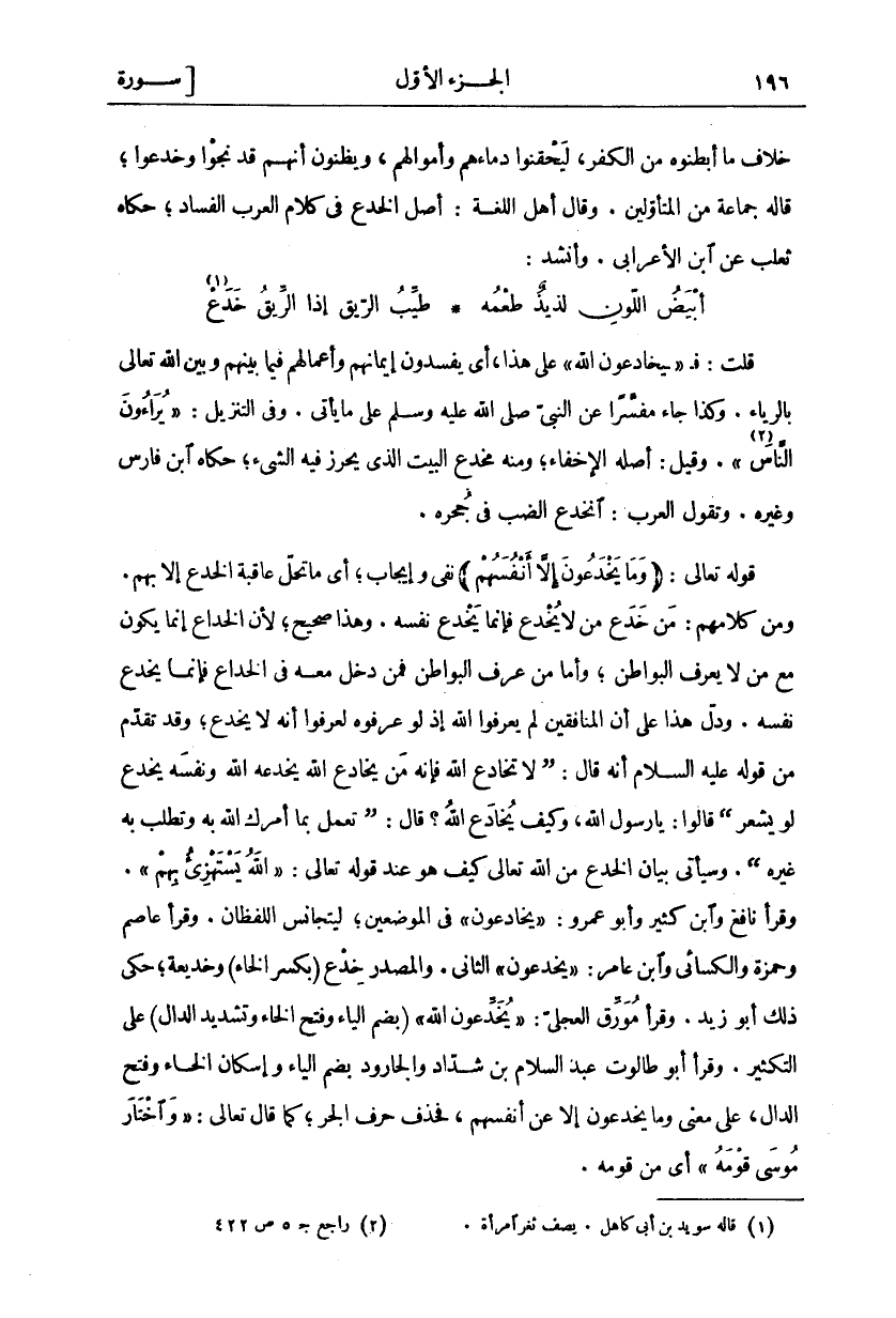 «٢» ". [النساء: ١٤٢] وَقِيلَ: أَصْلُهُ الْإِخْفَاءُ، وَمِنْهُ مَخْدَعُ الْبَيْتِ الَّذِي يُحْرَزُ فِيهِ الشَّيْءُ، حَكَاهُ ابْنُ فَارِسٍ وَغَيْرُهُ. وَتَقُولُ الْعَرَبُ: انْخَدَعَ الضَّبُّ فِي جُحْرِهِ. قَوْلُهُ تَعَالَى: (وَما يَخْدَعُونَ إِلَّا أَنْفُسَهُمْ) نَفْيٌ وَإِيجَابٌ، أَيْ مَا تَحِلُّ عَاقِبَةُ الْخَدْعِ إِلَّا بِهِمْ. وَمِنْ كَلَامِهِمْ: مَنْ خَدَعَ مَنْ لَا يُخْدَعُ فَإِنَّمَا يَخْدَعُ نَفْسَهُ. وَهَذَا صَحِيحٌ، لِأَنَّ الْخِدَاعَ إِنَّمَا يَكُونُ مَعَ مَنْ لَا يَعْرِفُ الْبَوَاطِنَ، وَأَمَّا مَنْ عَرَفَ الْبَوَاطِنَ فَمَنْ دَخَلَ مَعَهُ فِي الْخِدَاعِ فَإِنَّمَا يَخْدَعُ نَفْسَهُ. وَدَلَّ هَذَا عَلَى أَنَّ الْمُنَافِقِينَ لَمْ يَعْرِفُوا اللَّهَ إِذْ لَوْ عَرَفُوهُ لَعَرَفُوا أَنَّهُ لَا يُخْدَعُ، وَقَدْ تَقَدَّمَ مِنْ قَوْلِهِ عَلَيْهِ السَّلَامُ أَنَّهُ قَالَ: (لا تخادع الله فإنه من يخادع الله يَخْدَعُهُ اللَّهُ وَنَفْسَهُ يَخْدَعُ لَوْ يَشْعُرُ) قَالُوا: يَا رَسُولَ اللَّهِ، وَكَيْفَ يُخَادِعُ اللَّهَ؟ قَالَ: (تَعْمَلُ بِمَا أَمَرَكَ اللَّهُ بِهِ وَتَطْلُبُ بِهِ غَيْرَهُ). وَسَيَأْتِي بَيَانُ الْخِدْعِ مِنَ اللَّهِ تَعَالَى كَيْفَ هُوَ عِنْدَ قَوْلِهِ تَعَالَى:" اللَّهُ يَسْتَهْزِئُ بِهِمْ" [البقرة: ١٥]. وَقَرَأَ نَافِعٌ وَابْنُ كَثِيرٍ وَأَبُو عَمْرٍو:" يُخَادِعُونَ" فِي الْمَوْضِعَيْنِ، لِيَتَجَانَسَ اللَّفْظَانِ. وَقَرَأَ عَاصِمٌ وَحَمْزَةُ وَالْكِسَائِيُّ وَابْنُ عَامِرٍ:" يَخْدَعُونَ" الثَّانِي. وَالْمَصْدَرُ خِدْعٌ (بِكَسْرِ الْخَاءِ) وَخَدِيعَةٌ، حَكَى ذَلِكَ أَبُو زَيْدٍ. وَقَرَأَ مُوَرِّقٌ الْعِجْلِيُّ:" يُخَدِّعُونَ اللَّهَ" (بِضَمِّ الْيَاءِ وَفَتْحِ الْخَاءِ وَتَشْدِيدِ الدَّالِ) عَلَى التَّكْثِيرِ. وَقَرَأَ أَبُو طَالُوتَ عَبْدُ السَّلَامِ بْنُ شَدَّادٍ وَالْجَارُودُ بِضَمِّ الْيَاءِ وَإِسْكَانِ الْخَاءِ وَفَتْحِ الدَّالِ، عَلَى مَعْنَى وَمَا يُخْدَعُونَ إِلَّا عَنْ أَنْفُسِهِمْ، فَحَذَفَ حَرْفَ الْجَرِّ، كَمَا قَالَ تَعَالَى:" وَاخْتارَ مُوسى قَوْمَهُ" [الأعراف: ١٥٥] أي من قومه.