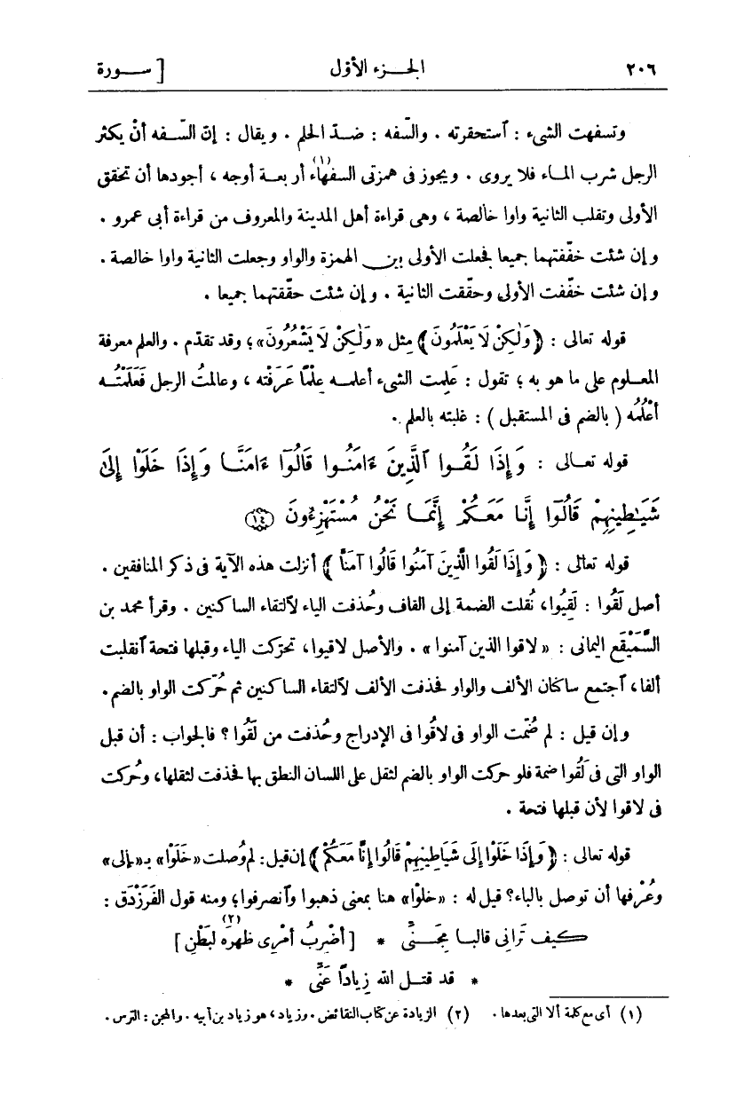 قوله تعالى: (وَإِذا لَقُوا الَّذِينَ آمَنُوا قالُوا آمَنَّا) أُنْزِلَتْ هَذِهِ الْآيَةُ فِي ذِكْرِ الْمُنَافِقِينَ. أَصْلُ لَقُوا: لَقِيُوا، نُقِلَتِ الضَّمَّةُ إِلَى الْقَافِ وَحُذِفَتِ الْيَاءُ لِالْتِقَاءِ السَّاكِنَيْنِ. وَقَرَأَ مُحَمَّدُ بْنُ السَّمَيْقَعِ الْيَمَانِيُّ:" لَاقَوُا الَّذِينَ آمَنُوا". وَالْأَصْلُ لَاقَيُوا، تَحَرَّكَتِ الْيَاءُ وَقَبْلَهَا فَتْحَةٌ انْقَلَبَتْ أَلِفًا، اجْتَمَعَ سَاكِنَانِ الْأَلِفُ وَالْوَاوُ فَحُذِفَتِ الْأَلِفُ لِالْتِقَاءِ السَّاكِنَيْنِ ثم حركت الواو بالضم. وإن فيل: لِمَ ضُمَّتِ الْوَاوُ فِي لَاقَوُا فِي الْإِدْرَاجِ وَحُذِفَتْ مِنْ لَقُوا؟ فَالْجَوَابُ: أَنَّ قَبْلَ الْوَاوِ الَّتِي فِي لَقُوا ضَمَّةً فَلَوْ حُرِّكَتِ الْوَاوُ بِالضَّمِّ لَثَقُلَ عَلَى اللِّسَانِ النُّطْقُ بِهَا فَحُذِفَتْ لِثِقَلِهَا، وَحُرِّكَتْ فِي لَاقَوُا لِأَنَّ قَبْلَهَا فَتْحَةً. قَوْلُهُ تَعَالَى: (وَإِذا خَلَوْا إِلى شَياطِينِهِمْ قالُوا إِنَّا مَعَكُمْ) إِنْ قِيلَ: لِمَ وُصِلَتْ" خَلَوْا" بِ" إِلَى" وَعُرْفُهَا أَنْ تُوصَلَ بِالْبَاءِ؟ قِيلَ لَهُ:" خَلَوْا" هُنَا بِمَعْنَى ذَهَبُوا وَانْصَرَفُوا، وَمِنْهُ قَوْلُ الْفَرَزْدَقِ: