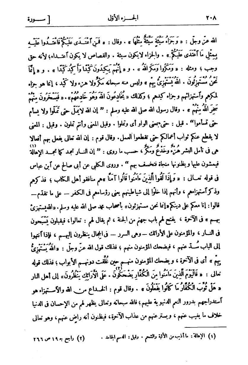 اللَّهُ عَزَّ وَجَلَّ:" وَجَزاءُ سَيِّئَةٍ سَيِّئَةٌ مِثْلُها" [الشورى: ٤٠]. وَقَالَ:" فَمَنِ اعْتَدى عَلَيْكُمْ فَاعْتَدُوا عَلَيْهِ بِمِثْلِ مَا اعْتَدى عَلَيْكُمْ" [البقرة: ١٩٤]. وَالْجَزَاءُ لَا يَكُونُ سَيِّئَةً. وَالْقِصَاصُ لَا يَكُونُ اعْتِدَاءً، لِأَنَّهُ حَقٌّ وَجَبَ، وَمِثْلُهُ:" وَمَكَرُوا وَمَكَرَ اللَّهُ" [آل عمران: ٥٤]. و" إِنَّهُمْ يَكِيدُونَ كَيْداً وَأَكِيدُ كَيْداً" [الطارق: ١٦ ١٥]. و" إِنَّما نَحْنُ مُسْتَهْزِؤُنَ ... اللَّهُ يَسْتَهْزِئُ بِهِمْ" وَلَيْسَ مِنْهُ سُبْحَانَهُ مَكْرٌ وَلَا هُزْءٌ وُلَا كَيْدٌ، إِنَّمَا هُوَ جَزَاءٌ لِمَكْرِهِمْ وَاسْتِهْزَائِهِمْ وَجَزَاءُ كَيْدِهِمْ، وَكَذَلِكَ" يُخادِعُونَ اللَّهَ وَهُوَ خادِعُهُمْ