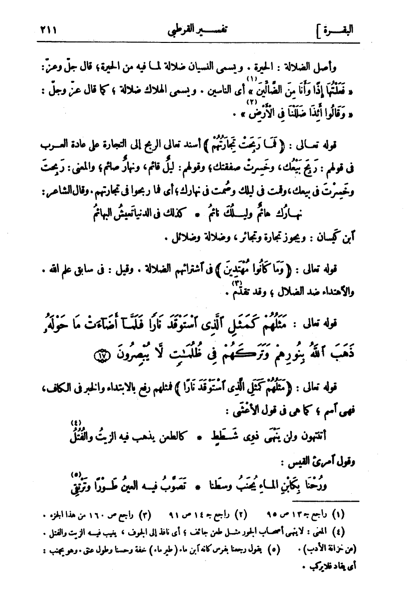 وَأَصْلُ الضَّلَالَةِ: الْحَيْرَةُ. وَيُسَمَّى النِّسْيَانُ ضَلَالَةً لِمَا فيه من الحيرة، قال عز وجل:" فَعَلْتُها إِذاً وَأَنَا مِنَ الضَّالِّينَ" «١» [الشعراء: ٢٠] أَيِ النَّاسِينَ. وَيُسَمَّى الْهَلَاكُ ضَلَالَةً، كَمَا قَالَ عز وجل:" وَقالُوا أَإِذا ضَلَلْنا فِي الْأَرْضِ «٢» " [السجدة: ١٠]. قَوْلُهُ تَعَالَى: (فَما رَبِحَتْ تِجارَتُهُمْ) أَسْنَدَ تَعَالَى الرِّبْحَ إِلَى التِّجَارَةِ عَلَى عَادَةِ الْعَرَبِ فِي قَوْلِهِمْ: رَبِحَ بَيْعُكَ، وَخَسِرَتْ صَفْقَتُكَ، وَقَوْلُهُمْ: لَيْلٌ قَائِمٌ، وَنَهَارٌ صَائِمٌ، وَالْمَعْنَى: رَبِحْتَ وَخَسِرْتَ فِي بَيْعِكَ، وَقُمْتَ فِي لَيْلِكَ وَصُمْتَ فِي نَهَارِكَ، أَيْ فَمَا رَبِحُوا فِي تِجَارَتِهِمْ. وَقَالَ الشَّاعِرُ: