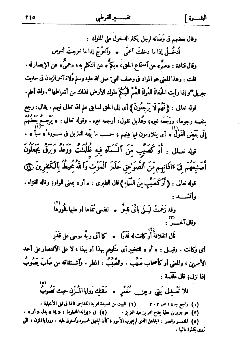 قَوْلُهُ تَعَالَى (أَوْ كَصَيِّبٍ مِنَ السَّماءِ) قَالَ الطَّبَرِيُّ:" أَوْ" بِمَعْنَى الْوَاوِ، وَقَالَهُ الْفَرَّاءُ. وَأَنْشَدَ: