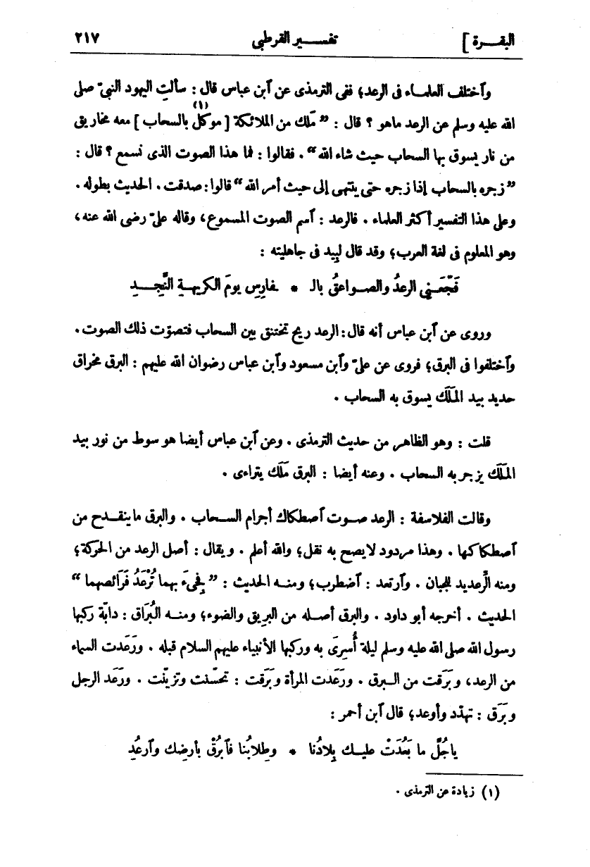 وَرُوِيَ عَنِ ابْنِ عَبَّاسٍ أَنَّهُ قَالَ: الرَّعْدُ رِيحٌ تَخْتَنِقُ بَيْنَ السَّحَابِ فَتُصَوِّتُ ذَلِكَ الصَّوْتَ. وَاخْتَلَفُوا فِي الْبَرْقِ، فَرُوِيَ عَنْ عَلِيٍّ وَابْنِ مَسْعُودٍ وَابْنِ عَبَّاسٍ رِضْوَانُ اللَّهِ عَلَيْهِمْ: الْبَرْقُ مِخْرَاقٌ حَدِيدٌ بِيَدِ الْمَلَكِ يَسُوقُ بِهِ السَّحَابَ. قُلْتُ: وَهُوَ الظَّاهِرُ مِنْ حَدِيثِ التِّرْمِذِيِّ. وَعَنِ ابْنِ عَبَّاسٍ أَيْضًا هُوَ سَوْطٌ مِنْ نُورٍ بِيَدِ الْمَلَكِ يَزْجُرُ بِهِ السَّحَابَ. وَعَنْهُ أَيْضًا الْبَرْقُ مَلَكٌ يَتَرَاءَى. وَقَالَتِ الْفَلَاسِفَةُ: الرَّعْدُ صَوْتُ اصْطِكَاكِ أَجْرَامِ السَّحَابِ. وَالْبَرْقُ مَا يَنْقَدِحُ مِنَ اصْطِكَاكِهَا. وَهَذَا مَرْدُودٌ لَا يَصِحُّ بِهِ نَقْلٌ، وَاللَّهُ أَعْلَمُ. وَيُقَالُ: أَصْلُ الرَّعْدِ مِنَ الْحَرَكَةِ، وَمِنْهُ الرعديد للجبان. وارتعد: اضطرب، ومنه الحديث: (فجئ بِهِمَا تُرْعَدُ فَرَائِصُهُمَا) الْحَدِيثَ. أَخْرَجَهُ أَبُو دَاوُدَ. وَالْبَرْقُ أَصْلُهُ مِنَ الْبَرِيقِ وَالضَّوْءِ، وَمِنْهُ الْبُرَاقُ: دَابَّةٌ رَكِبَهَا رَسُولُ اللَّهِ صَلَّى اللَّهُ عَلَيْهِ وَسَلَّمَ لَيْلَةَ أُسْرِيَ بِهِ وَرَكِبَهَا الْأَنْبِيَاءُ عَلَيْهِمُ السَّلَامُ قَبْلَهُ. وَرَعَدَتِ السَّمَاءُ مِنَ الرَّعْدِ، وَبَرَقَتْ مِنَ الْبَرْقِ. وَرَعَدَتِ الْمَرْأَةُ وَبَرَقَتْ: تَحَسَّنَتْ وَتَزَيَّنَتْ. وَرَعَدَ الرَّجُلُ وَبَرَقَ: تَهَدَّدَ وَأَوْعَدَ، قَالَ ابْنُ أَحْمَرَ: