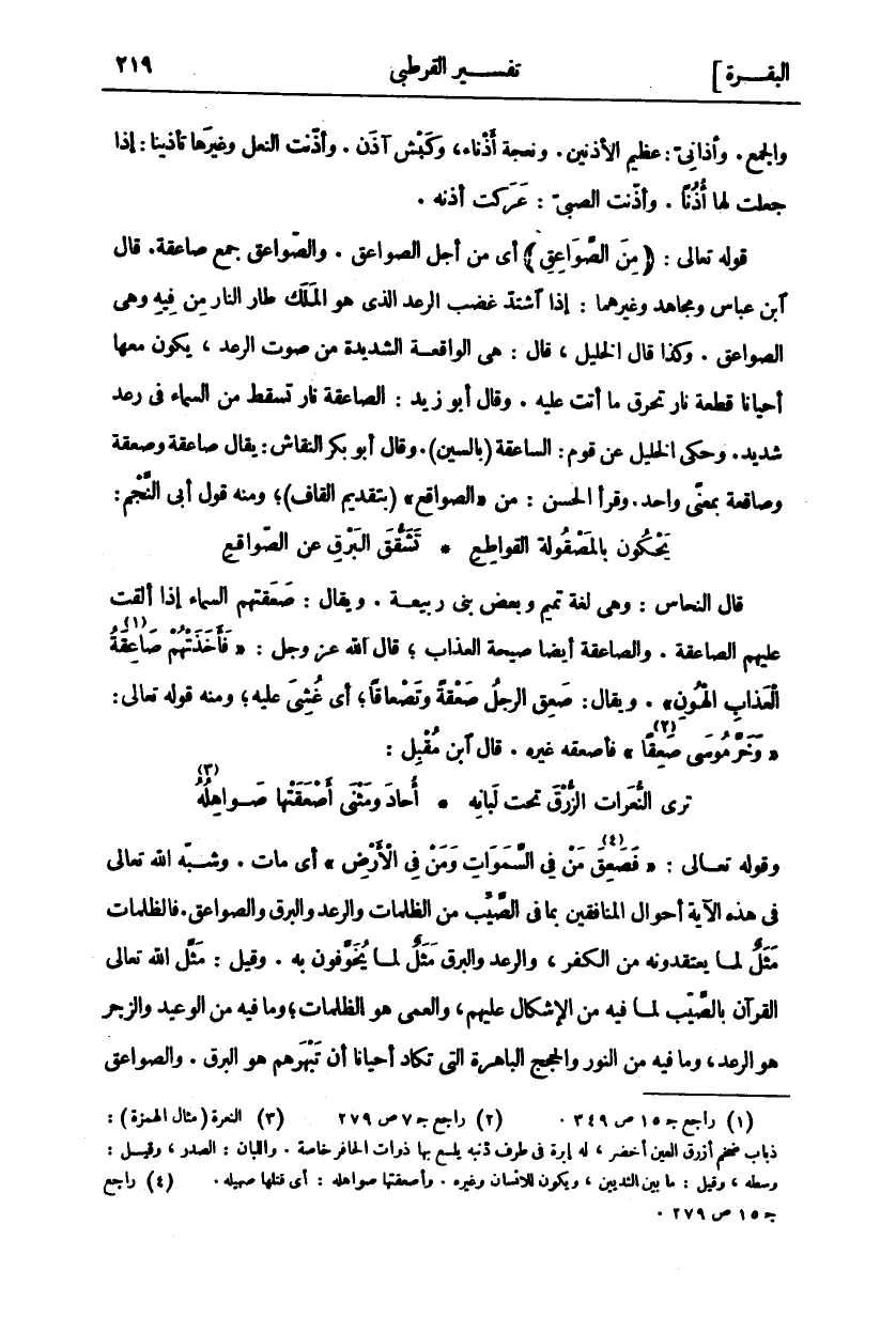 وَالْجَمْعُ. وَأَذَانِيٌّ: عَظِيمُ الْأُذُنَيْنِ. وَنَعْجَةٌ أَذْنَاءُ، وَكَبْشٌ آذَنُ. وَأَذَّنْتَ النَّعْلَ وَغَيْرَهَا تَأْذِينًا: إِذَا جَعَلْتَ لَهَا أُذُنًا. وَأَذَّنْتَ الصَّبِيَّ: عَرَكْتَ أُذُنَهُ. قَوْلُهُ تَعَالَى: (مِنَ الصَّواعِقِ) أَيْ مِنْ أَجْلِ الصَّوَاعِقِ. وَالصَّوَاعِقُ جَمْعُ صَاعِقَةٍ. قَالَ ابْنُ عَبَّاسٍ وَمُجَاهِدٌ وَغَيْرُهُمَا: إِذَا اشْتَدَّ غَضَبُ الرَّعْدِ الَّذِي هُوَ الْمَلَكُ طَارَ النَّارُ مِنْ فِيهِ وَهِيَ الصَّوَاعِقُ. وَكَذَا قَالَ الْخَلِيلُ، قَالَ: هِيَ الْوَاقِعَةُ الشَّدِيدَةُ مِنْ صَوْتِ الرَّعْدِ، يَكُونُ مَعَهَا أَحْيَانًا قِطْعَةُ نَارٍ تَحْرِقُ مَا أَتَتْ عَلَيْهِ. وَقَالَ أَبُو زَيْدٍ: الصَّاعِقَةُ نَارٌ تَسْقُطُ مِنَ السَّمَاءِ فِي رَعْدٍ شَدِيدٍ. وَحَكَى الْخَلِيلُ عَنْ قَوْمٍ: السَّاعِقَةُ (بِالسِّينِ). وَقَالَ أَبُو بَكْرٍ النَّقَّاشُ: يُقَالُ صَاعِقَةٌ وصعقة وصاعقة بِمَعْنًى وَاحِدٍ. وَقَرَأَ الْحَسَنُ: مِنْ" الصَّوَاقِعِ" (بِتَقْدِيمِ الْقَافِ)، وَمِنْهُ قَوْلُ أَبِي النَّجْمِ: