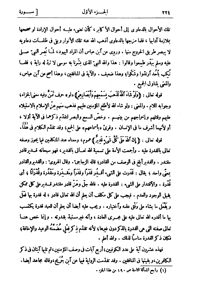 تِلْكَ الْأَحْوَالِ بِالدَّعَاوِي إِلَى أَحْوَالِ الْأَكَابِرِ، كَأَنْ تُضِيءُ عَلَيْهِ أَحْوَالُ الْإِرَادَةِ لَوْ صَحَّحَهَا بِمُلَازَمَةِ آدَابِهَا، فَلَمَّا مَزَجَهَا بِالدَّعَاوِي أَذْهَبَ اللَّهُ عَنْهُ تِلْكَ الْأَنْوَارَ وَبَقِيَ فِي ظُلُمَاتِ دَعَاوِيهِ لَا يُبْصِرُ طَرِيقَ الْخُرُوجِ مِنْهَا. وَرُوِيَ عَنِ ابْنِ عَبَّاسٍ أَنَّ الْمُرَادَ الْيَهُودُ، لَمَّا نُصِرَ النَّبِيُّ صَلَّى اللَّهُ عَلَيْهِ وَسَلَّمَ بِبَدْرٍ طَمِعُوا وَقَالُوا: هَذَا وَاللَّهِ النَّبِيُّ الَّذِي بَشَّرَنَا بِهِ مُوسَى لَا تُرَدُّ لَهُ رَايَةٌ، فَلَمَّا نُكِبَ بِأُحُدٍ ارْتَدُّوا وَشَكُّوا، وَهَذَا ضَعِيفٌ. وَالْآيَةُ فِي الْمُنَافِقِينَ، وَهَذَا أَصَحُّ عَنِ ابْنِ عَبَّاسٍ، وَالْمَعْنَى يَتَنَاوَلُ الْجَمِيعَ. قَوْلُهُ تَعَالَى: (وَلَوْ شاءَ اللَّهُ لَذَهَبَ بِسَمْعِهِمْ وَأَبْصارِهِمْ) ... " لَوْ" حَرْفُ تَمَنٍّ وَفِيهِ مَعْنَى الْجَزَاءِ، وَجَوَابُهُ اللَّامُ. وَالْمَعْنَى: وَلَوْ شَاءَ اللَّهُ لَأَطْلَعَ الْمُؤْمِنِينَ عَلَيْهِمْ فَذَهَبَ مِنْهُمْ عِزُّ الْإِسْلَامِ بِالِاسْتِيلَاءِ عَلَيْهِمْ وَقَتْلِهِمْ وَإِخْرَاجِهِمْ مِنْ بَيْنِهِمْ. وَخُصَّ السَّمْعُ وَالْبَصَرُ لِتَقَدُّمِ ذِكْرِهِمَا فِي الْآيَةِ أَوَّلًا، أو لأنهما أشرف ما في الإنسان. وقرى" بِأَسْمَاعِهِمْ" عَلَى الْجَمْعِ، وَقَدْ تَقَدَّمَ الْكَلَامُ فِي هَذَا «١». قَوْلُهُ تَعَالَى: (إِنَّ اللَّهَ عَلى كُلِّ شَيْءٍ قَدِيرٌ) عُمُومٌ، وَمَعْنَاهُ عِنْدَ الْمُتَكَلِّمِينَ فِيمَا يَجُوزُ وَصْفُهُ تَعَالَى بِالْقُدْرَةِ عَلَيْهِ. وَأَجْمَعَتِ الْأُمَّةُ عَلَى تَسْمِيَةِ اللَّهِ تَعَالَى بِالْقَدِيرِ، فَهُوَ سُبْحَانَهُ قَدِيرٌ قَادِرٌ مُقْتَدِرٌ. وَالْقَدِيرُ أَبْلَغُ فِي الْوَصْفِ مِنَ الْقَادِرِ، قَالَهُ الزَّجَّاجِيُّ. وَقَالَ الْهَرَوِيُّ: وَالْقَدِيرُ وَالْقَادِرُ بِمَعْنًى وَاحِدٍ، يُقَالُ: قَدَرْتُ عَلَى الشَّيْءِ أقدر قدرا وقدرا ومقدرة ومقدرة وَقُدْرَانًا، أَيْ قُدْرَةً. وَالِاقْتِدَارُ عَلَى الشَّيْءِ: الْقُدْرَةُ عليه. فالله عز وجل قَادِرٌ مُقْتَدِرٌ قَدِيرٌ عَلَى كُلِّ مُمْكِنٍ يَقْبَلُ الْوُجُودَ وَالْعَدَمَ. فَيَجِبُ عَلَى كُلِّ مُكَلَّفٍ أَنْ يَعْلَمَ أَنَّ اللَّهَ تَعَالَى قَادِرٌ، لَهُ قُدْرَةٌ بِهَا فَعَلَ وَيَفْعَلُ مَا يَشَاءُ عَلَى وَفْقِ عِلْمِهِ وَاخْتِيَارِهِ. وَيَجِبُ عَلَيْهِ أَيْضًا أَنْ يَعْلَمَ أَنَّ لِلْعَبْدِ قُدْرَةً يَكْتَسِبُ بِهَا مَا أَقْدَرَهُ اللَّهُ تَعَالَى عَلَيْهِ عَلَى مَجْرَى الْعَادَةِ، وَأَنَّهُ غَيْرُ مُسْتَبِدٍّ بِقُدْرَتِهِ. وَإِنَّمَا خَصَّ هُنَا تَعَالَى صِفَتَهُ الَّتِي هِيَ الْقُدْرَةُ بِالذِّكْرِ دُونَ غَيْرِهَا، لِأَنَّهُ تَقَدَّمَ ذِكْرُ فِعْلٍ مُضَمَّنُهُ الْوَعِيدُ وَالْإِخَافَةُ، فَكَانَ ذِكْرُ الْقُدْرَةِ مُنَاسِبًا لِذَلِكَ. وَاللَّهُ أَعْلَمُ. فَهَذِهِ عِشْرُونَ آيَةً عَلَى عَدَدِ الْكُوفِيِّينَ، أَرْبَعُ آيَاتٍ فِي وَصْفِ الْمُؤْمِنِينَ، ثُمَّ تَلِيهَا آيَتَانِ فِي ذِكْرِ الْكَافِرِينَ، وَبَقِيَّتُهَا فِي الْمُنَافِقِينَ. وَقَدْ تَقَدَّمَتِ الرِّوَايَةُ فِيهَا عَنِ ابْنِ جُرَيْجٍ، وَقَالَهُ مجاهد أيضا.