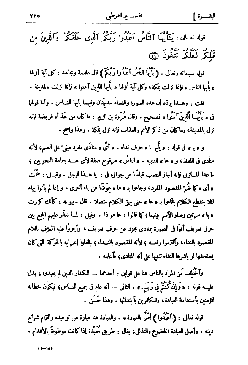 قَوْلُهُ سُبْحَانَهُ وتعالى: (يا أَيُّهَا النَّاسُ اعْبُدُوا رَبَّكُمُ) قَالَ عَلْقَمَةُ وَمُجَاهِدٌ: كُلُّ آيَةٍ أَوَّلُهَا" يَا أَيُّهَا النَّاسُ" فَإِنَّمَا نَزَلَتْ بِمَكَّةَ، وَكُلِّ آيَةٍ أَوَّلُهَا" يَا أَيُّهَا الَّذِينَ آمَنُوا" فَإِنَّمَا نَزَلَتْ بِالْمَدِينَةِ. قُلْتُ: وَهَذَا يَرُدُّهُ أَنَّ هَذِهِ السُّورَةَ وَالنِّسَاءَ مَدَنِيَّتَانِ وَفِيهِمَا يَا أَيُّهَا النَّاسُ. وَأَمَّا قولهما في" يا أَيُّهَا الَّذِينَ آمَنُوا" [النساء: ١٩] فَصَحِيحٌ. وَقَالَ عُرْوَةُ بْنُ الزُّبَيْرِ: مَا كَانَ مِنْ حَدٍّ أَوْ فَرِيضَةٍ فَإِنَّهُ نَزَلَ بِالْمَدِينَةِ، وَمَا كَانَ مِنْ ذِكْرِ الْأُمَمِ وَالْعَذَابِ فَإِنَّهُ نَزَلَ بِمَكَّةَ. وَهَذَا وَاضِحٌ. وَ" يَا" فِي قَوْلِهِ:" يَا أَيُّهَا" حَرْفُ نِدَاءٍ" أَيُّ" مُنَادَى مُفْرَدٌ مَبْنِيٌّ عَلَى الضَّمِّ، لِأَنَّهُ مُنَادًى فِي اللَّفْظِ، وَ" هَا" لِلتَّنْبِيهِ." النَّاسُ" مَرْفُوعٌ صِفَةٌ لِأَيٍّ عِنْدَ جَمَاعَةِ النَّحْوِيِّينَ، مَا عَدَا الْمَازِنِيَّ فَإِنَّهُ أَجَازَ النَّصْبَ قِيَاسًا عَلَى جَوَازِهِ فِي: يَا هَذَا الرَّجُلَ. وَقِيلَ: ضُمَّتْ" أَيٌّ" كَمَا ضُمَّ الْمَقْصُودُ الْمُفْرَدُ، وَجَاءُوا بِ" هَا" عِوَضًا عَنْ يَاءٍ أُخْرَى، وَإِنَّمَا لَمْ يَأْتُوا بِيَاءٍ لِئَلَّا يَنْقَطِعَ الْكَلَامُ فَجَاءُوا بِ" هَا" حَتَّى يَبْقَى الْكَلَامُ مُتَّصِلًا. قَالَ سِيبَوَيْهِ: كَأَنَّكَ كَرَّرْتَ" يَا" مَرَّتَيْنِ وَصَارَ الِاسْمُ بَيْنَهُمَا، كَمَا قَالُوا: هَا هُوَ ذَا. وَقِيلَ لَمَّا تَعَذَّرَ عَلَيْهِمُ الْجَمْعُ بَيْنَ حَرْفَيْ تَعْرِيفٍ أَتَوْا فِي الصُّورَةِ بِمُنَادًى مُجَرَّدٍ عَنْ حَرْفِ تَعْرِيفٍ، وَأَجْرَوْا عَلَيْهِ الْمُعَرَّفَ بِاللَّامِ الْمَقْصُودَ بِالنِّدَاءِ، وَالْتَزَمُوا رَفْعَهُ، لِأَنَّهُ الْمَقْصُودُ بِالنِّدَاءِ، فَجَعَلُوا إِعْرَابَهُ بِالْحَرَكَةِ الَّتِي كَانَ يَسْتَحِقُّهَا لَوْ بَاشَرَهَا النِّدَاءُ تَنْبِيهًا عَلَى أَنَّهُ الْمُنَادَى، فَاعْلَمْهُ. وَاخْتُلِفَ مِنَ الْمُرَادِ بِالنَّاسِ هُنَا عَلَى قَوْلَيْنِ: أَحَدِهِمَا: الْكُفَّارُ الَّذِينَ لَمْ يَعْبُدُوهُ، يَدُلُّ عَلَيْهِ قَوْلُهُ" وَإِنْ كُنْتُمْ فِي رَيْبٍ" [البقرة: ٢٣]. الثَّانِي أَنَّهُ عَامٌّ فِي جَمِيعِ النَّاسِ، فَيَكُونُ خِطَابُهُ لِلْمُؤْمِنِينَ بِاسْتِدَامَةِ الْعِبَادَةِ، وَلِلْكَافِرِينَ بِابْتِدَائِهَا. وَهَذَا حَسَنٌ. قَوْلُهُ تَعَالَى:" اعْبُدُوا" أَمْرٌ بِالْعِبَادَةِ لَهُ. وَالْعِبَادَةُ هُنَا عِبَارَةٌ عَنْ تَوْحِيدِهِ وَالْتِزَامِ شَرَائِعِ دِينِهِ. وَأَصْلُ الْعِبَادَةِ الْخُضُوعُ وَالتَّذَلُّلُ، يُقَالُ: طَرِيقٌ مُعَبَّدَةٌ إِذَا كَانَتْ مَوْطُوءَةً بِالْأَقْدَامِ.