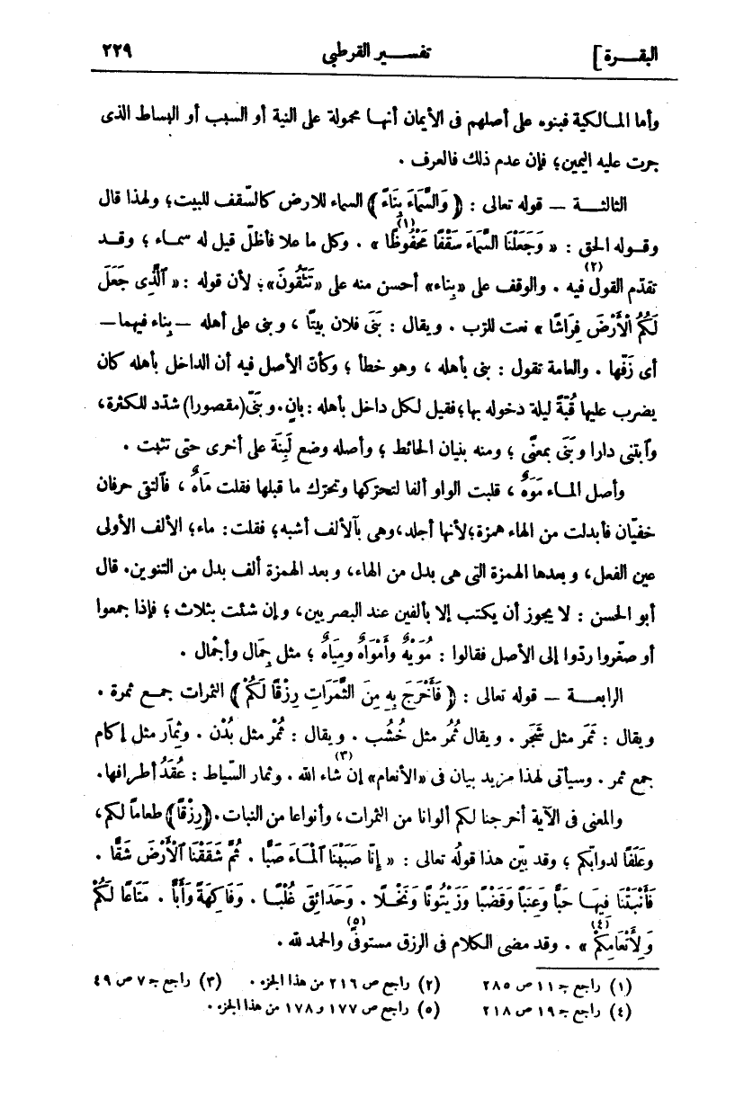 وَأَمَّا الْمَالِكِيَّةُ فَبَنَوْهُ عَلَى أَصْلِهِمْ فِي الْأَيْمَانِ أَنَّهَا مَحْمُولَةٌ عَلَى النِّيَّةِ أَوِ السَّبَبِ أَوِ الْبِسَاطِ الَّذِي جَرَتْ عَلَيْهِ الْيَمِينُ، فَإِنْ عُدِمَ ذَلِكَ فَالْعُرْفُ. الثَّالِثَةُ قَوْلُهُ تَعَالَى: (وَالسَّماءَ بِناءً) السَّمَاءُ لِلْأَرْضِ كَالسَّقْفِ لِلْبَيْتِ، وَلِهَذَا قَالَ وَقَوْلُهُ الحق" وَجَعَلْنَا السَّماءَ سَقْفاً مَحْفُوظاً «١» " [الأنبياء: ٣٢] وَكُلُّ مَا عَلَا فَأَظَلَّ قِيلَ لَهُ سَمَاءٌ، وَقَدْ تَقَدَّمَ الْقَوْلُ «٢» فِيهِ وَالْوَقْفُ عَلَى" بِناءً" أَحْسَنُ مِنْهُ عَلَى" تَتَّقُونَ"، لِأَنَّ قَوْلَهُ:" الَّذِي جَعَلَ لَكُمُ الْأَرْضَ فِراشاً" نَعْتٌ لِلرَّبِّ. وَيُقَالُ: بَنَى فُلَانٌ بَيْتًا، وَبَنَى عَلَى أَهْلِهِ بِنَاءً فِيهِمَا أَيْ زَفَّهَا. وَالْعَامَّةُ تَقُولُ: بَنَى بِأَهْلِهِ، وَهُوَ خَطَأٌ، وَكَأَنَّ الْأَصْلَ فِيهِ أَنَّ الدَّاخِلَ بِأَهْلِهِ كَانَ يَضْرِبُ عَلَيْهَا قُبَّةً لَيْلَةَ دُخُولِهِ بِهَا، فَقِيلَ لِكُلِّ دَاخِلٍ بِأَهْلِهِ: بَانٍ. وَبَنَّى (مَقْصُورًا) شُدِّدَ لِلْكَثْرَةِ، وَابْتَنَى دَارًا وَبَنَى بِمَعْنًى، وَمِنْهُ بُنْيَانُ الْحَائِطِ، وَأَصْلُهُ وَضْعُ لَبِنَةٍ عَلَى أُخْرَى حَتَّى تَثْبُتَ. وَأَصْلُ الْمَاءِ مَوَهٌ، قُلِبَتِ الْوَاوُ أَلِفًا لِتَحَرُّكِهَا وَتَحَرُّكِ مَا قَبْلَهَا فَقُلْتَ مَاهٌ، فَالْتَقَى حَرْفَانِ خَفِيَّانِ فَأَبْدَلْتَ مِنَ الْهَاءِ هَمْزَةً، لِأَنَّهَا أَجْلَدُ، وَهِيَ بِالْأَلِفِ أَشْبَهُ، فَقُلْتَ: مَاءٌ، الْأَلِفُ الْأُولَى عَيْنُ الْفِعْلِ، وَبَعْدَهَا الْهَمْزَةُ الَّتِي هِيَ بَدَلٌ مِنَ الْهَاءِ، وَبَعْدَ الْهَمْزَةِ أَلِفٌ بَدَلٌ مِنَ التَّنْوِينِ. قَالَ أَبُو الْحَسَنِ: لَا يَجُوزُ أَنْ يُكْتَبَ إِلَّا بِأَلِفَيْنِ عِنْدَ الْبَصْرِيِّينَ، وَإِنْ شِئْتَ بِثَلَاثٍ، فَإِذَا جَمَعُوا أَوْ صَغَّرُوا رَدُّوا إِلَى الْأَصْلِ فَقَالُوا: مُوَيْهٌ وَأَمْوَاهٌ وَمِيَاهٌ، مِثْلَ جِمَالٍ وَأَجْمَالٍ. الرَّابِعَةُ قَوْلُهُ تَعَالَى: (فَأَخْرَجَ بِهِ مِنَ الثَّمَراتِ رِزْقاً لَكُمْ) الثَّمَرَاتُ جَمْعُ ثَمَرَةٍ. وَيُقَالُ: ثَمَرٌ مِثْلَ شَجَرٍ. وَيُقَالُ ثُمُرٌ مِثْلَ خُشُبٍ. وَيُقَالُ: ثُمْرٌ مِثْلَ بُدْنٌ. وَثِمَارٌ مِثْلَ إِكَامٍ جَمْعُ ثَمَرٍ. وَسَيَأْتِي لِهَذَا مَزِيدُ بَيَانٍ فِي" الْأَنْعَامِ" إِنْ «٣» شَاءَ اللَّهُ. وَثِمَارُ السِّيَاطِ: عُقَدُ أَطْرَافِهَا. وَالْمَعْنَى فِي الْآيَةِ أَخْرَجْنَا لَكُمْ أَلْوَانًا مِنَ الثَّمَرَاتِ، وَأَنْوَاعًا مِنَ النَّبَاتِ." رِزْقاً" طَعَامًا لَكُمْ، وَعَلَفًا لِدَوَابِّكُمْ، وَقَدْ بَيَّنَ هَذَا قَوْلُهُ تَعَالَى:" أَنَّا صَبَبْنَا الْماءَ صَبًّا. ثُمَّ شَقَقْنَا الْأَرْضَ شَقًّا. فَأَنْبَتْنا فِيها حَبًّا وَعِنَباً وَقَضْباً وَزَيْتُوناً وَنَخْلًا. وَحَدائِقَ غُلْباً. وَفاكِهَةً وَأَبًّا. مَتاعاً لَكُمْ وَلِأَنْعامِكُمْ «٤» " [عبس: ٣٢ ٢٥] وَقَدْ مَضَى الْكَلَامُ فِي الرِّزْقِ مُسْتَوْفًى «٥» وَالْحَمْدُ لله.