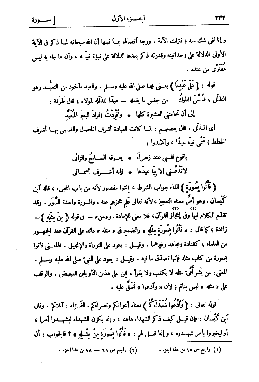 (فَأْتُوا بِسُورَةٍ) الْفَاءُ جَوَابُ الشَّرْطِ، ائْتُوا مَقْصُورٌ لِأَنَّهُ مِنْ بَابِ الْمَجِيءِ، قَالَهُ ابْنُ كَيْسَانَ. وَهُوَ أَمْرٌ مَعْنَاهُ التَّعْجِيزُ، لِأَنَّهُ تَعَالَى عَلِمَ عَجْزَهُمْ عَنْهُ. وَالسُّورَةُ وَاحِدَةُ السُّوَرِ. وَقَدْ تَقَدَّمَ الْكَلَامُ فِيهَا «١» وَفِي إِعْجَازِ «٢» الْقُرْآنِ، فَلَا مَعْنَى لِلْإِعَادَةِ." ومن" فِي قَوْلِهِ" مِنْ مِثْلِهِ" زَائِدَةٌ، كَمَا قَالَ" فَأْتُوا بِسُورَةٍ مِثْلِهِ" وَالضَّمِيرُ فِي" مِثْلِهِ" عَائِدٌ عَلَى الْقُرْآنِ عِنْدَ الْجُمْهُورِ مِنَ الْعُلَمَاءِ، كَقَتَادَةَ وَمُجَاهِدٍ وَغَيْرِهِمَا. وَقِيلَ: يَعُودُ عَلَى التَّوْرَاةِ وَالْإِنْجِيلِ. فَالْمَعْنَى فَأْتُوا بِسُورَةٍ مِنْ كِتَابٍ مِثْلِهِ فَإِنَّهَا تُصَدِّقُ مَا فِيهِ. وَقِيلَ: يَعُودُ عَلَى النَّبِيِّ صَلَّى اللَّهُ عَلَيْهِ وَسَلَّمَ. الْمَعْنَى: مِنْ بَشَرٍ أُمِّيٍّ مِثْلِهِ لَا يَكْتُبُ وَلَا يَقْرَأُ. فَمِنْ عَلَى هَذَيْنَ التَّأْوِيلَيْنِ لِلتَّبْعِيضِ وَالْوَقْفُ عَلَى" مِثْلِهِ" لَيْسَ بِتَامٍّ، لِأَنَّ" وَادْعُوا" نَسَقٌ عَلَيْهِ. قَوْلُهُ تَعَالَى: (وَادْعُوا شُهَداءَكُمْ) مَعْنَاهُ أَعْوَانَكُمْ وَنُصَرَاءَكُمْ. الْفَرَّاءُ: آلِهَتَكُمْ. وَقَالَ ابْنُ كَيْسَانَ: فَإِنْ قِيلَ كَيْفَ ذَكَرَ الشُّهَدَاءَ هَاهُنَا، وَإِنَّمَا يَكُونُ الشُّهَدَاءُ لِيَشْهَدُوا أَمْرًا، أَوْ لِيُخْبِرُوا بِأَمْرٍ شَهِدُوهُ، وَإِنَّمَا قِيلَ لَهُمْ:" فَأْتُوا بِسُورَةٍ مِنْ مِثْلِهِ"؟ فَالْجَوَابُ: أَنَّ