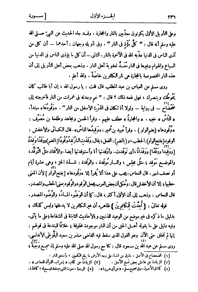 وَعَلَى التَّأْوِيلِ الْأَوَّلِ يَكُونُونَ مُعَذَّبِينَ بِالنَّارِ وَالْحِجَارَةِ. وَقَدْ جَاءَ الْحَدِيثُ عَنِ النَّبِيِّ صَلَّى اللَّهُ عَلَيْهِ وَسَلَّمَ أَنَّهُ قَالَ: (كُلُّ مُؤْذٍ فِي النَّارِ). وَفِي تَأْوِيلِهِ وَجْهَانِ: أَحَدُهُمَا- أَنَّ كُلَّ مَنْ آذَى النَّاسَ فِي الدُّنْيَا عَذَّبَهُ اللَّهُ فِي الْآخِرَةِ بِالنَّارِ. الثَّانِي- أَنَّ كُلَّ مَا يُؤْذِي النَّاسَ فِي الدُّنْيَا مِنَ السِّبَاعِ وَالْهَوَامِّ وَغَيْرِهَا فِي النَّارِ مُعَدٌّ لِعُقُوبَةِ أَهْلِ النَّارِ. وَذَهَبَ بَعْضُ أَهْلِ التَّأْوِيلِ إِلَى أَنَّ هَذِهِ النَّارَ الْمَخْصُوصَةَ بِالْحِجَارَةِ هِيَ نَارُ الْكَافِرِينَ خَاصَّةً. وَاللَّهُ أَعْلَمُ. رَوَى مُسْلِمٌ عَنِ الْعَبَّاسِ بْنِ عَبْدِ الْمُطَّلِبِ قَالَ قُلْتُ: يَا رَسُولَ اللَّهِ، إِنَّ أَبَا طَالِبٍ كَانَ يَحُوطُكَ وَيَنْصُرُكَ، فَهَلْ نَفَعَهُ ذَلِكَ؟ قَالَ: (نَعَمْ وَجَدْتُهُ فِي غَمَرَاتٍ مِنَ النَّارِ فَأَخْرَجْتُهُ إِلَى ضَحْضَاحٍ «١» - فِي رِوَايَةٍ- وَلَوْلَا أَنَا لَكَانَ فِي الدَّرْكِ الْأَسْفَلِ مِنَ النَّارِ) ... " وَقُودُهَا" مُبْتَدَأٌ." النَّاسِ" خَبَرُهُ." وَالْحِجارَةُ" عَطْفٌ عَلَيْهِمْ. وَقَرَأَ الْحَسَنُ وَمُجَاهِدٌ وَطَلْحَةُ بْنُ مُصَرِّفٍ:" وُقُودُهَا" (بِضَمِّ الْوَاوِ). وَقَرَأَ عُبَيْدُ بْنُ عُمَيْرٍ:" وَقِيدُهَا النَّاسُ". قَالَ الْكِسَائِيُّ وَالْأَخْفَشُ: الْوَقُودُ (بِفَتْحِ الْوَاوِ): الْحَطَبُ، وَ (بِالضَّمِّ): الْفِعْلُ، يُقَالُ: وَقَدَتِ النَّارُ تَقِدُ وُقُودًا (بِالضَّمِّ) وَوَقَدًا وَقِدَةً [وَوَقِيدًا «٢» وَوَقْدًا] وَوَقَدَانًا، أَيْ تَوَقَّدَتْ. وَأَوْقَدْتُهَا أَنَا وَاسْتَوْقَدْتُهَا أَيْضًا. وَالِاتِّقَادُ مِثْلَ التَّوَقُّدِ، وَالْمَوْضِعُ مَوْقِدُ، مِثْلُ مَجْلِسٍ، وَالنَّارُ مُوقَدَةٌ. وَالْوَقْدَةُ: شِدَّةُ الْحَرِّ، وَهِيَ عَشَرَةُ أَيَّامٍ أَوْ نِصْفُ شَهْرٍ. قَالَ النَّحَّاسُ: يَجِبُ عَلَى هَذَا أَلَّا يُقْرَأَ إِلَّا" وَقُودُهَا" [بِفَتْحِ «٣» الْوَاوِ [لِأَنَّ الْمَعْنَى حَطَبُهَا، إِلَّا أَنَّ الْأَخْفَشَ قَالَ: وَحُكِيَ أَنَّ بَعْضَ الْعَرَبِ يَجْعَلُ الْوَقُودَ وَالْوُقُودُ بِمَعْنَى الْحَطَبِ وَالْمَصْدَرِ. قَالَ النَّحَّاسُ: وَذَهَبَ إِلَى أَنَّ الْأَوَّلَ أَكْثَرُ، قَالَ: كَمَا أَنَّ الْوَضُوءَ الْمَاءُ، وَالْوُضُوءُ الْمَصْدَرُ. قَوْلُهُ تَعَالَى: (أُعِدَّتْ لِلْكافِرِينَ) ظَاهِرُهُ أَنَّ غَيْرَ الْكَافِرِينَ لَا يَدْخُلُهَا وَلَيْسَ كَذَلِكَ، بِدَلِيلِ مَا ذَكَرَهُ فِي غَيْرِ مَوْضِعٍ مِنَ الْوَعِيدِ لِلْمُذْنِبِينَ وَبِالْأَحَادِيثِ الثَّابِتَةِ فِي الشَّفَاعَةِ، عَلَى مَا يَأْتِي. وَفِيهِ دَلِيلٌ عَلَى مَا يَقُولُهُ أَهْلُ الْحَقِّ مِنْ أَنَّ النَّارَ مَوْجُودَةٌ مَخْلُوقَةٌ، خِلَافًا لِلْمُبْتَدِعَةِ فِي قَوْلِهِمْ: إِنَّهَا لَمْ تُخْلَقْ حَتَّى الْآنَ. وَهُوَ الْقَوْلُ الَّذِي سَقَطَ فِيهِ الْقَاضِي مُنْذِرُ بْنُ سَعِيدٍ الْبَلُّوطِيُّ الْأَنْدَلُسِيُّ. رَوَى مُسْلِمٌ عَنْ عَبْدِ اللَّهِ «٤» بْنِ مَسْعُودٍ قَالَ كُنَّا مَعَ رَسُولِ اللَّهِ إذ سمع وجبة «٥»،