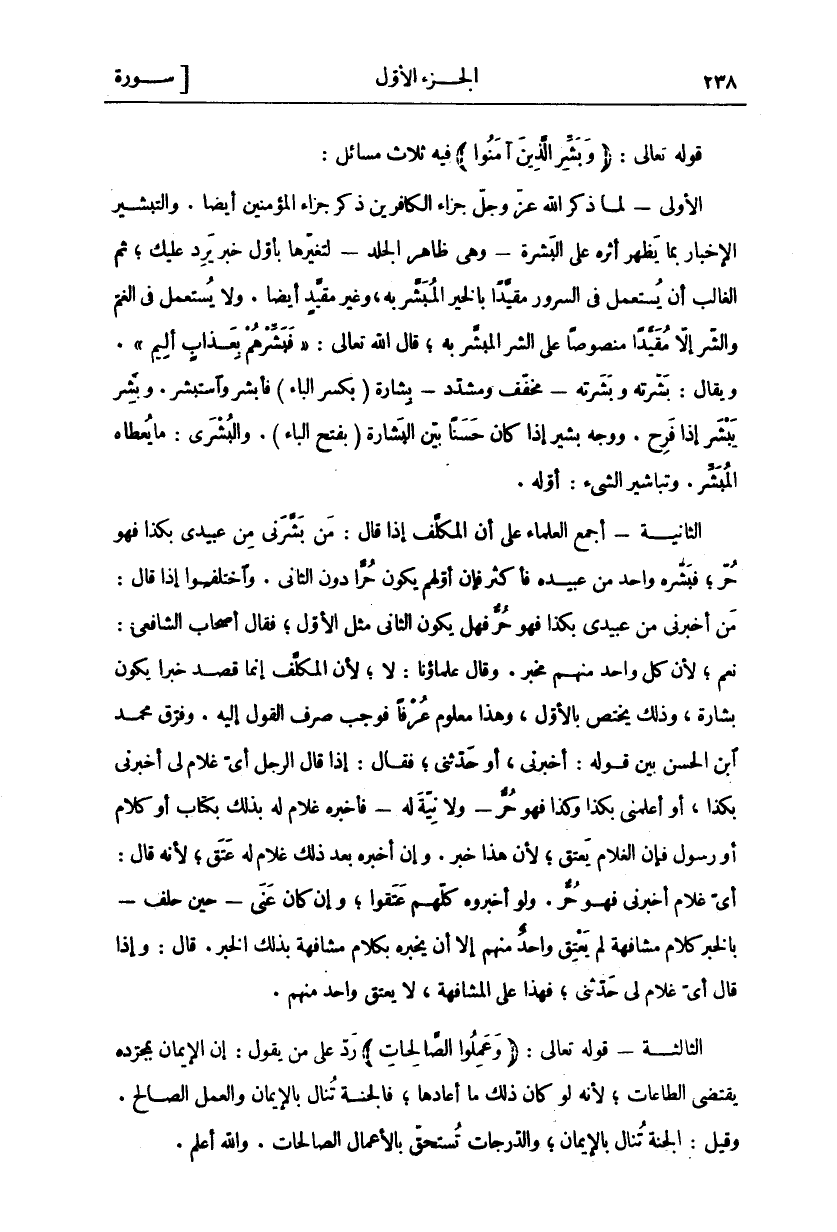قَوْلُهُ تَعَالَى: (وَبَشِّرِ الَّذِينَ آمَنُوا) فِيهِ ثَلَاثُ مَسَائِلَ: الْأُولَى- لَمَّا ذَكَرَ اللَّهُ عَزَّ وَجَلَّ جَزَاءَ الْكَافِرِينَ ذَكَرَ جَزَاءَ الْمُؤْمِنِينَ أَيْضًا. وَالتَّبْشِيرُ الْإِخْبَارُ بِمَا يَظْهَرُ أَثَرُهُ عَلَى الْبَشَرَةِ- وَهِيَ ظَاهِرُ الْجِلْدِ- لِتَغَيُّرِهَا بِأَوَّلِ خَبَرٍ يَرِدُ عَلَيْكَ، ثُمَّ الْغَالِبُ أَنْ يُسْتَعْمَلَ فِي السُّرُورِ مُقَيَّدًا بِالْخَيْرِ الْمُبَشَّرِ بِهِ، وَغَيْرَ مُقَيَّدٍ أَيْضًا. وَلَا يُسْتَعْمَلُ فِي الْغَمِّ وَالشَّرِّ إِلَّا مُقَيَّدًا مَنْصُوصًا عَلَى الشَّرِّ الْمُبَشَّرِ بِهِ، قَالَ اللَّهُ تَعَالَى" فَبَشِّرْهُمْ بِعَذابٍ أَلِيمٍ" [الانشقاق: ٢٤]. وَيُقَالُ: بَشَرْتُهُ وَبَشَّرْتُهُ- مُخَفَّفٌ وَمُشَدَّدٌ- بِشَارَةً (بِكَسْرِ الْبَاءِ) فَأَبْشَرَ وَاسْتَبْشَرَ. وَبَشِرَ يَبْشُرُ إِذَا فَرِحَ. وَوَجْهٌ بَشِيرٌ إِذَا كَانَ حَسَنًا بَيِّنَ الْبَشَارَةِ (بِفَتْحِ الْبَاءِ). وَالْبُشْرَى: مَا يُعْطَاهُ الْمُبَشِّرُ. وَتَبَاشِيرُ الشَّيْءِ: أَوَّلُهُ. الثَّانِيَةُ- أَجْمَعَ الْعُلَمَاءُ عَلَى أَنَّ الْمُكَلَّفَ إِذَا قَالَ: مَنْ بَشَّرَنِي مِنْ عَبِيدِي بِكَذَا فَهُوَ حُرٌّ، فَبَشَّرَهُ وَاحِدٌ مِنْ عَبِيدِهِ فَأَكْثَرُ فَإِنَّ أَوَّلَهُمْ يَكُونُ حُرًّا دُونَ الثَّانِي. وَاخْتَلَفُوا إِذَا قَالَ: مَنْ أَخْبَرَنِي مِنْ عَبِيدِي بِكَذَا فَهُوَ حُرٌّ فَهَلْ يَكُونُ الثَّانِي مِثْلَ الْأَوَّلِ، فَقَالَ أَصْحَابُ الشَّافِعِيِّ: نَعَمْ، لِأَنَّ كُلَّ وَاحِدٍ مِنْهُمْ مُخْبِرٌ. وَقَالَ عُلَمَاؤُنَا: لَا، لِأَنَّ الْمُكَلَّفَ إِنَّمَا قَصَدَ خَبَرًا يَكُونُ بِشَارَةً، وَذَلِكَ يَخْتَصُّ بِالْأَوَّلِ، وَهَذَا مَعْلُومٌ عُرْفًا فَوَجَبَ صَرْفُ القول إليه. وفرق محمد ابن الْحَسَنِ بَيْنَ قَوْلِهِ: أَخْبَرَنِي، أَوْ حَدَّثَنِي، فَقَالَ: إِذَا قَالَ الرَّجُلُ أَيُّ غُلَامٍ لِي أَخْبَرَنِي بِكَذَا، أَوْ أَعْلَمَنِي بِكَذَا وَكَذَا فَهُوَ حُرٌّ- وَلَا نِيَّةَ لَهُ- فَأَخْبَرَهُ غُلَامٌ لَهُ بِذَلِكَ بِكِتَابٍ أَوْ كَلَامٍ أَوْ رَسُولٍ فَإِنَّ الْغُلَامَ يُعْتَقُ، لِأَنَّ هَذَا خَبَرٌ. وَإِنْ أَخْبَرَهُ بَعْدَ ذَلِكَ غُلَامٌ لَهُ عَتَقَ، لِأَنَّهُ قَالَ: أَيُّ غُلَامٍ أَخْبَرَنِي فَهُوَ حُرٌّ. وَلَوْ أَخْبَرُوهُ كُلُّهُمْ عَتَقُوا، وَإِنْ كَانَ عَنَى- حِينَ حَلَفَ- بِالْخَبَرِ كَلَامَ مُشَافَهَةٍ لَمْ يَعْتِقْ وَاحِدٌ مِنْهُمْ إِلَّا أَنْ يُخْبِرَهُ بِكَلَامٍ مُشَافَهَةً بِذَلِكَ الْخَبَرِ. قَالَ: وَإِذَا قَالَ أَيُّ غُلَامٍ لِي حَدَّثَنِي، فَهَذَا عَلَى الْمُشَافَهَةِ، لَا يَعْتِقُ وَاحِدٌ مِنْهُمْ. الثَّالِثَةُ- قَوْلُهُ تَعَالَى: (وَعَمِلُوا الصَّالِحاتِ) رَدٌّ عَلَى مَنْ يَقُولُ: إِنَّ الْإِيمَانَ بِمُجَرَّدِهِ يَقْتَضِي الطَّاعَاتِ، لِأَنَّهُ لَوْ كَانَ ذَلِكَ مَا أَعَادَهَا، فَالْجَنَّةُ تُنَالُ بِالْإِيمَانِ وَالْعَمَلِ الصَّالِحِ. وَقِيلَ: الْجَنَّةُ تُنَالُ بِالْإِيمَانِ، وَالدَّرَجَاتُ تُسْتَحَقُّ بِالْأَعْمَالِ الصَّالِحَاتِ. وَاللَّهُ أَعْلَمُ.