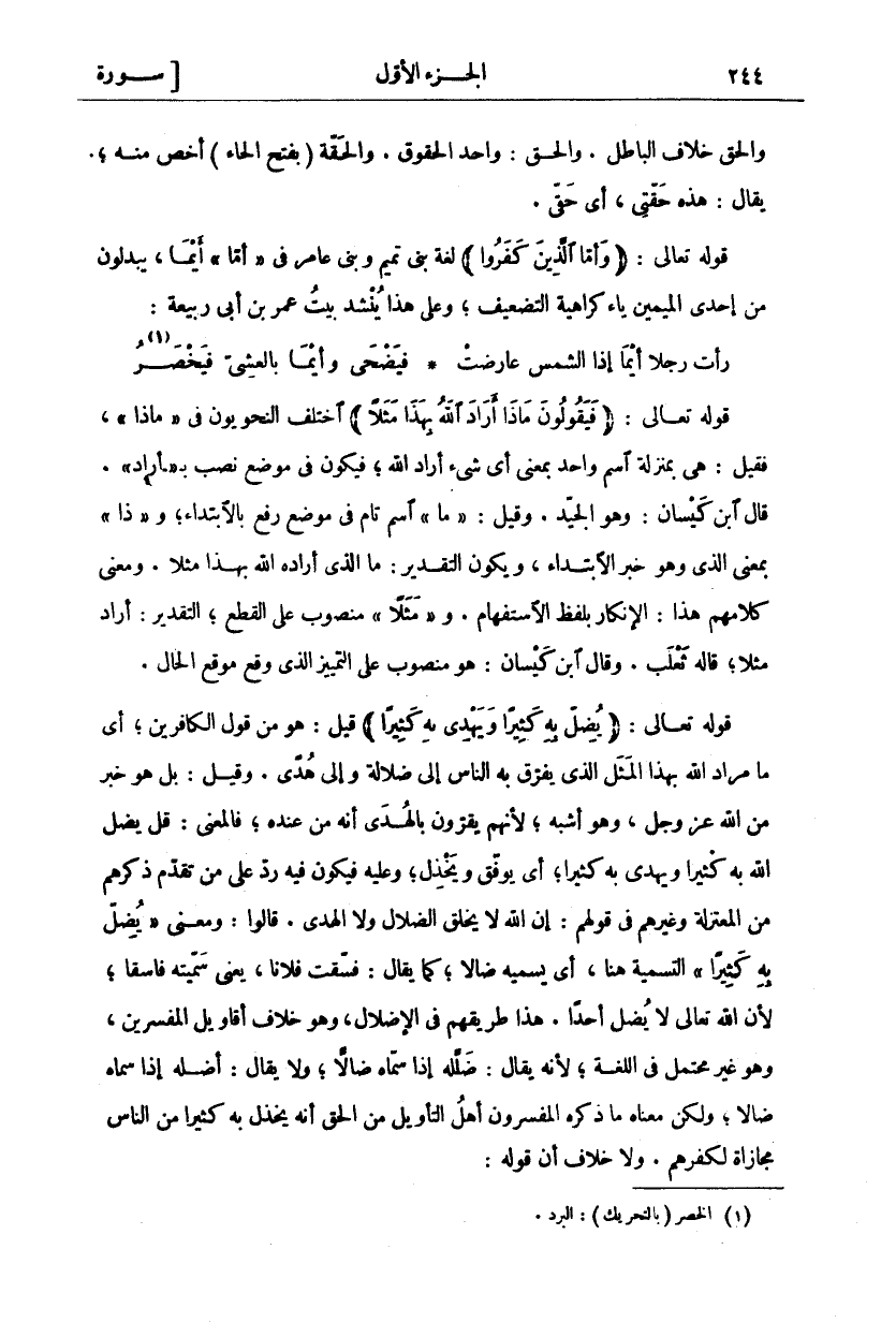وَالْحَقُّ خِلَافُ الْبَاطِلِ. وَالْحَقُّ: وَاحِدُ الْحُقُوقِ. وَالْحَقَّةُ (بِفَتْحِ الْحَاءِ) أَخَصُّ مِنْهُ، يُقَالُ: هَذِهِ حَقَّتِي، أَيْ حَقِّي. قَوْلُهُ تَعَالَى: (وَأَمَّا الَّذِينَ كَفَرُوا) لُغَةُ بَنِي تَمِيمٍ وَبَنِي عَامِرٍ فِي" أَمَّا" أَيْمَا، يُبْدِلُونَ مِنْ إِحْدَى الْمِيمَيْنِ يَاءً كَرَاهِيَةَ التَّضْعِيفِ، وَعَلَى هَذَا يُنْشَدُ بَيْتُ عُمَرَ بْنِ أَبِي رَبِيعَةَ: رَأَتْ رَجُلًا أَيْمَا إِذَا الشَّمْسُ عَارَضَتْ فَيَضْحَى وَأَيْمَا بِالْعَشِيِّ فَيَخْصَرُ «١» قَوْلُهُ تَعَالَى: (فَيَقُولُونَ مَاذَا أَرادَ اللَّهُ بِهذا مَثَلًا) اخْتَلَفَ النَّحْوِيُّونَ فِي" مَاذَا"، فَقِيلَ: هِيَ بِمَنْزِلَةِ اسْمٍ واحد بمعنى أي شي أَرَادَ اللَّهُ، فَيَكُونُ فِي مَوْضِعِ نَصْبٍ بِ"- أَرادَ". قَالَ ابْنُ كَيْسَانَ: وَهُوَ الْجَيِّدُ. وَقِيلَ:" مَا" اسْمٌ تَامٌّ فِي مَوْضِعِ رَفْعٍ بِالِابْتِدَاءِ، وَ" ذَا" بِمَعْنَى الَّذِي وَهُوَ خَبَرُ الِابْتِدَاءِ، وَيَكُونُ التَّقْدِيرُ: مَا الَّذِي أَرَادَهُ اللَّهُ بِهَذَا مَثَلًا، وَمَعْنَى كَلَامِهِمْ هَذَا: الْإِنْكَارُ بِلَفْظِ الِاسْتِفْهَامِ. وَ" مَثَلًا" مَنْصُوبٌ عَلَى الْقَطْعِ، التَّقْدِيرُ: أَرَادَ مَثَلًا، قَالَهُ ثَعْلَبٌ. وَقَالَ ابْنُ كَيْسَانَ: هُوَ مَنْصُوبٌ عَلَى التَّمْيِيزِ الَّذِي وَقَعَ مَوْقِعَ الْحَالِ. قَوْلُهُ تَعَالَى: (يُضِلُّ بِهِ كَثِيراً وَيَهْدِي بِهِ كَثِيراً) قِيلَ: هُوَ مِنْ قَوْلِ الْكَافِرِينَ، أَيْ مَا مُرَادُ اللَّهِ بِهَذَا الْمَثَلِ الَّذِي يُفَرِّقُ بِهِ النَّاسَ إِلَى ضَلَالَةٍ وَإِلَى هُدًى. وَقِيلَ: بَلْ هُوَ خَبَرٌ مِنَ اللَّهِ عَزَّ وَجَلَّ، وَهُوَ أَشْبَهُ، لِأَنَّهُمْ يُقِرُّونَ بِالْهُدَى أَنَّهُ مِنْ عِنْدِهِ، فَالْمَعْنَى: قُلْ يُضِلُّ اللَّهُ بِهِ كَثِيرًا وَيَهْدِي بِهِ كَثِيرًا، أَيْ يُوَفِّقُ وَيَخْذِلُ، وَعَلَيْهِ فَيَكُونُ فِيهِ رَدٌّ عَلَى مَنْ تَقَدَّمَ ذِكْرُهُمْ مِنَ الْمُعْتَزِلَةِ وَغَيْرِهِمْ فِي قَوْلِهِمْ: إِنَّ اللَّهَ لَا يَخْلُقُ الضَّلَالَ وَلَا الْهُدَى. قَالُوا: وَمَعْنَى" يُضِلُّ بِهِ كَثِيراً" التَّسْمِيَةُ هُنَا، أَيْ يُسَمِّيهِ ضَالًّا، كَمَا يُقَالُ: فَسَّقْتُ فُلَانًا، يَعْنِي سَمَّيْتُهُ فَاسِقًا، لِأَنَّ اللَّهَ تَعَالَى لَا يُضِلُّ أَحَدًا. هَذَا طَرِيقُهُمْ فِي الْإِضْلَالِ، وَهُوَ خِلَافُ أَقَاوِيلِ الْمُفَسِّرِينَ، وَهُوَ غَيْرُ مُحْتَمَلٍ فِي اللُّغَةِ، لِأَنَّهُ يُقَالُ: ضَلَّلَهُ إِذَا سَمَّاهُ ضَالًّا، وَلَا يُقَالُ: أَضَلَّهُ إِذَا سَمَّاهُ ضَالًّا، وَلَكِنَّ مَعْنَاهُ مَا ذَكَرَهُ الْمُفَسِّرُونَ أَهْلُ التَّأْوِيلِ مِنَ الْحَقِّ أَنَّهُ يَخْذِلُ بِهِ كَثِيرًا مِنَ النَّاسِ مُجَازَاةً لِكُفْرِهِمْ. ولا خلاف أن قوله: