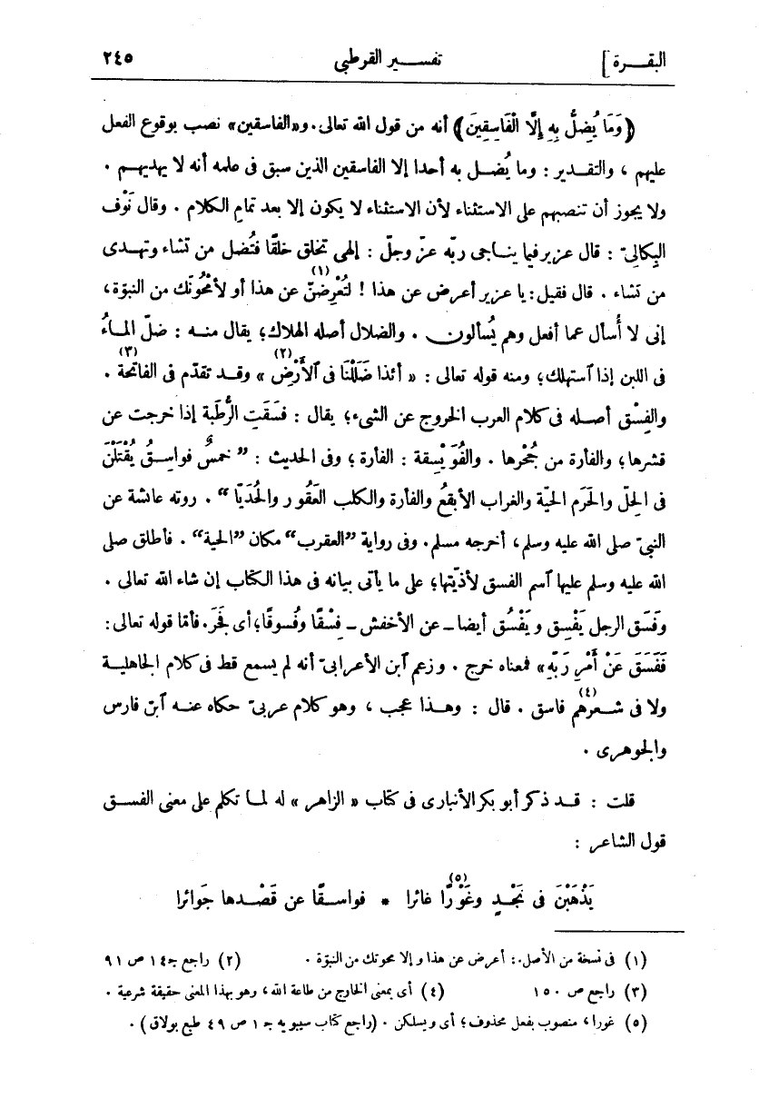 " وَما يُضِلُّ بِهِ إِلَّا الْفاسِقِينَ" أَنَّهُ مِنْ قول الله تعالى. و" الْفاسِقِينَ" نُصِبَ بِوُقُوعِ الْفِعْلِ عَلَيْهِمْ، وَالتَّقْدِيرُ: وَمَا يُضِلُّ بِهِ أَحَدًا إِلَّا الْفَاسِقِينَ الَّذِينَ سَبَقَ فِي عِلْمِهِ أَنَّهُ لَا يَهْدِيهِمْ. وَلَا يَجُوزُ أَنْ تَنْصِبَهُمْ عَلَى الِاسْتِثْنَاءِ لِأَنَّ الِاسْتِثْنَاءَ لَا يَكُونُ إِلَّا بَعْدَ تَمَامِ الْكَلَامِ. وَقَالَ نَوْفٌ الْبَكَالِيُّ: قَالَ عُزَيْرٌ فِيمَا يُنَاجِي رَبَّهُ عَزَّ وَجَلَّ: إِلَهِي تَخْلُقُ خَلْقًا فَتُضِلُّ مَنْ تَشَاءُ وَتَهْدِي مَنْ تَشَاءُ. قَالَ فَقِيلَ: يَا عُزَيْرُ أَعْرِضْ عَنْ هَذَا! لَتُعْرِضَنَّ «١» عَنْ هَذَا أَوْ لَأَمْحُوَنَّكَ مِنَ النُّبُوَّةِ، إِنِّي لَا أُسْأَلُ عَمَّا أَفْعَلُ وَهُمْ يُسْأَلُونَ. وَالضَّلَالُ أَصْلُهُ الْهَلَاكُ، يُقَالُ مِنْهُ: ضَلَّ الْمَاءُ فِي اللَّبَنِ إِذَا اسْتُهْلِكَ، وَمِنْهُ قوله تعالى:" أَإِذا ضَلَلْنا فِي الْأَرْضِ «٢» " [السجدة: ١٠] وَقَدْ تَقَدَّمَ فِي الْفَاتِحَةِ «٣». وَالْفِسْقُ أَصْلُهُ فِي كَلَامِ الْعَرَبِ الْخُرُوجُ عَنِ الشَّيْءِ، يُقَالُ: فَسَقَتِ الرُّطَبَةُ إِذَا خَرَجَتْ عَنْ قِشْرِهَا، وَالْفَأْرَةُ مِنْ جُحْرِهَا. وَالْفُوَيْسِقَةُ: الْفَأْرَةُ، وَفِي الْحَدِيثِ: (خَمْسٌ فَوَاسِقُ يُقْتَلْنَ فِي الْحِلِّ وَالْحَرَمِ الْحَيَّةُ وَالْغُرَابُ الْأَبْقَعُ وَالْفَأْرَةُ وَالْكَلْبُ الْعَقُورُ وَالْحُدَيَّا). رَوَتْهُ عَائِشَةُ عَنِ النَّبِيِّ صَلَّى اللَّهُ عَلَيْهِ وَسَلَّمَ، أَخْرَجَهُ مُسْلِمٌ. وَفِي رِوَايَةٍ (الْعَقْرَبُ) مَكَانَ (الْحَيَّةِ). فَأَطْلَقَ صَلَّى اللَّهُ عَلَيْهِ وَسَلَّمَ عَلَيْهَا اسْمَ الْفِسْقِ لِأَذِيَّتِهَا، عَلَى مَا يَأْتِي بَيَانُهُ فِي هَذَا الْكِتَابِ إِنْ شَاءَ اللَّهُ تَعَالَى. وَفَسَقَ الرَّجُلُ يَفْسِقُ ويفسق أيضا- عن الأخفش- فِسْقًا وَفُسُوقًا، أَيْ فَجَرَ. فَأَمَّا قَوْلُهُ تَعَالَى:" فَفَسَقَ عَنْ أَمْرِ رَبِّهِ" فَمَعْنَاهُ خَرَجَ. وَزَعَمَ ابْنُ الْأَعْرَابِيِّ أَنَّهُ لَمْ يُسْمَعْ قَطُّ فِي كَلَامِ الْجَاهِلِيَّةِ وَلَا فِي شِعْرِهِمْ «٤» فَاسِقٌ. قَالَ: وَهَذَا عَجَبٌ، وَهُوَ كَلَامٌ عَرَبِيٌّ حَكَاهُ عَنْهُ ابْنُ فَارِسٍ وَالْجَوْهَرِيُّ. قُلْتُ: قَدْ ذَكَرَ أَبُو بَكْرٍ الْأَنْبَارِيُّ فِي كِتَابِ" الزَّاهِرِ" لَهُ لَمَّا تَكَلَّمَ عَلَى مَعْنَى الْفِسْقِ قَوْلَ الشَّاعِرِ: