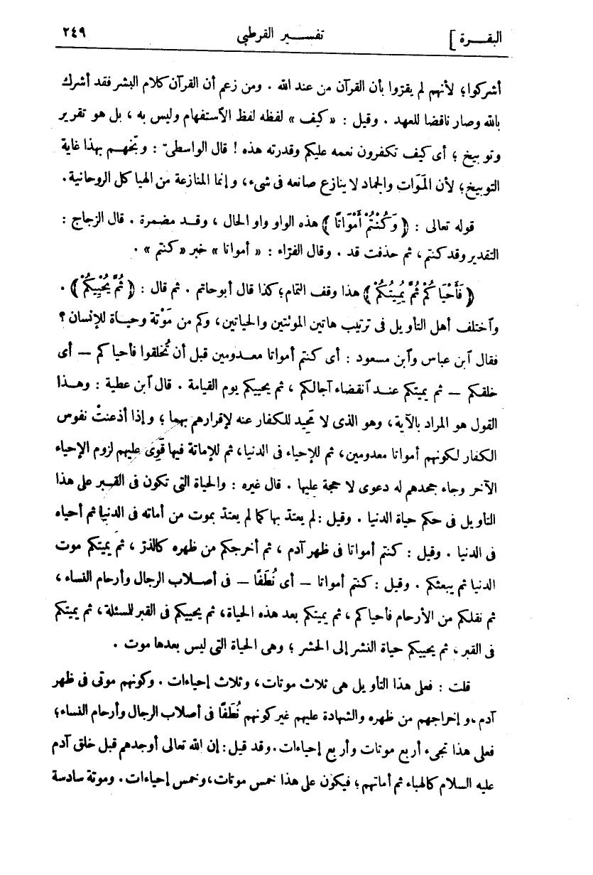 أَشْرَكُوا، لِأَنَّهُمْ لَمْ يُقِرُّوا بِأَنَّ الْقُرْآنَ مِنْ عِنْدِ اللَّهِ. وَمَنْ زَعَمَ أَنَّ الْقُرْآنَ كَلَامُ الْبَشَرِ فَقَدْ أَشْرَكَ بِاللَّهِ وَصَارَ نَاقِضًا لِلْعَهْدِ. وَقِيلَ:" كَيْفَ" لَفْظُهُ لَفْظُ الِاسْتِفْهَامِ وَلَيْسَ بِهِ، بَلْ هُوَ تَقْرِيرٌ وَتَوْبِيخٌ، أَيْ كَيْفَ تَكْفُرُونَ نِعَمَهُ عَلَيْكُمْ وَقُدْرَتَهُ هَذِهِ! قَالَ الْوَاسِطِيُّ: وَبَّخَهُمْ بِهَذَا غَايَةَ التَّوْبِيخِ، لِأَنَّ الْمَوَاتَ وَالْجَمَادَ لَا ينازع صانعه في شي، وَإِنَّمَا الْمُنَازَعَةُ مِنَ الْهَيَاكِلِ الرُّوحَانِيَّةِ. قَوْلُهُ تَعَالَى: (وَكُنْتُمْ أَمْواتاً) هَذِهِ الْوَاوُ وَاوُ الْحَالِ، وَقَدْ مُضْمَرَةٌ. قَالَ الزَّجَّاجُ: التَّقْدِيرُ وَقَدْ كُنْتُمْ، ثُمَّ حُذِفَتْ قَدْ. وَقَالَ الْفَرَّاءُ:" أَمْواتاً" خَبَرُ" كُنْتُمْ" ... " فَأَحْياكُمْ ثُمَّ يُمِيتُكُمْ" هَذَا وَقْفُ التَّمَامِ، كَذَا قَالَ أَبُو حَاتِمٍ. ثُمَّ قَالَ:" ثُمَّ يُحْيِيكُمْ" وَاخْتَلَفَ أَهْلُ التَّأْوِيلِ فِي تَرْتِيبِ هَاتَيْنِ الْمَوْتَتَيْنِ وَالْحَيَاتَيْنِ، وَكَمْ مِنْ مَوْتَةٍ وَحَيَاةٍ لِلْإِنْسَانِ؟ فَقَالَ ابْنُ عَبَّاسٍ وَابْنُ مَسْعُودٍ: أَيْ كُنْتُمْ أَمْوَاتًا مَعْدُومِينَ قَبْلَ أَنْ تُخْلَقُوا فَأَحْيَاكُمْ- أَيْ خَلَقَكُمْ- ثُمَّ يُمِيتُكُمْ عِنْدَ انْقِضَاءِ آجَالِكُمْ، ثُمَّ يُحْيِيكُمْ يَوْمَ الْقِيَامَةِ. قَالَ ابْنُ عَطِيَّةَ: وَهَذَا الْقَوْلُ هُوَ الْمُرَادُ بِالْآيَةِ، وَهُوَ الَّذِي لَا مَحِيدَ لِلْكُفَّارِ عَنْهُ لِإِقْرَارِهِمْ بِهِمَا، وَإِذَا أَذْعَنَتْ نُفُوسُ الْكُفَّارِ لِكَوْنِهِمْ أَمْوَاتًا مَعْدُومِينَ، ثُمَّ لِلْإِحْيَاءِ فِي الدُّنْيَا، ثُمَّ لِلْإِمَاتَةِ فِيهَا قَوِيَ عَلَيْهِمْ لُزُومُ الْإِحْيَاءِ الْآخَرِ وَجَاءَ جَحْدُهُمْ لَهُ دَعْوَى لَا حُجَّةَ عَلَيْهَا. قَالَ غَيْرُهُ: وَالْحَيَاةُ الَّتِي تَكُونُ فِي الْقَبْرِ عَلَى هَذَا التَّأْوِيلِ فِي حُكْمِ حَيَاةِ الدُّنْيَا. وَقِيلَ: لَمْ يُعْتَدَّ بِهَا كَمَا لَمْ يُعْتَدَّ بِمَوْتِ مَنْ أَمَاتَهُ فِي الدُّنْيَا ثُمَّ أَحْيَاهُ فِي الدُّنْيَا. وَقِيلَ: كُنْتُمْ أَمْوَاتًا فِي ظَهْرِ آدَمَ، ثُمَّ أَخْرَجَكُمْ مِنْ ظَهْرِهِ كَالذَّرِّ، ثُمَّ يُمِيتُكُمْ مَوْتَ الدُّنْيَا ثُمَّ يَبْعَثُكُمْ. وَقِيلَ: كُنْتُمْ أَمْوَاتًا- أَيْ نُطَفًا- فِي أَصْلَابِ الرِّجَالِ وَأَرْحَامِ النِّسَاءِ، ثُمَّ نَقَلَكُمْ مِنَ الْأَرْحَامِ فَأَحْيَاكُمْ، ثُمَّ يُمِيتُكُمْ بَعْدَ هَذِهِ الْحَيَاةِ، ثُمَّ يُحْيِيكُمْ فِي الْقَبْرِ لِلْمَسْأَلَةِ، ثُمَّ يُمِيتُكُمْ فِي الْقَبْرِ، ثُمَّ يُحْيِيكُمْ حَيَاةَ النَّشْرِ إِلَى الْحَشْرِ، وَهِيَ الْحَيَاةُ الَّتِي لَيْسَ بَعْدَهَا مَوْتٌ. قُلْتُ: فَعَلَى هَذَا التَّأْوِيلِ هِيَ ثَلَاثُ مَوْتَاتٍ، وَثَلَاثُ إِحْيَاءَاتٍ. وَكَوْنُهُمْ مَوْتَى فِي ظَهْرِ آدَمَ، وَإِخْرَاجُهُمْ مِنْ ظَهْرِهِ وَالشَّهَادَةُ عَلَيْهِمْ غَيْرُ كَوْنِهِمْ نُطَفًا فِي أَصْلَابِ الرِّجَالِ وَأَرْحَامِ النِّسَاءِ، فَعَلَى هَذَا تجئ أَرْبَعُ مَوْتَاتٍ وَأَرْبَعُ إِحْيَاءَاتٍ. وَقَدْ قِيلَ: إِنَّ اللَّهَ تَعَالَى أَوْجَدَهُمْ قَبْلَ خَلْقِ آدَمَ عَلَيْهِ السَّلَامُ كَالْهَبَاءِ ثُمَّ أَمَاتَهُمْ، فَيَكُونُ عَلَى هَذَا خَمْسَ مَوْتَاتٍ، وَخَمْسَ إِحْيَاءَاتٍ. وَمَوْتَةً سَادِسَةً