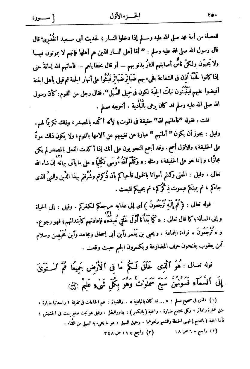 لِلْعُصَاةِ مِنْ أُمَّةِ مُحَمَّدٍ صَلَّى اللَّهُ عَلَيْهِ وَسَلَّمَ إِذَا دَخَلُوا النَّارَ، لِحَدِيثِ أَبِي سَعِيدٍ الْخُدْرِيِّ قَالَ قَالَ رَسُولُ اللَّهِ صَلَّى اللَّهُ عَلَيْهِ وَسَلَّمَ: (أَمَّا أَهْلُ النَّارِ الَّذِي هُمْ أَهْلُهَا فَإِنَّهُمْ لَا يَمُوتُونَ فِيهَا وَلَا يَحْيَوْنَ وَلَكِنْ نَاسٌ أَصَابَتْهُمُ النَّارُ بِذُنُوبِهِمْ- أَوْ قَالَ بِخَطَايَاهُمْ- فَأَمَاتَهُمُ اللَّهُ إِمَاتَةً حَتَّى إِذَا كَانُوا فحما أذن في الشفاعة فجئ بِهِمْ ضَبَائِرَ ضَبَائِرَ فَبُثُّوا عَلَى أَنْهَارِ الْجَنَّةِ ثم قيل يأهل الْجَنَّةِ أَفِيضُوا عَلَيْهِمْ فَيَنْبُتُونَ نَبَاتَ الْحَبَّةِ تَكُونُ فِي حَمِيلِ السَّيْلِ (. فَقَالَ رَجُلٌ مِنَ الْقَوْمِ: كَانَ رَسُولُ اللَّهِ صَلَّى اللَّهُ عَلَيْهِ وَسَلَّمَ قَدْ كَانَ يَرْعَى بِالْبَادِيَةِ «١». أَخْرَجَهُ مُسْلِمٌ. قُلْتُ: فَقَوْلُهُ (فَأَمَاتَهُمُ اللَّهُ) حَقِيقَةٌ فِي الْمَوْتِ، لِأَنَّهُ أَكَّدَهُ بِالْمَصْدَرِ، وَذَلِكَ تَكْرِيمًا لَهُمْ. وَقِيلَ: يَجُوزُ أَنْ يَكُونَ (أَمَاتَهُمْ) عِبَارَةً عَنْ تَغْيِيبِهِمْ عَنْ آلَامِهَا بِالنَّوْمِ، وَلَا يَكُونُ ذَلِكَ مَوْتًا عَلَى الْحَقِيقَةِ، وَالْأَوَّلُ أَصَحُّ. وَقَدْ أَجْمَعَ النَّحْوِيُّونَ عَلَى أَنَّكَ إِذَا أَكَّدْتَ الْفِعْلَ بِالْمَصْدَرِ لَمْ يَكُنْ مَجَازًا، وَإِنَّمَا هُوَ عَلَى الْحَقِيقَةِ، وَمِثْلَهُ:" وَكَلَّمَ اللَّهُ مُوسى تَكْلِيماً" [النساء: ١٦٤] عَلَى مَا يَأْتِي بَيَانُهُ «٢» إِنْ شَاءَ اللَّهُ تَعَالَى. وَقِيلَ: الْمَعْنَى وَكُنْتُمْ أَمْواتاً بِالْخُمُولِ فَأَحْياكُمْ بِأَنْ ذُكِرْتُمْ وَشُرِّفْتُمْ بِهَذَا الدِّينِ وَالنَّبِيِّ الَّذِي جَاءَكُمْ، ثُمَّ يُمِيتُكُمْ فَيَمُوتُ ذِكْرُكُمْ، ثُمَّ يُحْيِيكُمْ لِلْبَعْثِ. قَوْلُهُ تَعَالَى: (ثُمَّ إِلَيْهِ تُرْجَعُونَ) أَيْ إِلَى عَذَابِهِ مَرْجِعُكُمْ لِكُفْرِكُمْ. وَقِيلَ: إِلَى الْحَيَاةِ وَإِلَى الْمَسْأَلَةِ، كَمَا قَالَ تَعَالَى:" كَما بَدَأْنا أَوَّلَ خَلْقٍ نُعِيدُهُ «٣» " [الأنبياء: ١٠٤] فإعادتهم كابتدائهم، فهو رجوع. و" تُرْجَعُونَ" قِرَاءَةُ الْجَمَاعَةِ. وَيَحْيَى بْنُ يَعْمُرَ وَابْنُ أَبِي إسحاق ومجاهد وابن محيصن وسلام ابن يَعْقُوبَ يَفْتَحُونَ حَرْفَ الْمُضَارَعَةِ وَيَكْسِرُونَ الْجِيمَ حَيْثُ وقعت.