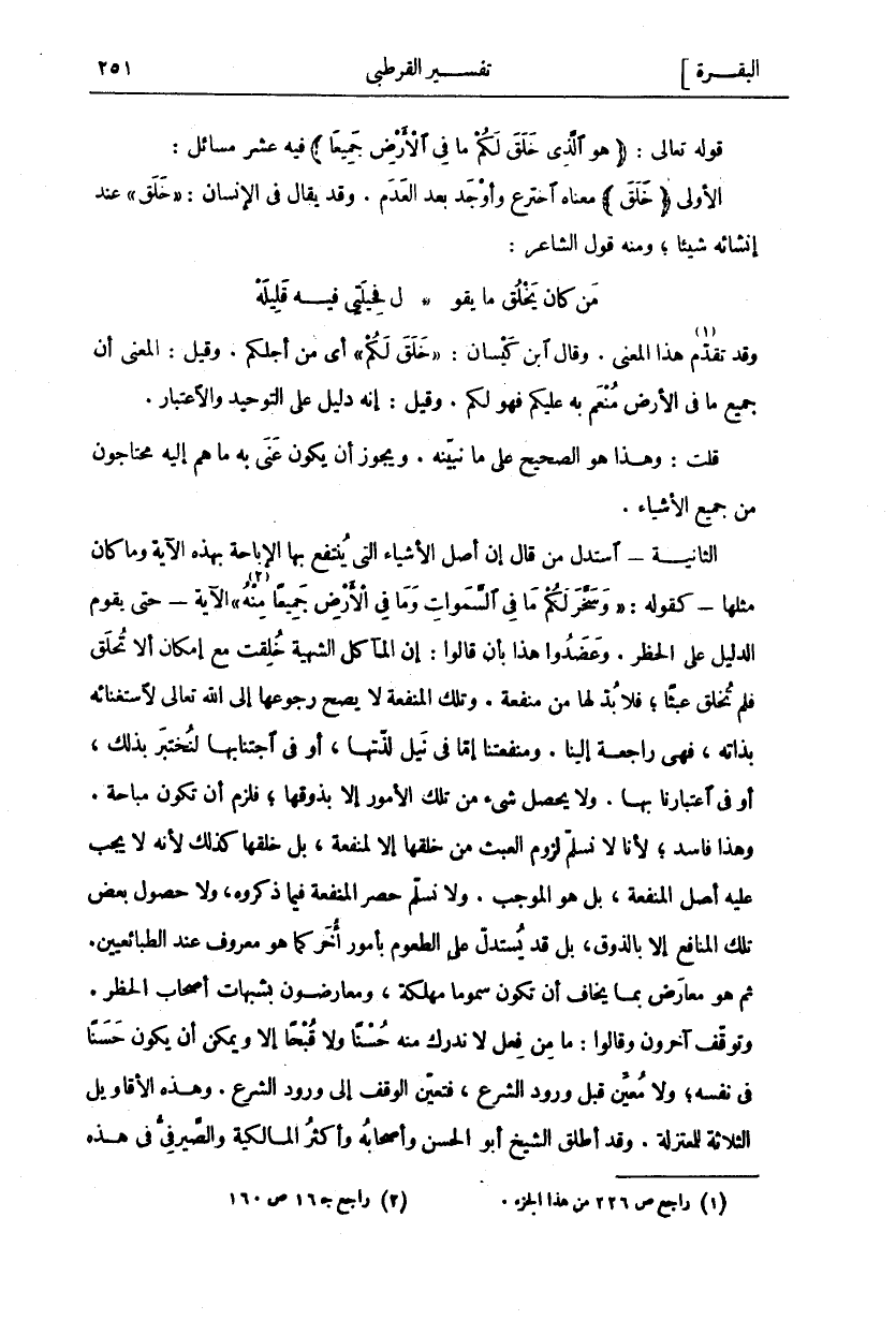 وَقَدْ تَقَدَّمَ «١» هَذَا الْمَعْنَى. وَقَالَ ابْنُ كَيْسَانَ:" خَلَقَ لَكُمْ" أَيْ مِنْ أَجْلِكُمْ. وَقِيلَ: الْمَعْنَى أَنَّ جَمِيعَ مَا فِي الْأَرْضِ مُنْعَمٌ بِهِ عَلَيْكُمْ فَهُوَ لَكُمْ. وَقِيلَ: إِنَّهُ دَلِيلٌ عَلَى التَّوْحِيدِ وَالِاعْتِبَارِ. قُلْتُ: وَهَذَا هُوَ الصَّحِيحُ عَلَى مَا نُبَيِّنُهُ. وَيَجُوزُ أَنْ يَكُونَ عُنِيَ بِهِ مَا هُمْ إِلَيْهِ مُحْتَاجُونَ مِنْ جَمِيعِ الْأَشْيَاءِ. الثَّانِيَةُ- اسْتَدَلَّ مَنْ قَالَ إِنَّ أَصْلَ الْأَشْيَاءِ الَّتِي يُنْتَفَعُ بِهَا الْإِبَاحَةُ بِهَذِهِ الْآيَةِ وَمَا كَانَ مِثْلَهَا- كَقَوْلِهِ:" وَسَخَّرَ لَكُمْ مَا فِي السَّماواتِ وَما فِي الْأَرْضِ جَمِيعاً مِنْهُ «٢» " [الجاثية: ١٣] الْآيَةَ- حَتَّى يَقُومَ الدَّلِيلُ عَلَى الْحَظْرِ. وَعَضَّدُوا هَذَا بِأَنْ قَالُوا: إِنَّ الْمَآكِلَ الشَّهِيَّةَ خُلِقَتْ مَعَ إِمْكَانِ أَلَّا تُخْلَقَ فَلَمْ تُخْلَقْ عَبَثًا، فَلَا بُدَّ لَهَا مِنْ مَنْفَعَةٍ. وَتِلْكَ الْمَنْفَعَةُ لَا يَصِحُّ رُجُوعُهَا إِلَى اللَّهِ تَعَالَى لِاسْتِغْنَائِهِ بِذَاتِهِ، فَهِيَ رَاجِعَةٌ إِلَيْنَا. وَمَنْفَعَتُنَا إِمَّا فِي نَيْلِ لَذَّتِهَا، أَوْ فِي اجْتِنَابِهَا لِنُخْتَبَرَ بِذَلِكَ، أو في اعتبارنا بها. ولا يحصل شي مِنْ تِلْكَ الْأُمُورِ إِلَّا بِذَوْقِهَا، فَلَزِمَ أَنْ تَكُونَ مُبَاحَةً. وَهَذَا فَاسِدٌ، لِأَنَّا لَا نُسَلِّمُ لُزُومَ الْعَبَثِ مِنْ خَلْقِهَا إِلَّا لِمَنْفَعَةٍ، بَلْ خَلَقَهَا كَذَلِكَ لِأَنَّهُ لَا يَجِبُ عَلَيْهِ أَصْلُ الْمَنْفَعَةِ، بَلْ هُوَ الْمُوجِبُ. وَلَا نُسَلِّمُ حَصْرَ الْمَنْفَعَةِ فِيمَا ذَكَرُوهُ، وَلَا حُصُولَ بَعْضِ تِلْكَ الْمَنَافِعِ إِلَّا بِالذَّوْقِ، بَلْ قَدْ يُسْتَدَلُّ عَلَى الطُّعُومِ بِأُمُورٍ أُخَرَ كَمَا هُوَ مَعْرُوفٌ عِنْدَ الطَّبَائِعِيِّينَ. ثُمَّ هُوَ مُعَارَضٌ بِمَا يُخَافُ أَنْ تَكُونَ سُمُومًا مُهْلِكَةً، وَمُعَارَضُونَ بِشُبُهَاتِ أَصْحَابِ الْحَظْرِ. وَتَوَقَّفَ آخَرُونَ وَقَالُوا: مَا مِنْ فِعْلٍ لَا نُدْرِكُ مِنْهُ حُسْنًا وَلَا قُبْحًا إِلَّا وَيُمْكِنُ أَنْ يَكُونَ حَسَنًا فِي نَفْسِهِ، وَلَا مُعَيِّنَ قَبْلَ وُرُودِ الشَّرْعِ، فَتَعَيَّنَ الْوَقْفُ إِلَى وُرُودِ الشَّرْعِ. وَهَذِهِ الْأَقَاوِيلُ الثَّلَاثَةُ لِلْمُعْتَزِلَةِ. وَقَدْ أَطْلَقَ الشَّيْخُ أَبُو الْحَسَنِ وَأَصْحَابُهُ وَأَكْثَرُ الْمَالِكِيَّةِ وَالصَّيْرَفِيُّ في هذه