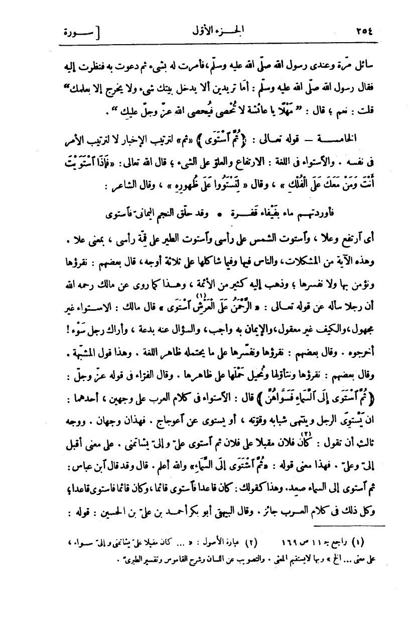اسْتَوى " [طه: ٥] قَالَ مَالِكٌ: الِاسْتِوَاءُ غَيْرُ مَجْهُولٍ، وَالْكَيْفُ غَيْرُ مَعْقُولٍ، وَالْإِيمَانُ بِهِ وَاجِبٌ، وَالسُّؤَالُ عَنْهُ بِدْعَةٌ، وَأَرَاكَ رَجُلَ سَوْءٍ! أَخْرِجُوهُ. وَقَالَ بَعْضُهُمْ: نَقْرَؤُهَا وَنُفَسِّرُهَا عَلَى مَا يَحْتَمِلُهُ ظَاهِرُ اللُّغَةِ. وَهَذَا قَوْلُ الْمُشَبِّهَةِ. وَقَالَ بَعْضُهُمْ: نَقْرَؤُهَا وَنَتَأَوَّلُهَا وَنُحِيلُ حَمْلَهَا عَلَى ظَاهِرِهَا. وَقَالَ الْفَرَّاءُ فِي قَوْلِهِ عَزَّ وَجَلَّ:" ثُمَّ اسْتَوى إِلَى السَّماءِ فَسَوَّاهُنَّ" قَالَ: الِاسْتِوَاءُ فِي كَلَامِ الْعَرَبِ عَلَى وَجْهَيْنِ، أَحَدِهِمَا: أَنْ يَسْتَوِيَ الرَّجُلُ وَيَنْتَهِيَ شَبَابُهُ وَقُوَّتُهُ، أَوْ يَسْتَوِيَ عَنِ اعْوِجَاجٍ. فَهَذَانَ وَجْهَانِ. وَوَجْهٌ ثَالِثٌ أَنْ تَقُولَ: كَانَ «٢» فُلَانٌ مُقْبِلًا عَلَى فُلَانٍ ثُمَّ اسْتَوَى عَلَيَّ وَإِلَيَّ يُشَاتِمُنِي. عَلَى مَعْنَى أَقْبَلَ إِلَيَّ وَعَلَيَّ. فَهَذَا مَعْنَى قَوْلِهِ:" ثُمَّ اسْتَوى إِلَى السَّماءِ" وَاللَّهُ أَعْلَمُ. قَالَ وَقَدْ قَالَ ابْنُ عَبَّاسٍ: ثُمَّ اسْتَوَى إِلَى السَّمَاءِ صَعِدَ. وَهَذَا كَقَوْلِكَ: كَانَ قَاعِدًا فَاسْتَوَى قَائِمًا، وَكَانَ قَائِمًا فَاسْتَوَى قَاعِدًا، وَكُلُّ ذَلِكَ فِي كَلَامِ الْعَرَبِ جَائِزٌ. وَقَالَ الْبَيْهَقِيُّ أَبُو بَكْرٍ أَحْمَدُ بْنُ عَلِيِّ بْنِ الْحُسَيْنِ: قَوْلُهُ: