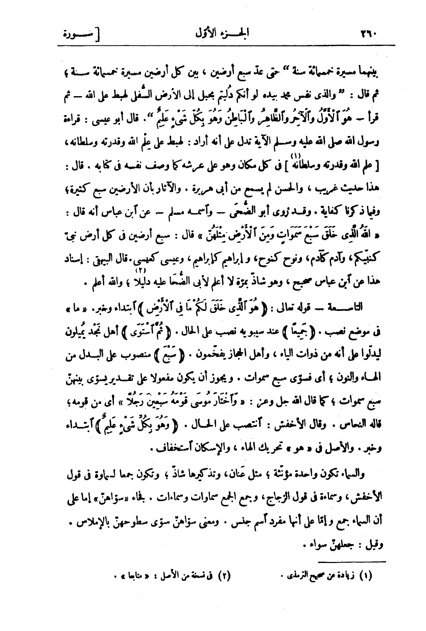 بَيْنَهُمَا مَسِيرَةُ خَمْسِمِائَةِ سَنَةٍ) حَتَّى عَدَّ سَبْعَ أَرَضِينَ، بَيْنَ كُلِّ أَرْضَيْنِ مَسِيرَةُ خَمْسِمِائَةِ سَنَةٍ، ثُمَّ قَالَ: (وَالَّذِي نَفْسُ مُحَمَّدٍ بِيَدِهِ لَوْ أَنَّكُمْ دَلَّيْتُمْ بِحَبْلٍ إِلَى الْأَرْضِ السُّفْلَى لَهَبَطَ عَلَى اللَّهِ- ثُمَّ قَرَأَ- هُوَ الْأَوَّلُ وَالْآخِرُ وَالظَّاهِرُ وَالْبَاطِنُ وَهُوَ بِكُلِّ شي عَلِيمُ (. قَالَ أَبُو عِيسَى: قِرَاءَةُ رَسُولِ اللَّهِ صَلَّى اللَّهُ عَلَيْهِ وَسَلَّمَ الْآيَةَ تَدُلُّ عَلَى أَنَّهُ أَرَادَ: لَهَبَطَ عَلَى عِلْمِ اللَّهِ وَقُدْرَتِهِ وسلطانه، [عِلْمِ اللَّهِ وَقُدْرَتِهِ وَسُلْطَانِهِ «١»] فِي كُلِّ مَكَانٍ وَهُوَ عَلَى عَرْشِهِ كَمَا وَصَفَ نَفْسَهُ فِي كِتَابِهِ. قَالَ: هَذَا حَدِيثٌ غَرِيبٌ، وَالْحَسَنُ لَمْ يَسْمَعْ مِنْ أَبِي هُرَيْرَةَ. وَالْآثَارُ بِأَنَّ الْأَرَضِينَ سَبْعٌ كَثِيرَةٌ، وَفِيمَا ذَكَرْنَا كِفَايَةٌ. وَقَدْ رَوَى أَبُو الضُّحَى- وَاسْمُهُ مُسْلِمٌ- عَنِ ابْنِ عَبَّاسٍ أَنَّهُ قَالَ:" اللَّهُ الَّذِي خَلَقَ سَبْعَ سَماواتٍ وَمِنَ الْأَرْضِ مِثْلَهُنَّ" [الطلاق: ١٢] قَالَ: سَبْعُ أَرَضِينَ فِي كُلِّ أَرْضٍ نَبِيٌّ كَنَبِيِّكُمْ، وَآدَمُ كَآدَمَ، وَنُوحٌ كَنُوحٍ، وَإِبْرَاهِيمُ كَإِبْرَاهِيمَ، وَعِيسَى كَعِيسَى. قَالَ الْبَيْهَقِيُّ: إِسْنَادُ هَذَا عَنِ ابْنِ عَبَّاسٍ صَحِيحٌ، وَهُوَ شَاذٌّ بِمُرَّةَ لَا أَعْلَمُ لِأَبِي الضُّحَى عَلَيْهِ دَلِيلًا «٢»، وَاللَّهُ أَعْلَمُ. التَّاسِعَةُ- قَوْلُهُ تَعَالَى:" هُوَ الَّذِي خَلَقَ لَكُمْ مَا فِي الْأَرْضِ" ابْتِدَاءٌ وَخَبَرٌ." مَا" فِي مَوْضِعِ نَصْبٍ." جَمِيعاً" عِنْدَ سِيبَوَيْهِ نَصْبٌ عَلَى الْحَالِ" ثُمَّ اسْتَوى " أَهْلُ نَجْدٍ يُمِيلُونَ لِيَدُلُّوا عَلَى أَنَّهُ مِنْ ذَوَاتِ الْيَاءِ، وَأَهْلُ الْحِجَازِ يُفَخِّمُونَ." سَبْعَ" مَنْصُوبٌ عَلَى الْبَدَلِ مِنَ الْهَاءِ والنون، أي فسوى سبع سموات. وَيَجُوزُ أَنْ يَكُونَ مَفْعُولًا عَلَى تَقْدِيرِ يُسَوِّي بينهن سبع سموات، كما قال الله عز وجل:" وَاخْتارَ مُوسى قَوْمَهُ سَبْعِينَ رَجُلًا" [الأعراف: ١٥٥] أي من قومه، قال النَّحَّاسُ. وَقَالَ الْأَخْفَشُ: انْتَصَبَ عَلَى الْحَالِ." وَهُوَ بِكُلِّ شَيْءٍ عَلِيمٌ" ابْتِدَاءٌ وَخَبَرٌ. وَالْأَصْلُ فِي" هُوَ" تَحْرِيكُ الْهَاءِ، وَالْإِسْكَانُ اسْتِخْفَافٌ. وَالسَّمَاءُ تَكُونُ وَاحِدَةٌ مُؤَنَّثَةٌ، مِثْلَ عَنَانٍ، وَتَذْكِيرُهَا شَاذٌّ، وَتَكُونُ جَمْعًا لِسَمَاوَةٍ فِي قَوْلِ الْأَخْفَشِ، وَسَمَاءَةٍ فِي قَوْلِ الزَّجَّاجِ، وَجَمْعُ الْجَمْعِ سَمَاوَاتٍ وَسَمَاءَاتٍ. فَجَاءَ" سَوَّاهُنَّ" إِمَّا عَلَى أَنَّ السَّمَاءَ جَمْعٌ وَإِمَّا عَلَى أَنَّهَا مُفْرَدُ اسْمِ جِنْسٍ. وَمَعْنَى سَوَّاهُنَّ سوى سطوحهن بالاملاس. وقيل: جعلهن سواء.