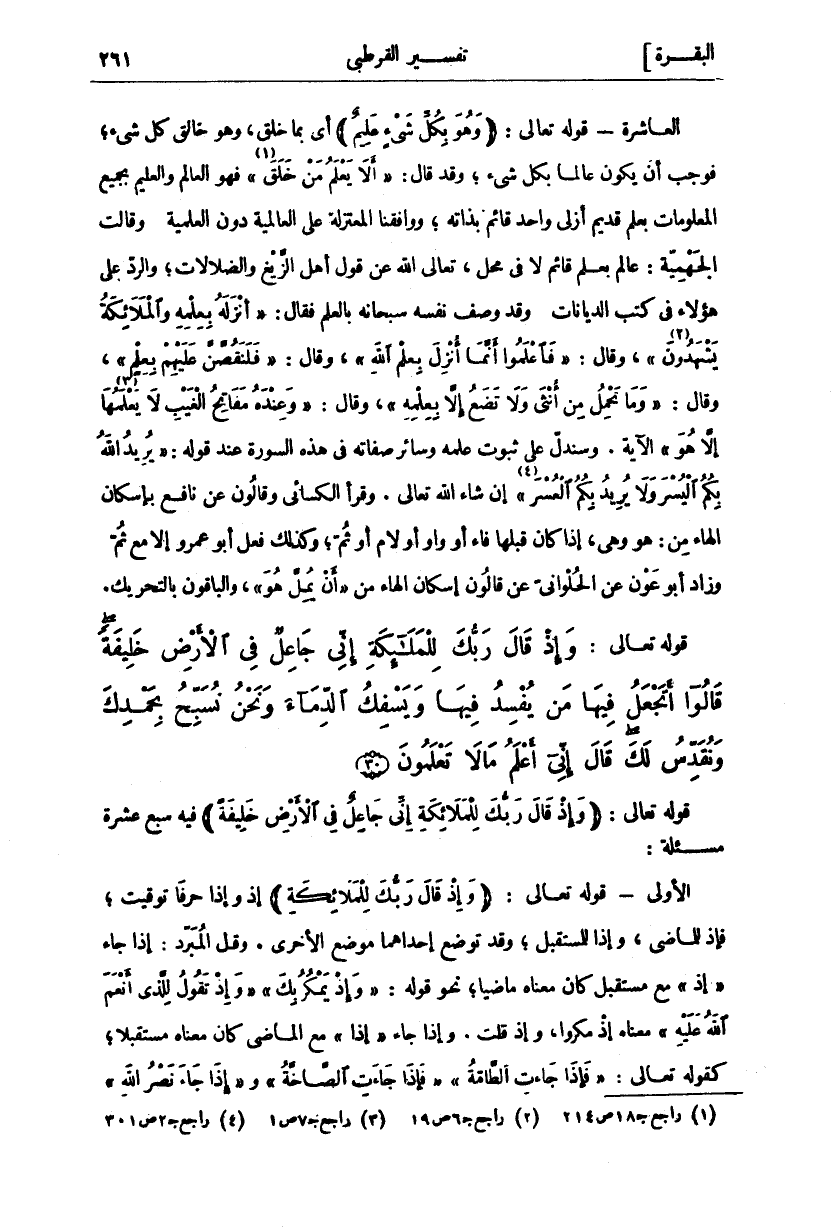 قَوْلُهُ تَعَالَى: (وَإِذْ قالَ رَبُّكَ لِلْمَلائِكَةِ إِنِّي جاعِلٌ فِي الْأَرْضِ خَلِيفَةً) فِيهِ سَبْعَ عَشْرَةَ مَسْأَلَةً: الْأُولَى: قَوْلُهُ تَعَالَى" وَإِذْ قالَ رَبُّكَ لِلْمَلائِكَةِ" إِذْ وَإِذَا حَرْفَا تَوْقِيتٍ، فَإِذْ لِلْمَاضِي، وَإِذَا لِلْمُسْتَقْبَلِ، وَقَدْ تُوضَعُ إِحْدَاهُمَا مَوْضِعَ الْأُخْرَى. وَقَالَ الْمُبَرِّدُ: إِذَا جَاءَ" إِذْ" مَعَ مُسْتَقْبَلٍ كَانَ مَعْنَاهُ مَاضِيًا، نَحْوَ قَوْلِهِ:" وَإِذْ يَمْكُرُ بِكَ" [الأنفال: ٣٠] " وَإِذْ تَقُولُ لِلَّذِي أَنْعَمَ اللَّهُ عَلَيْهِ" [الأحزاب: ٣٧] معناه إذ مَكَرُوا، وَإِذْ قُلْتَ. وَإِذَا جَاءَ" إِذَا" مَعَ الْمَاضِي كَانَ مَعْنَاهُ مُسْتَقْبَلًا، كَقَوْلِهِ تَعَالَى:" فَإِذا جاءَتِ الطَّامَّةُ" [النازعات: ٣٤] " فَإِذا جاءَتِ الصَّاخَّةُ" [عبس: ٣٣] و" إِذا جاءَ نَصْرُ اللَّهِ" [النصر: ١]