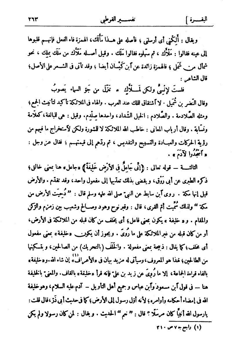 وَقَالَ النَّضْرُ بْنُ شُمَيْلٍ. لَا اشْتِقَاقَ لِلْمَلَكِ عِنْدَ الْعَرَبِ. وَالْهَاءُ فِي الْمَلَائِكَةِ تَأْكِيدٌ لِتَأْنِيثِ الْجَمْعِ، وَمِثْلُهُ الصَّلَادِمَةُ. وَالصَّلَادِمُ: الْخَيْلُ الشِّدَادُ، وَاحِدُهَا صِلْدِمٌ. وَقِيلَ: هِيَ لِلْمُبَالَغَةِ، كَعَلَّامَةٍ وَنَسَّابَةٍ. وَقَالَ أَرْبَابُ الْمَعَانِي: خَاطَبَ اللَّهُ الْمَلَائِكَةَ لَا لِلْمَشُورَةِ وَلَكِنْ لِاسْتِخْرَاجِ مَا فِيهِمْ مِنْ رُؤْيَةِ الْحَرَكَاتِ وَالْعِبَادَةِ وَالتَّسْبِيحِ وَالتَّقْدِيسِ، ثُمَّ رَدَّهُمْ إِلَى قِيمَتِهِمْ، فَقَالَ عَزَّ وجل:" اسْجُدُوا لِآدَمَ" [البقرة: ٣٤]. الثَّالِثَةُ: قَوْلُهُ تَعَالَى:" إِنِّي جاعِلٌ فِي الْأَرْضِ خَلِيفَةً"" جَاعِلٌ" هُنَا بِمَعْنَى خَالِقٌ، ذَكَرَهُ الطَّبَرِيُّ عَنْ أَبِي رَوْقٍ، وَيَقْضِي بِذَلِكَ تَعَدِّيهَا إِلَى مَفْعُولٍ وَاحِدٍ، وَقَدْ تَقَدَّمَ. وَالْأَرْضُ قِيلَ إِنَّهَا مَكَّةُ. رَوَى ابْنُ سَابِطٍ عَنِ النَّبِيِّ صَلَّى اللَّهُ عَلَيْهِ وَسَلَّمَ قَالَ: (دُحِيَتِ الْأَرْضُ مِنْ مَكَّةَ) وَلِذَلِكَ سُمِّيَتْ أُمَّ الْقُرَى، قَالَ: وَقَبْرُ نُوحٍ وَهُودٍ وَصَالِحٍ وَشُعَيْبٍ بَيْنَ زَمْزَمَ وَالرُّكْنِ والمقام. و" خَلِيفَةً" يَكُونُ بِمَعْنَى فَاعِلٍ، أَيْ يَخْلُفُ مَنْ كَانَ قَبْلَهُ مِنَ الْمَلَائِكَةِ فِي الْأَرْضِ، أَوْ مَنْ كَانَ قَبْلَهُ مِنْ غَيْرِ الْمَلَائِكَةِ عَلَى مَا رُوِيَ. وَيَجُوزُ أَنْ يَكُونَ" خَلِيفَةً" بِمَعْنَى مَفْعُولٍ أَيْ مُخْلَفٍ، كَمَا يُقَالُ: ذَبِيحَةٌ بِمَعْنَى مَفْعُولَةٍ. وَالْخَلَفُ (بِالتَّحْرِيكِ) مِنَ الصَّالِحِينَ، وَبِتَسْكِينِهَا مِنَ الطَّالِحِينَ، هَذَا هُوَ الْمَعْرُوفُ، وَسَيَأْتِي لَهُ مَزِيدُ بَيَانٍ فِي" الْأَعْرَافِ «١» " إِنْ شَاءَ اللَّهُ. وَ" خَلِيفَةً" بِالْفَاءِ قِرَاءَةُ الْجَمَاعَةِ، إِلَّا مَا رُوِيَ عَنْ زَيْدِ بْنِ عَلِيٍّ فَإِنَّهُ قَرَأَ" خَلِيقَةً" بِالْقَافِ. وَالْمَعْنِيُّ بِالْخَلِيفَةِ هُنَا- فِي قَوْلِ ابْنِ مَسْعُودٍ وَابْنِ عَبَّاسٍ وَجَمِيعِ أَهْلِ التَّأْوِيلِ- آدَمُ عَلَيْهِ السَّلَامُ، وَهُوَ خَلِيفَةُ اللَّهِ فِي إِمْضَاءِ أَحْكَامِهِ وَأَوَامِرِهِ، لِأَنَّهُ أَوَّلُ رَسُولٍ إِلَى الْأَرْضِ، كَمَا فِي حَدِيثِ أَبِي ذَرٍّ، قَالَ قُلْتُ: يَا رَسُولَ اللَّهِ انبئا كَانَ مُرْسَلًا؟ قَالَ: (نَعَمْ) الْحَدِيثَ وَيُقَالُ: لِمَنْ كان رسولا ولم يكن