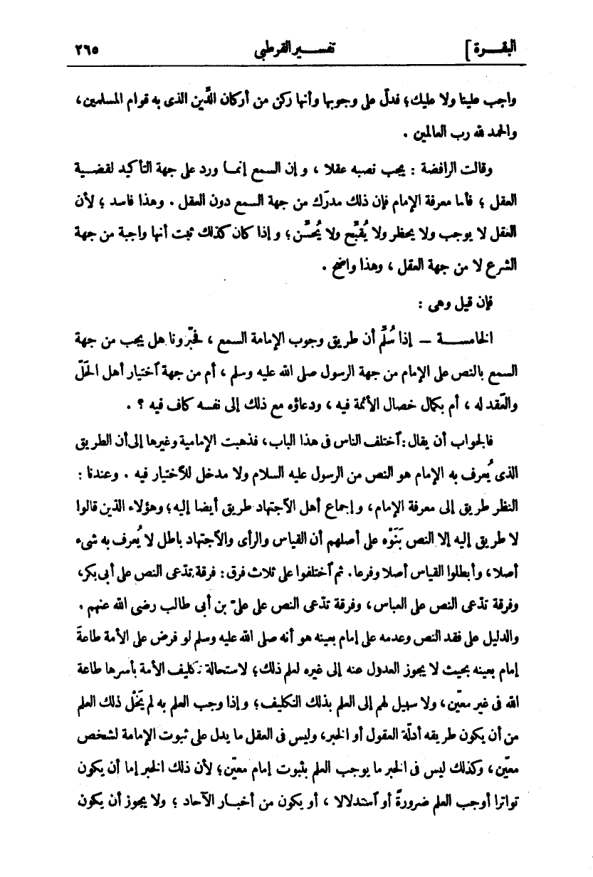 وَاجِبٍ عَلَيْنَا وَلَا عَلَيْكَ، فَدَلَّ عَلَى وُجُوبِهَا وَأَنَّهَا رُكْنٌ مِنْ أَرْكَانِ الدِّينِ الَّذِي بِهِ قِوَامُ الْمُسْلِمِينَ، وَالْحَمْدُ لِلَّهِ رَبِّ الْعَالَمِينَ. وَقَالَتِ الرَّافِضَةُ: يَجِبُ نَصْبُهُ عَقْلًا، وَإِنَّ السَّمْعَ إِنَّمَا وَرَدَ عَلَى جِهَةِ التَّأْكِيدِ لِقَضِيَّةِ الْعَقْلِ، فَأَمَّا مَعْرِفَةُ الْإِمَامِ فَإِنَّ ذَلِكَ مُدْرَكٌ مِنْ جِهَةِ السَّمْعِ دُونَ الْعَقْلِ. وَهَذَا فَاسِدٌ، لِأَنَّ الْعَقْلَ لَا يُوجِبُ وَلَا يَحْظُرُ وَلَا يُقَبِّحُ وَلَا يُحَسِّنُ، وَإِذَا كَانَ كَذَلِكَ ثَبَتَ أَنَّهَا وَاجِبَةٌ مِنْ جِهَةِ الشَّرْعِ لَا مِنْ جِهَةِ الْعَقْلِ، وَهَذَا وَاضِحٌ. فَإِنْ قِيلَ وَهِيَ: الْخَامِسَةُ- إِذَا سلم أن طريق وجوب الامامة السمع، فحبرونا هَلْ يَجِبُ مِنْ جِهَةِ السَّمْعِ بِالنَّصِّ عَلَى الْإِمَامِ مِنْ جِهَةِ الرَّسُولِ صَلَّى اللَّهُ عَلَيْهِ وَسَلَّمَ، أَمْ مِنْ جِهَةِ اخْتِيَارِ أَهْلِ الْحَلِّ وَالْعَقْدِ لَهُ، أَمْ بِكَمَالِ خِصَالِ الْأَئِمَّةِ فِيهِ، وَدُعَاؤُهُ مَعَ ذَلِكَ إِلَى نَفْسِهِ كَافٍ فِيهِ؟. فَالْجَوَابُ أَنْ يُقَالَ: اخْتَلَفَ النَّاسُ فِي هَذَا الْبَابِ، فَذَهَبَتِ الْإِمَامِيَّةُ وَغَيْرُهَا إِلَى أَنَّ الطَّرِيقَ الَّذِي يُعْرَفُ بِهِ الْإِمَامُ هُوَ النَّصُّ مِنَ الرَّسُولِ عَلَيْهِ السَّلَامُ وَلَا مَدْخَلَ لِلِاخْتِيَارِ فِيهِ. وَعِنْدَنَا: النَّظَرُ طَرِيقٌ إِلَى مَعْرِفَةِ الْإِمَامِ، وَإِجْمَاعُ أَهْلِ الِاجْتِهَادِ طَرِيقٌ أَيْضًا إِلَيْهِ، وَهَؤُلَاءِ الَّذِينَ قَالُوا لَا طَرِيقَ إِلَيْهِ إِلَّا النَّصَّ بَنَوْهُ عَلَى أَصْلِهِمْ أَنَّ الْقِيَاسَ وَالرَّأْيَ وَالِاجْتِهَادَ بَاطِلٌ لا يعرف به شي أَصْلًا، وَأَبْطَلُوا الْقِيَاسَ أَصْلًا وَفَرْعًا. ثُمَّ اخْتَلَفُوا عَلَى ثَلَاثِ فِرَقٍ: فِرْقَةٍ تَدَّعِي النَّصَّ عَلَى أَبِي بَكْرٍ، وَفِرْقَةٍ تَدَّعِي النَّصَّ عَلَى الْعَبَّاسِ، وَفِرْقَةٍ تَدَّعِي النَّصَّ عَلَى عَلِيِّ بْنِ أَبِي طَالِبٍ رَضِيَ اللَّهُ عَنْهُمْ. وَالدَّلِيلُ عَلَى فَقْدِ النَّصِّ وَعَدَمِهِ عَلَى إِمَامٍ بِعَيْنِهِ هُوَ أَنَّهُ صَلَّى اللَّهُ عَلَيْهِ وَسَلَّمَ لَوْ فَرَضَ عَلَى الْأُمَّةِ طَاعَةَ إِمَامٍ بِعَيْنِهِ بِحَيْثُ لَا يَجُوزُ الْعُدُولُ عَنْهُ إِلَى غَيْرِهِ لَعُلِمَ ذَلِكَ، لِاسْتِحَالَةِ تَكْلِيفِ الْأُمَّةِ بِأَسْرِهَا طَاعَةَ اللَّهِ فِي غَيْرِ مُعَيَّنٍ، وَلَا سَبِيلَ لَهُمْ إِلَى الْعِلْمِ بِذَلِكَ التَّكْلِيفِ، وَإِذَا وَجَبَ الْعِلْمُ بِهِ لَمْ يَخْلُ ذَلِكَ الْعِلْمُ مِنْ أَنْ يَكُونَ طَرِيقُهُ أَدِلَّةَ الْعُقُولِ أَوِ الْخَبَرَ، وَلَيْسَ فِي الْعَقْلِ مَا يَدُلُّ عَلَى ثُبُوتِ الْإِمَامَةِ لِشَخْصٍ مُعَيَّنٍ، وَكَذَلِكَ ليس في الحبر مَا يُوجِبُ الْعِلْمَ بِثُبُوتِ إِمَامٍ مُعَيَّنٍ، لِأَنَّ ذَلِكَ الْخَبَرَ إِمَّا أَنْ يَكُونَ تَوَاتُرًا أَوْجَبَ الْعِلْمَ ضَرُورَةً أَوِ اسْتِدْلَالًا، أَوْ يَكُونَ مِنْ أَخْبَارِ الْآحَادِ، وَلَا يَجُوزُ أَنْ يَكُونَ