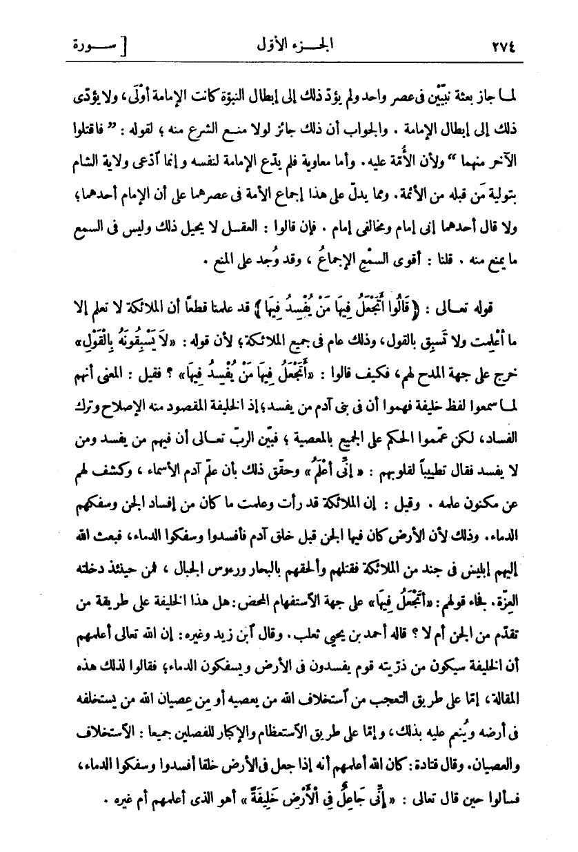 لَمَّا جَازَ بَعْثَةُ نَبِيَّيْنِ فِي عَصْرٍ وَاحِدٍ وَلَمْ يُؤَدِّ ذَلِكَ إِلَى إِبْطَالِ النُّبُوَّةِ كَانَتِ الامامة أولى، ولا تؤدي ذَلِكَ إِلَى إِبْطَالِ الْإِمَامَةِ. وَالْجَوَابُ أَنَّ ذَلِكَ جَائِزٌ لَوْلَا مَنْعُ الشَّرْعِ مِنْهُ، لِقَوْلِهِ: (فَاقْتُلُوا الْآخَرَ مِنْهُمَا) وَلِأَنَّ الْأُمَّةَ عَلَيْهِ. وَأَمَّا مُعَاوِيَةُ فَلَمْ يَدَّعِ الْإِمَامَةَ لِنَفْسِهِ وَإِنَّمَا ادَّعَى وِلَايَةَ الشَّامِ بِتَوْلِيَةِ مَنْ قَبْلَهُ مِنَ الْأَئِمَّةِ. وَمِمَّا يَدُلُّ عَلَى هَذَا إِجْمَاعُ الْأُمَّةِ فِي عَصْرِهِمَا عَلَى أَنَّ الْإِمَامَ أَحَدُهُمَا، وَلَا قَالَ أَحَدُهُمَا إِنِّي إِمَامٌ وَمُخَالِفِي إِمَامٌ. فَإِنْ قَالُوا: الْعَقْلُ لَا يُحِيلُ ذَلِكَ وَلَيْسَ فِي السَّمْعِ مَا يمنع منه. وقلنا: أَقْوَى السَّمْعِ الْإِجْمَاعُ، وَقَدْ وُجِدَ عَلَى الْمَنْعِ. قَوْلُهُ تَعَالَى: (قالُوا أَتَجْعَلُ فِيها مَنْ يُفْسِدُ فِيها) قَدْ عَلِمْنَا قَطْعًا أَنَّ الْمَلَائِكَةَ لَا تَعْلَمُ إِلَّا مَا أُعْلِمَتْ وَلَا تَسْبِقُ بِالْقَوْلِ، وَذَلِكَ عَامٌّ فِي جَمِيعِ الْمَلَائِكَةِ، لِأَنَّ قَوْلَهُ:" لَا يَسْبِقُونَهُ بِالْقَوْلِ" خَرَجَ عَلَى جِهَةِ الْمَدْحِ لَهُمْ، فَكَيْفَ قَالُوا:" أَتَجْعَلُ فِيها مَنْ يُفْسِدُ فِيها"؟ فَقِيلَ: الْمَعْنَى أَنَّهُمْ لَمَّا سَمِعُوا لَفْظَ خَلِيفَةٍ فَهِمُوا أَنَّ فِي بَنِي آدَمَ مَنْ يُفْسِدُ، إِذِ الْخَلِيفَةُ الْمَقْصُودُ مِنْهُ الْإِصْلَاحُ وَتَرْكُ الْفَسَادِ، لَكِنْ عَمَّمُوا الْحُكْمَ عَلَى الْجَمِيعِ بِالْمَعْصِيَةِ، فَبَيَّنَ الرَّبُّ تَعَالَى أَنَّ فِيهِمْ مَنْ يُفْسِدُ وَمَنْ لَا يُفْسِدُ فَقَالَ تَطْيِيبًا لِقُلُوبِهِمْ:" إِنِّي أَعْلَمُ" وَحَقَّقَ ذَلِكَ بِأَنْ عَلَّمَ آدَمَ الْأَسْمَاءَ، وَكَشَفَ لَهُمْ عَنْ مَكْنُونِ عِلْمِهِ. وَقِيلَ: إِنَّ الْمَلَائِكَةَ قَدْ رَأَتْ وَعَلِمَتْ مَا كَانَ مِنْ إِفْسَادِ الْجِنِّ وَسَفْكِهِمُ الدِّمَاءَ. وَذَلِكَ لِأَنَّ الْأَرْضَ كَانَ فِيهَا الْجِنُّ قَبْلَ خَلْقِ آدَمَ فَأَفْسَدُوا وَسَفَكُوا الدِّمَاءَ، فَبَعَثَ اللَّهُ إِلَيْهِمْ إِبْلِيسَ فِي جُنْدٍ مِنَ الْمَلَائِكَةِ فَقَتَلَهُمْ وَأَلْحَقَهُمْ بِالْبِحَارِ وَرُءُوسِ الْجِبَالِ، فَمِنْ حِينَئِذٍ دَخَلَتْهُ الْعِزَّةُ. فَجَاءَ قَوْلُهُمْ:" أَتَجْعَلُ فِيها" عَلَى جِهَةِ الِاسْتِفْهَامِ الْمَحْضِ: هَلْ هَذَا الْخَلِيفَةُ عَلَى طَرِيقَةِ مَنْ تَقَدَّمَ مِنَ الْجِنِّ أَمْ لَا؟ قَالَ أَحْمَدُ بْنُ يَحْيَى ثَعْلَبٌ. وَقَالَ ابْنُ زَيْدٍ وَغَيْرُهُ. إِنَّ اللَّهَ تَعَالَى أَعْلَمَهُمْ أَنَّ الْخَلِيفَةَ سَيَكُونُ مِنْ ذُرِّيَّتِهِ قَوْمٌ يُفْسِدُونَ فِي الْأَرْضِ وَيَسْفِكُونَ الدِّمَاءَ، فَقَالُوا لِذَلِكَ هَذِهِ الْمَقَالَةَ، إِمَّا عَلَى طَرِيقِ التَّعَجُّبِ مِنَ اسْتِخْلَافِ اللَّهِ مَنْ يَعْصِيهِ أَوْ مِنْ عِصْيَانِ اللَّهِ مَنْ يَسْتَخْلِفُهُ فِي أَرْضِهِ وَيُنْعِمُ عَلَيْهِ بِذَلِكَ، وَإِمَّا عَلَى طَرِيقِ الِاسْتِعْظَامِ وَالْإِكْبَارِ لِلْفَصْلَيْنِ جَمِيعًا: الِاسْتِخْلَافُ وَالْعِصْيَانُ. وَقَالَ قَتَادَةُ: كَانَ اللَّهُ أَعْلَمَهُمْ أَنَّهُ إِذَا جَعَلَ فِي الْأَرْضِ خَلْقًا أَفْسَدُوا وَسَفَكُوا الدِّمَاءَ، فَسَأَلُوا حِينَ قَالَ تَعَالَى:" إِنِّي جاعِلٌ فِي الْأَرْضِ خَلِيفَةً" أَهُوَ الَّذِي أَعْلَمَهُمْ أَمْ غَيْرُهُ.
