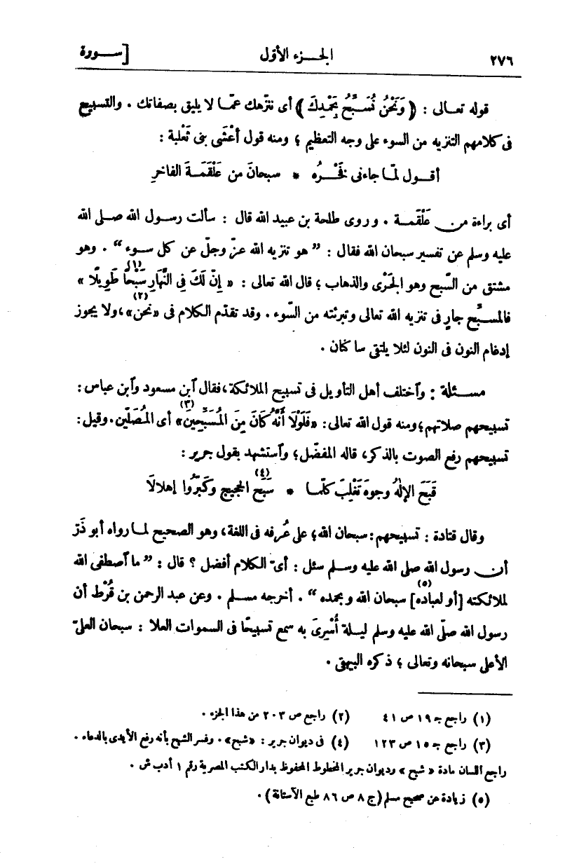 أَيْ بَرَاءَةٌ مِنْ عَلْقَمَةَ. وَرَوَى طَلْحَةُ بْنُ عُبَيْدِ اللَّهِ قَالَ: سَأَلْتُ رَسُولَ اللَّهِ صَلَّى اللَّهُ عَلَيْهِ وَسَلَّمَ عَنْ تَفْسِيرِ سُبْحَانَ اللَّهِ فَقَالَ: (هُوَ تَنْزِيهُ اللَّهِ عَزَّ وَجَلَّ عَنْ كُلِّ سُوءٍ). وَهُوَ مُشْتَقٌّ مِنَ السَّبْحِ وَهُوَ الْجَرْيُ وَالذَّهَابُ، قَالَ اللَّهُ تَعَالَى:" إِنَّ لَكَ فِي النَّهارِ سَبْحاً «١» طَوِيلًا" [المزمل: ٧] فَالْمُسَبِّحُ جَارٍ فِي تَنْزِيهِ اللَّهِ تَعَالَى وَتَبْرِئَتِهِ مِنَ السُّوءِ. وَقَدْ تَقَدَّمَ الْكَلَامُ فِي" نَحْنُ" «٢»، وَلَا يَجُوزُ إِدْغَامُ النُّونِ فِي النُّونِ لِئَلَّا يَلْتَقِيَ سَاكِنَانِ. مَسْأَلَةٌ: وَاخْتَلَفَ أَهْلُ التَّأْوِيلِ فِي تَسْبِيحِ الْمَلَائِكَةِ، فَقَالَ ابْنُ مَسْعُودٍ وَابْنُ عَبَّاسٍ: تسبيحهم صلاتهم، ومنه قول الله تعالى:" فَلَوْلا أَنَّهُ كانَ مِنَ الْمُسَبِّحِينَ «٣» " [الصافات: ١٤٣] أَيِ الْمُصَلِّينَ. وَقِيلَ: تَسْبِيحُهُمْ رَفْعُ الصَّوْتِ بِالذِّكْرِ، قَالَهُ الْمُفَضَّلُ، وَاسْتَشْهَدَ بِقَوْلِ جَرِيرٍ: