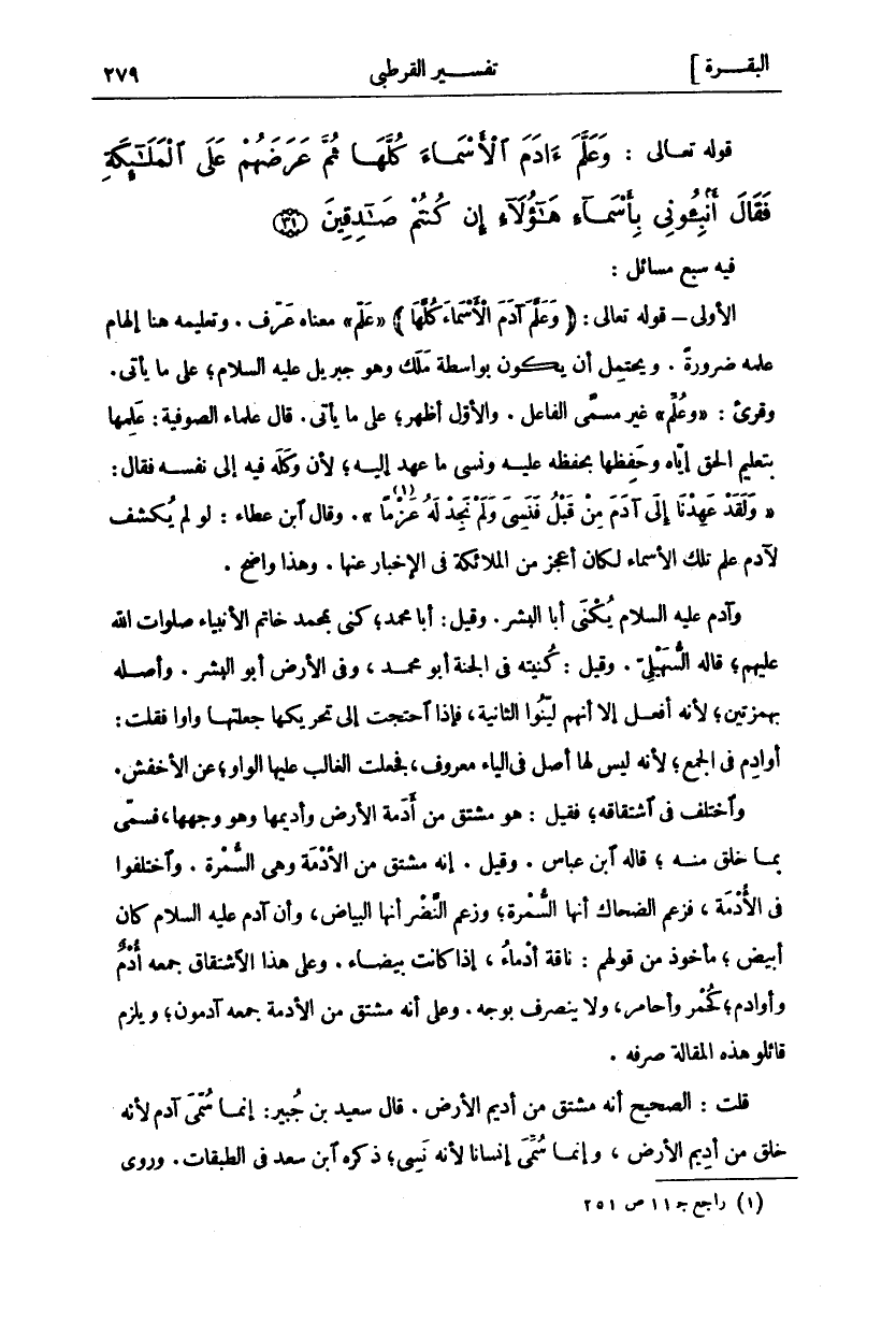 فِيهِ سَبْعُ مَسَائِلَ: الْأُولَى- قَوْلُهُ تَعَالَى: (وَعَلَّمَ آدَمَ الْأَسْماءَ كُلَّها) ... " عَلَّمَ" معناه عَرَّفَ. وَتَعْلِيمُهُ هُنَا إِلْهَامُ عِلْمِهِ ضَرُورَةً. وَيُحْتَمَلُ أَنْ يَكُونَ بِوَاسِطَةِ مَلَكٍ وَهُوَ جِبْرِيلُ عَلَيْهِ السلام على ما يأتي. وقرى:" وَعُلِّمَ" غَيْرَ مُسَمَّى الْفَاعِلِ. وَالْأَوَّلُ أَظْهَرُ، عَلَى مَا يَأْتِي. قَالَ عُلَمَاءُ الصُّوفِيَّةِ: عَلِمَهَا بِتَعْلِيمِ الْحَقِّ إِيَّاهُ وَحَفِظَهَا بِحِفْظِهِ عَلَيْهِ وَنَسِيَ مَا عُهِدَ إِلَيْهِ، لِأَنْ وَكَلَهُ فِيهِ إِلَى نَفْسِهِ فَقَالَ:" وَلَقَدْ عَهِدْنا إِلى آدَمَ مِنْ قَبْلُ فَنَسِيَ وَلَمْ نَجِدْ لَهُ عَزْماً «١» ". [طه: ١١٥]. وَقَالَ ابْنُ عَطَاءٍ: لَوْ لَمْ يَكْشِفْ لِآدَمَ عِلْمَ تِلْكَ الْأَسْمَاءِ لَكَانَ أَعْجَزَ مِنَ الْمَلَائِكَةِ فِي الْإِخْبَارِ عَنْهَا. وَهَذَا وَاضِحٌ. وَآدَمُ عَلَيْهِ السَّلَامُ يُكَنَّى أَبَا الْبَشَرِ. وَقِيلَ: أَبَا مُحَمَّدٍ، كُنِّيَ بِمُحَمَّدٍ خَاتَمِ الْأَنْبِيَاءِ صَلَوَاتُ اللَّهِ عَلَيْهِمْ، قَالَهُ السُّهَيْلِيُّ. وَقِيلَ: كُنْيَتُهُ فِي الْجَنَّةِ أَبُو مُحَمَّدٍ، وَفِي الْأَرْضِ أَبُو الْبَشَرِ. وَأَصْلُهُ بِهَمْزَتَيْنِ، لِأَنَّهُ أَفْعَلُ إِلَّا أَنَّهُمْ لَيَّنُوا الثَّانِيَةَ، فَإِذَا احْتَجْتَ إِلَى تَحْرِيكِهَا جَعَلْتَهَا وَاوًا فَقُلْتَ: أَوَادِمُ فِي الْجَمْعِ لِأَنَّهُ لَيْسَ لَهَا أَصْلٌ فِي الْيَاءِ مَعْرُوفٌ، فَجَعَلْتَ الْغَالِبَ عَلَيْهَا الْوَاوَ، عَنِ الْأَخْفَشِ. وَاخْتُلِفَ فِي اشْتِقَاقِهِ، فَقِيلَ: هُوَ مُشْتَقٌّ مِنْ أَدَمَةِ الْأَرْضِ وَأَدِيمِهَا وَهُوَ وَجْهُهَا، فَسُمِّيَ بِمَا خُلِقَ مِنْهُ، قَالَ ابْنُ عَبَّاسٍ. وَقِيلَ: إِنَّهُ مُشْتَقٌّ مِنَ الْأُدْمَةِ وَهِيَ السُّمْرَةُ. وَاخْتَلَفُوا فِي الْأُدْمَةِ، فَزَعَمَ الضَّحَّاكُ أَنَّهَا السُّمْرَةُ، وَزَعَمَ النَّضْرُ أَنَّهَا الْبَيَاضُ، وَأَنَّ آدَمَ عَلَيْهِ السَّلَامُ كَانَ أَبْيَضَ، مَأْخُوذٌ مِنْ قَوْلِهِمْ: نَاقَةٌ أَدْمَاءُ، إِذَا كَانَتْ بَيْضَاءَ. وَعَلَى هَذَا الِاشْتِقَاقِ جَمْعُهُ أُدْمٌ وَأَوَادِمُ، كَحُمْرٍ وَأَحَامِرَ، وَلَا يَنْصَرِفُ بِوَجْهٍ. وَعَلَى أَنَّهُ مُشْتَقٌّ مِنَ الْأَدَمَةِ جَمْعُهُ آدَمُونَ، وَيَلْزَمُ قَائِلُو هَذِهِ الْمَقَالَةِ صَرْفُهُ. قُلْتُ: الصَّحِيحُ أَنَّهُ مُشْتَقٌّ مِنْ أَدِيمِ الْأَرْضِ. قَالَ سَعِيدُ بْنُ جُبَيْرٍ: إِنَّمَا سُمِّيَ آدَمَ لِأَنَّهُ خُلِقَ مِنْ أَدِيمِ الْأَرْضِ، وَإِنَّمَا سُمِّيَ إِنْسَانًا لِأَنَّهُ نَسِيَ، ذَكَرَهُ ابْنُ سَعْدٍ فِي الطَّبَقَاتِ. وَرَوَى