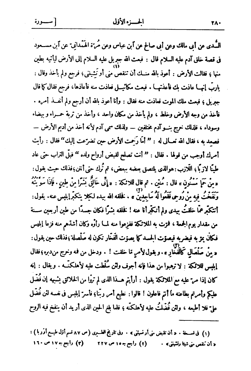 السُّدِّيُّ عَنْ أَبِي مَالِكٍ وَعَنْ أَبِي صَالِحٍ عَنِ ابْنِ عَبَّاسٍ وَعَنْ مُرَّةَ الْهَمْدَانِيِّ عَنِ ابْنِ مَسْعُودٍ فِي قِصَّةِ خَلْقِ آدَمَ عَلَيْهِ السَّلَامُ قَالَ: فَبَعَثَ اللَّهُ جِبْرِيلَ عَلَيْهِ السَّلَامُ إِلَى الْأَرْضِ لِيَأْتِيَهُ بِطِينٍ مِنْهَا، فَقَالَتِ الْأَرْضُ: أَعُوذُ بِاللَّهِ مِنْكَ أَنْ تُنْقِصَ «١» مِنِّي أَوْ تُشِينَنِي، فَرَجَعَ وَلَمْ يَأْخُذْ وَقَالَ: يَا رَبِّ إنها عاذت بك فأعذتها. فبعث مكاييل فَعَاذَتْ مِنْهُ فَأَعَاذَهَا، فَرَجَعَ فَقَالَ كَمَا قَالَ جِبْرِيلُ، فَبَعَثَ مَلَكَ الْمَوْتِ فَعَاذَتْ مِنْهُ فَقَالَ: وَأَنَا أَعُوذُ بِاللَّهِ أَنْ أَرْجِعَ وَلَمْ أُنَفِّذْ أَمْرَهُ. فَأَخَذَ مِنْ وَجْهِ الْأَرْضِ وَخَلَطَ، وَلَمْ يَأْخُذْ مِنْ مَكَانٍ وَاحِدٍ، وَأَخَذَ مِنْ تُرْبَةٍ حَمْرَاءَ وَبَيْضَاءَ وَسَوْدَاءَ، فَلِذَلِكَ خَرَجَ بَنُو آدَمَ مُخْتَلِفِينَ- وَلِذَلِكَ سُمِّيَ آدَمَ لِأَنَّهُ أُخِذَ مِنْ أَدِيمِ الْأَرْضِ- فَصَعَدَ بِهِ، فَقَالَ اللَّهُ تَعَالَى لَهُ: (أَمَا رَحِمْتَ الْأَرْضَ حِينَ تَضَرَّعَتْ إِلَيْكَ) فَقَالَ: رَأَيْتُ أَمْرَكَ أَوْجَبَ مِنْ قَوْلِهَا. فَقَالَ: (أنت تصلح لقبض أرواح ولده) قبل التُّرَابَ حَتَّى عَادَ طِينًا لَازِبًا، اللَّازِبُ: هُوَ الَّذِي يَلْتَصِقُ بَعْضُهُ بِبَعْضٍ، ثُمَّ تُرِكَ حَتَّى أَنْتَنَ، فَذَلِكَ حَيْثُ يَقُولُ:" مِنْ حَمَإٍ مَسْنُونٍ" [الحجر: ٢٦] قَالَ: مُنْتِنٌ. ثُمَّ قَالَ لِلْمَلَائِكَةِ:" إِنِّي خالِقٌ بَشَراً مِنْ طِينٍ. فَإِذا سَوَّيْتُهُ وَنَفَخْتُ فِيهِ مِنْ رُوحِي فَقَعُوا لَهُ ساجِدِينَ «٢» " [ص: ٧٢ - ٧١]. فَخَلَقَهُ اللَّهُ بِيَدِهِ لِكَيْلَا يَتَكَبَّرَ إِبْلِيسُ عَنْهُ. يَقُولُ: أَتَتَكَبَّرُ عَمَّا خَلَقْتُ بِيَدَيَّ وَلَمْ أَتَكَبَّرْ أَنَا عَنْهُ! فَخَلَقَهُ بَشَرًا فَكَانَ جَسَدًا مِنْ طِينٍ أَرْبَعِينَ سَنَةً مِنْ مِقْدَارِ يَوْمِ الْجُمُعَةِ، فَمَرَّتْ بِهِ الْمَلَائِكَةُ فَفَزِعُوا مِنْهُ لَمَّا رَأَوْهُ وَكَانَ أَشَدَّهُمْ مِنْهُ فَزَعًا إِبْلِيسُ فَكَانَ يَمُرُّ بِهِ فَيَضْرِبُهُ فَيُصَوِّتُ الْجَسَدُ كَمَا يُصَوِّتُ الْفَخَّارُ تَكُونُ لَهُ صَلْصَلَةٌ، فَذَلِكَ حِينَ يَقُولُ:" مِنْ صَلْصالٍ كَالْفَخَّارِ «٣» " [الرحمن: ١٤]. وَيَقُولُ لِأَمْرٍ مَا خُلِقْتَ!. وَدَخَلَ مِنْ فَمِهِ وَخَرَجَ مِنْ دُبُرِهِ، فَقَالَ إِبْلِيسُ لِلْمَلَائِكَةِ: لَا ترهبوا من هذا فإنه أجوف ولين سُلِّطْتُ عَلَيْهِ لَأُهْلِكَنَّهُ. وَيُقَالُ: إِنَّهُ كَانَ إِذَا مَرَّ عَلَيْهِ مَعَ الْمَلَائِكَةِ يَقُولُ: أَرَأَيْتُمْ هَذَا الَّذِي لَمْ تَرَوْا مِنَ الْخَلَائِقِ يُشْبِهُهُ إِنْ فُضِّلَ عَلَيْكُمْ وَأُمِرْتُمْ بِطَاعَتِهِ مَا أَنْتُمْ فَاعِلُونَ! قَالُوا: نُطِيعُ أَمْرَ رَبِّنَا فَأَسَرَّ إِبْلِيسُ فِي نفسه لئن فضل علي فلا أطيعه، ولين فُضِّلْتُ عَلَيْهِ لَأُهْلِكَنَّهُ، فَلَمَّا بَلَغَ الْحِينَ الَّذِي أريد أن ينفخ فيه الروح