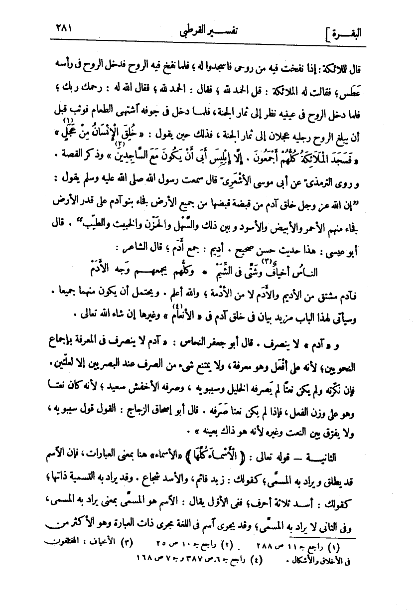 فَآدَمُ مُشْتَقٌّ مِنَ الْأَدِيمِ وَالْأَدَمِ لَا مِنَ الْأُدْمَةِ، وَاللَّهُ أَعْلَمُ. وَيُحْتَمَلُ أَنْ يَكُونَ مِنْهُمَا جَمِيعًا. وَسَيَأْتِي لِهَذَا الْبَابِ مَزِيدُ بَيَانٍ فِي خَلْقِ آدَمَ فِي" الْأَنْعَامِ «٤» " وَغَيْرِهَا إِنْ شَاءَ اللَّهُ تَعَالَى. وَ" آدَمُ" لَا يَنْصَرِفُ. قَالَ أَبُو جَعْفَرٍ النَّحَّاسُ:" آدَمُ لَا يَنْصَرِفُ فِي الْمَعْرِفَةِ بِإِجْمَاعِ النَّحْوِيِّينَ، لِأَنَّهُ عَلَى أَفْعَلَ وَهُوَ مَعْرِفَةٌ، ولا يمتنع شي مِنَ الصَّرْفِ عِنْدَ الْبَصْرِيِّينَ إِلَّا لِعِلَّتَيْنِ. فَإِنْ نَكَّرْتَهُ وَلَمْ يَكُنْ نَعْتًا لَمْ يَصْرِفْهُ الْخَلِيلُ وَسِيبَوَيْهِ، وَصَرَفَهُ الْأَخْفَشُ سَعِيدٌ، لِأَنَّهُ كَانَ نَعْتًا وَهُوَ عَلَى وَزْنِ الْفِعْلِ، فَإِذَا لَمْ يَكُنْ نَعْتًا صَرَفَهُ. قَالَ أَبُو إِسْحَاقَ الزَّجَّاجُ: الْقَوْلُ قَوْلُ سِيبَوَيْهِ، وَلَا يُفَرَّقُ بَيْنَ النَّعْتِ وَغَيْرِهِ لِأَنَّهُ هُوَ ذَاكَ بِعَيْنِهِ". الثَّانِيَةُ- قَوْلُهُ تَعَالَى:" الْأَسْماءَ كُلَّها"" الْأَسْمَاءَ" هُنَا بِمَعْنَى الْعِبَارَاتِ، فَإِنَّ الِاسْمَ قَدْ يُطْلَقُ وَيُرَادُ بِهِ الْمُسَمَّى، كَقَوْلِكَ: زَيْدٌ قَائِمٌ، وَالْأَسَدُ شُجَاعٌ. وَقَدْ يُرَادُ بِهِ التَّسْمِيَةُ ذَاتُهَا، كَقَوْلِكَ: أَسَدٌ ثَلَاثَةُ أَحْرُفٍ، فَفِي الْأَوَّلِ يُقَالُ: الِاسْمُ هُوَ الْمُسَمَّى بِمَعْنَى يُرَادُ به المسمى، وفي الثاني لا يراد به الْمُسَمَّى، وَقَدْ يَجْرِي اسْمٌ فِي اللُّغَةِ مَجْرَى ذات العبارة وهو الأكثر من