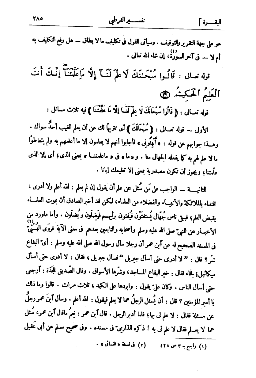 قَوْلُهُ تَعَالَى: (قالُوا سُبْحانَكَ لَا عِلْمَ لَنا إِلَّا مَا عَلَّمْتَنا) فِيهِ ثَلَاثُ مَسَائِلَ: الْأُولَى: قَوْلُهُ تَعَالَى:" سُبْحانَكَ" أَيْ تَنْزِيهًا لَكَ عَنْ أَنْ يَعْلَمَ الْغَيْبَ أَحَدٌ سِوَاكَ. وَهَذَا جَوَابُهُمْ عَنْ قَوْلِهِ:" أَنْبِئُونِي" فَأَجَابُوا أَنَّهُمْ لَا يَعْلَمُونَ إِلَّا مَا أَعْلَمَهُمْ بِهِ وَلَمْ يَتَعَاطَوْا مَا لَا عِلْمَ لهم به كما يفعله الجهال منا. و" ما" فِي" مَا عَلَّمْتَنا" بِمَعْنَى الَّذِي، أَيْ إِلَّا الَّذِي عَلَّمْتَنَا، وَيَجُوزُ أَنْ تَكُونَ مَصْدَرِيَّةً بِمَعْنَى إِلَّا تَعْلِيمَكَ إِيَّانَا. الثَّانِيَةُ- الْوَاجِبُ عَلَى مَنْ سُئِلَ عَنْ عِلْمٍ أَنْ يَقُولَ إِنْ لَمْ يَعْلَمْ: اللَّهُ أَعْلَمُ وَلَا أَدْرِي، اقْتِدَاءً بِالْمَلَائِكَةِ وَالْأَنْبِيَاءِ وَالْفُضَلَاءِ مِنَ الْعُلَمَاءِ، لَكِنْ قَدْ أَخْبَرَ الصَّادِقُ أَنَّ بِمَوْتِ الْعُلَمَاءِ يُقْبَضُ الْعِلْمُ، فَيَبْقَى نَاسٌ جُهَّالٌ يُسْتَفْتُونَ فَيُفْتُونَ بِرَأْيِهِمْ فَيَضِلُّونَ وَيُضِلُّونَ. وَأَمَّا مَا وَرَدَ مِنَ الْأَخْبَارِ عَنِ النَّبِيِّ صَلَّى اللَّهُ عَلَيْهِ وَسَلَّمَ وَأَصْحَابِهِ وَالتَّابِعِينَ بَعْدَهُمْ فِي مَعْنَى الْآيَةِ فَرَوَى الْبُسْتِيُّ «٢» فِي الْمُسْنَدِ الصَّحِيحِ لَهُ عَنِ ابْنِ عُمَرَ أَنَّ رَجُلًا سَأَلَ رَسُولَ اللَّهِ صَلَّى اللَّهُ عَلَيْهِ وَسَلَّمَ: أَيُّ الْبِقَاعِ شَرٌّ؟ قَالَ: (لَا أَدْرِي حَتَّى أَسْأَلَ جِبْرِيلَ) فَسَأَلَ جِبْرِيلَ، فَقَالَ: لَا أَدْرِي حَتَّى أَسْأَلَ مِيكَائِيلَ، فَجَاءَ فَقَالَ: خَيْرُ الْبِقَاعِ الْمَسَاجِدُ، وَشَرُّهَا الْأَسْوَاقُ. وَقَالَ الصِّدِّيقُ لِلْجَدَّةِ: ارْجِعِي حَتَّى أَسْأَلَ النَّاسَ. وَكَانَ عَلِيٌّ يَقُولُ: وَابَرْدَهَا عَلَى الْكَبِدِ، ثَلَاثَ مَرَّاتً. قَالُوا وَمَا ذَلِكَ يَا أَمِيرَ الْمُؤْمِنِينَ؟ قَالَ: أَنْ يُسْأَلَ الرَّجُلُ عَمَّا لَا يَعْلَمُ فَيَقُولُ: اللَّهُ أَعْلَمُ. وَسَأَلَ ابْنَ عُمَرَ رَجُلٌ عَنْ مَسْأَلَةٍ فَقَالَ: لَا عِلْمَ لِي بِهَا، فَلَمَّا أَدْبَرَ الرَّجُلُ. قَالَ ابْنُ عُمَرَ: نِعْمَ مَا قَالَ ابْنُ عُمَرَ، سُئِلَ عَمَّا لَا يَعْلَمُ فَقَالَ لَا عِلْمَ لِي بِهِ! ذَكَرَهُ الدَّارِمِيُّ فِي مُسْنَدِهِ. وَفِي صحيح مسلم عن أبي عقيل