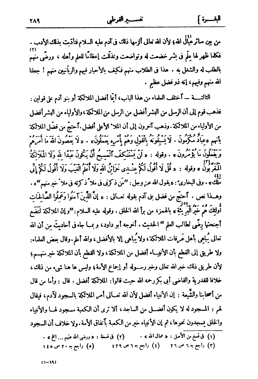 «٣» " [النساء: ١٧٢] وَقَوْلَهُ:" قُلْ لَا أَقُولُ لَكُمْ عِنْدِي خَزائِنُ اللَّهِ وَلا أَعْلَمُ الْغَيْبَ وَلا أَقُولُ لَكُمْ إِنِّي مَلَكٌ «٤» " [الانعام: ٥٠]. وَفِي الْبُخَارِيِّ: (يَقُولُ اللَّهُ عَزَّ وَجَلَّ:" مَنْ ذَكَرَنِي فِي مَلَأٍ ذَكَرْتُهُ فِي مَلَأٍ خَيْرٍ مِنْهُمْ). وَهَذَا نَصٌّ. احْتَجَّ مَنْ فَضَّلَ بَنِي آدَمَ بِقَوْلِهِ تَعَالَى:" إِنَّ الَّذِينَ آمَنُوا وَعَمِلُوا الصَّالِحَاتِ أُولَئِكَ هُمْ خير البريئة «٥» " [البينة: ٧] بِالْهَمْزِ، مِنْ بَرَأَ اللَّهُ الْخَلْقَ. وَقَوْلُهُ عَلَيْهِ السلام: (وإن الملائكة لتضع أجنحتها رضي لِطَالِبِ الْعِلْمِ) الْحَدِيثَ. أَخْرَجَهُ أَبُو دَاوُدَ، وَبِمَا جَاءَ فِي أَحَادِيثَ مِنْ أَنَّ اللَّهَ تَعَالَى يُبَاهِي بِأَهْلِ عَرَفَاتَ الْمَلَائِكَةَ، وَلَا يُبَاهِي إِلَّا بِالْأَفْضَلِ، وَاللَّهُ أَعْلَمُ. وَقَالَ بَعْضُ الْعُلَمَاءِ: وَلَا طَرِيقَ إِلَى الْقَطْعِ بِأَنَّ الْأَنْبِيَاءَ أَفْضَلُ مِنَ الْمَلَائِكَةِ، وَلَا الْقَطْعُ بِأَنَّ الْمَلَائِكَةَ خَيْرٌ مِنْهُمْ، لِأَنَّ طَرِيقَ ذَلِكَ خَبَرُ اللَّهِ تَعَالَى وَخَبَرُ رسوله أو إجماع الامة، وليس ها هنا شي مِنْ ذَلِكَ، خِلَافًا لِلْقَدَرِيَّةِ وَالْقَاضِي أَبِي بَكْرٍ رَحِمَهُ اللَّهُ حَيْثُ قَالُوا: الْمَلَائِكَةُ أَفْضَلُ. قَالَ: وَأَمَّا مَنْ قَالَ مِنْ أَصْحَابِنَا وَالشِّيعَةِ: إِنَّ الْأَنْبِيَاءَ أَفْضَلُ لِأَنَّ اللَّهَ تَعَالَى أَمَرَ الْمَلَائِكَةَ بِالسُّجُودِ لِآدَمَ، فَيُقَالُ لَهُمْ: الْمَسْجُودُ لَهُ لَا يَكُونُ أَفْضَلَ مِنَ السَّاجِدِ، أَلَا تَرَى أَنَّ الْكَعْبَةَ مَسْجُودٌ لَهَا وَالْأَنْبِيَاءُ وَالْخَلْقُ يَسْجُدُونَ نَحْوَهَا، ثُمَّ إِنَّ الْأَنْبِيَاءَ خَيْرٌ مِنْ الْكَعْبَةِ بِاتِّفَاقِ الامة. ولا خلاف أن السجود