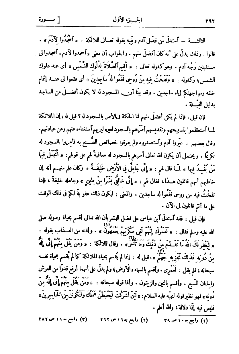 الثَّالِثَةُ- اِسْتَدَلَّ مَنْ فَضَّلَ آدَمَ وَبَنِيهِ بِقَوْلِهِ تَعَالَى لِلْمَلَائِكَةِ:" اسْجُدُوا لِآدَمَ". قَالُوا: وَذَلِكَ يَدُلُّ عَلَى أَنَّهُ كَانَ أَفْضَلَ مِنْهُمْ. وَالْجَوَابُ أَنَّ مَعْنَى" اسْجُدُوا لِآدَمَ" اسْجُدُوا لِي مُسْتَقْبِلِينَ وَجْهَ آدَمَ. وَهُوَ كَقَوْلِهِ تَعَالَى:" أَقِمِ الصَّلاةَ لِدُلُوكِ الشَّمْسِ" [الاسراء: ٧٨] أَيْ عِنْدَ دُلُوكِ الشَّمْسِ وَكَقَوْلِهِ:" وَنَفَخْتُ فِيهِ مِنْ رُوحِي فَقَعُوا لَهُ ساجِدِينَ" [ص: ٧٢] أَيْ فَقَعُوا لِي عِنْدَ إِتْمَامِ خَلْقِهِ وَمُوَاجَهَتِكُمْ إِيَّاهُ سَاجِدِينَ. وَقَدْ بَيَّنَّا أَنَّ الْمَسْجُودَ لَهُ لَا يَكُونُ أَفْضَلَ مِنَ السَّاجِدِ بِدَلِيلِ الْقِبْلَةِ. فَإِنْ قِيلَ: فَإِذَا لَمْ يَكُنْ أَفْضَلَ مِنْهُمْ فَمَا الْحِكْمَةُ فِي الْأَمْرِ بِالسُّجُودِ لَهُ؟ قِيلَ لَهُ: إِنَّ الْمَلَائِكَةَ لَمَّا اسْتَعْظَمُوا بِتَسْبِيحِهِمْ وَتَقْدِيسِهِمْ أَمَرَهُمْ بِالسُّجُودِ لِغَيْرِهِ لِيُرِيَهُمُ اسْتِغْنَاءَهُ عَنْهُمْ وَعَنْ عِبَادَتِهِمْ. وَقَالَ بَعْضُهُمْ: عَيَّرُوا آدَمَ وَاسْتَصْغَرُوهُ وَلَمْ يَعْرِفُوا خَصَائِصَ الصُّنْعِ بِهِ فَأُمِرُوا بِالسُّجُودِ لَهُ تَكْرِيمًا. وَيُحْتَمَلُ أَنْ يَكُونَ اللَّهُ تَعَالَى أَمَرَهُمْ بِالسُّجُودِ لَهُ مُعَاقَبَةً لَهُمْ عَلَى قَوْلِهِمْ:" أَتَجْعَلُ فِيها مَنْ يُفْسِدُ فِيها" لَمَّا قَالَ لَهُمْ:" إِنِّي جاعِلٌ فِي الْأَرْضِ خَلِيفَةً" [البقرة: ٣٠] وَكَانَ عَلِمَ مِنْهُمْ أَنَّهُ إِنْ خَاطَبَهُمْ أَنَّهُمْ قَائِلُونَ هَذَا، فَقَالَ لَهُمْ:" إِنِّي خالِقٌ بَشَراً مِنْ طِينٍ" [ص: ٧١] وَجَاعِلُهُ خَلِيفَةً، فَإِذَا نَفَخْتُ فِيهِ مِنْ رُوحِي فَقَعُوا لَهُ سَاجِدِينَ. وَالْمَعْنَى: لِيَكُونَ ذَلِكَ عُقُوبَةً لَكُمْ فِي ذَلِكَ الْوَقْتِ عَلَى مَا أَنْتُمْ قَائِلُونَ لِي الْآنَ. فَإِنْ قِيلَ: فَقَدِ اسْتَدَلَّ ابْنُ عَبَّاسٍ عَلَى فَضْلِ الْبَشَرِ بِأَنَّ اللَّهَ تَعَالَى أَقْسَمَ بِحَيَاةِ رَسُولِهِ صَلَّى اللَّهُ عَلَيْهِ وَسَلَّمَ فَقَالَ:" لَعَمْرُكَ إِنَّهُمْ لَفِي سَكْرَتِهِمْ يَعْمَهُونَ «١» " [الحجر: ٧٢]. وَأَمَّنَهُ مِنَ الْعَذَابِ بِقَوْلِهِ:" لِيَغْفِرَ لَكَ اللَّهُ مَا تَقَدَّمَ مِنْ ذَنْبِكَ وَما تَأَخَّرَ «٢» " [الفتح: ٢]. وَقَالَ لِلْمَلَائِكَةِ:" وَمَنْ يَقُلْ مِنْهُمْ إِنِّي إِلهٌ مِنْ دُونِهِ فَذلِكَ نَجْزِيهِ جَهَنَّمَ «٣» " [الأنبياء: ٢٩]. قِيلَ لَهُ: إِنَّمَا لَمْ يُقْسِمْ بِحَيَاةِ الْمَلَائِكَةِ كَمَا لَمْ يُقْسِمْ بِحَيَاةِ نَفْسِهِ سُبْحَانَهُ، فَلَمْ يَقُلْ: لَعَمْرِي. وَأَقْسَمَ بِالسَّمَاءِ وَالْأَرْضِ، وَلَمْ يَدُلَّ عَلَى أَنَّهُمَا أَرْفَعُ قَدْرًا مِنَ الْعَرْشِ وَالْجِنَانِ السبع. وأقسم بالتين والزيتون. وأما قول سُبْحَانَهُ:" وَمَنْ يَقُلْ مِنْهُمْ إِنِّي إِلهٌ مِنْ دُونِهِ" [الأنبياء: ٢٩] فَهُوَ نَظِيرُ قَوْلِهِ لِنَبِيِّهِ عَلَيْهِ السَّلَامُ:" لَئِنْ أَشْرَكْتَ لَيَحْبَطَنَّ عَمَلُكَ وَلَتَكُونَنَّ مِنَ الْخاسِرِينَ" [الزمر: ٦٥] فليس فيه إذا دلالة، والله أعلم.