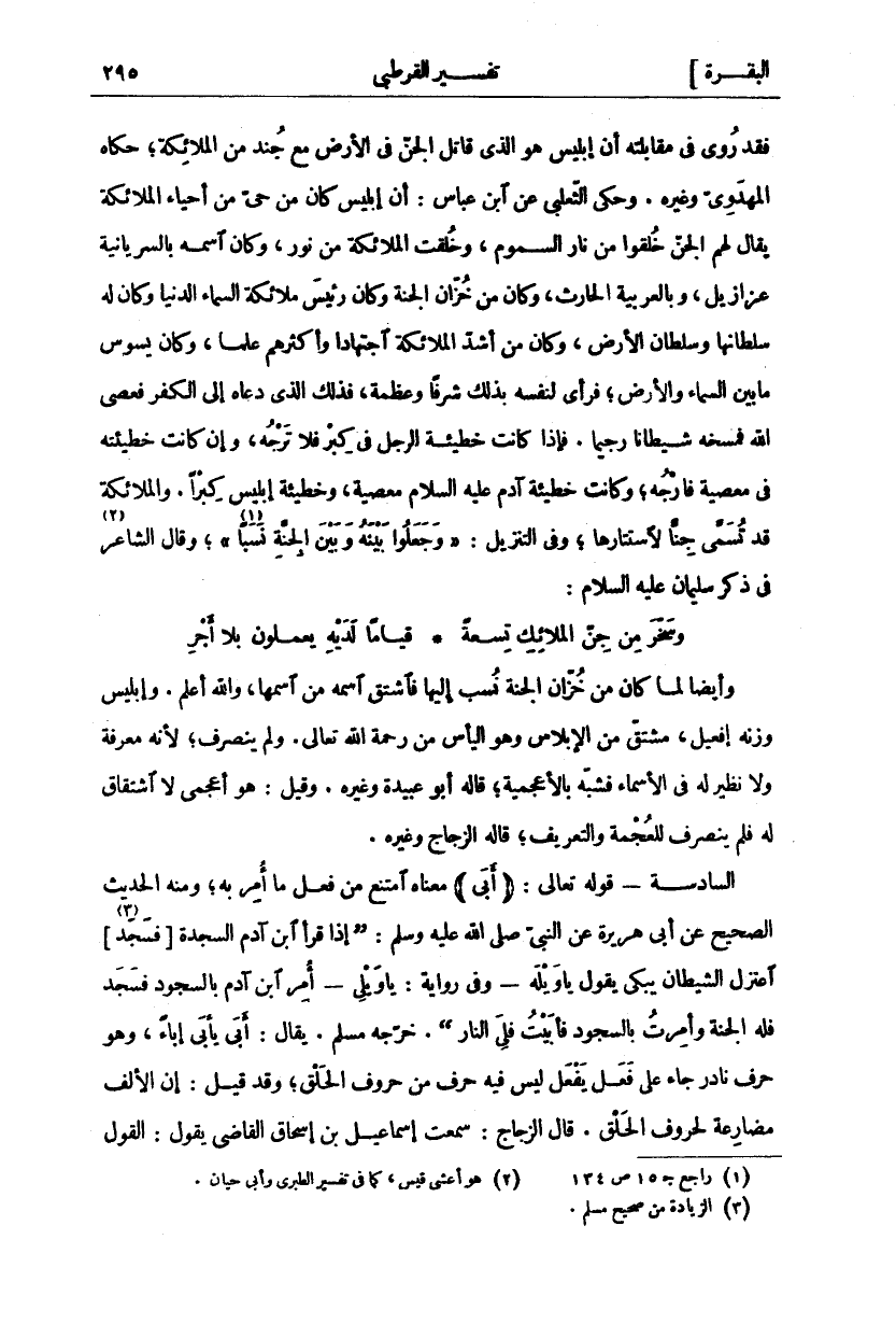 وَأَيْضًا لَمَّا كَانَ مِنْ خُزَّانِ الْجَنَّةِ نُسِبَ إِلَيْهَا فَاشْتُقَّ اسْمُهُ مِنَ اسْمِهَا، وَاللَّهُ أَعْلَمُ. وَإِبْلِيسُ وَزْنُهُ إِفْعِيلٌ، مُشْتَقٌّ مِنَ الْإِبْلَاسِ وَهُوَ الْيَأْسُ مِنْ رَحْمَةِ اللَّهِ تَعَالَى. وَلَمْ يَنْصَرِفْ، لِأَنَّهُ مَعْرِفَةٌ وَلَا نَظِيرَ له في الأسماء فشبه بالأعجمية، قاله أَبُو عُبَيْدَةَ وَغَيْرُهُ. وَقِيلَ: هُوَ أَعْجَمِيٌّ لَا اشْتِقَاقَ لَهُ فَلَمْ يَنْصَرِفْ لِلْعُجْمَةِ وَالتَّعْرِيفِ، قَالَهُ الزَّجَّاجُ وَغَيْرُهُ. السَّادِسَةُ- قَوْلُهُ تَعَالَى: (أَبى) مَعْنَاهُ امْتَنَعَ مِنْ فِعْلِ مَا أُمِرَ بِهِ، وَمِنْهُ الْحَدِيثُ الصَّحِيحُ عَنْ أَبِي هُرَيْرَةَ عَنِ النَّبِيِّ صَلَّى اللَّهُ عَلَيْهِ وَسَلَّمَ: (إِذَا قَرَأَ ابْنُ آدَمَ السَّجْدَةَ [فَسَجَدَ «٣»] اعْتَزَلَ الشَّيْطَانُ يَبْكِي يَقُولُ يَا وَيْلَهُ- وفي رواية: يَا وَيْلِي- أُمِرَ ابْنُ آدَمَ بِالسُّجُودِ فَسَجَدَ فَلَهُ الْجَنَّةُ وَأُمِرْتُ بِالسُّجُودِ فَأَبَيْتُ فَلِي النَّارُ). خَرَّجَهُ مُسْلِمٌ. يُقَالُ: أَبَى يَأْبَى إِبَاءً، وَهُوَ حَرْفٌ نَادِرٌ جَاءَ عَلَى فَعَلَ يَفْعَلُ لَيْسَ فِيهِ حَرْفٌ مِنْ حُرُوفِ الْحَلْقِ، وَقَدْ قِيلَ: إِنَّ الْأَلِفَ مُضَارِعَةٌ لِحُرُوفِ الْحَلْقِ. قَالَ الزَّجَّاجُ: سَمِعْتُ إِسْمَاعِيلَ بْنَ إِسْحَاقَ الْقَاضِيَ يَقُولُ: الْقَوْلُ